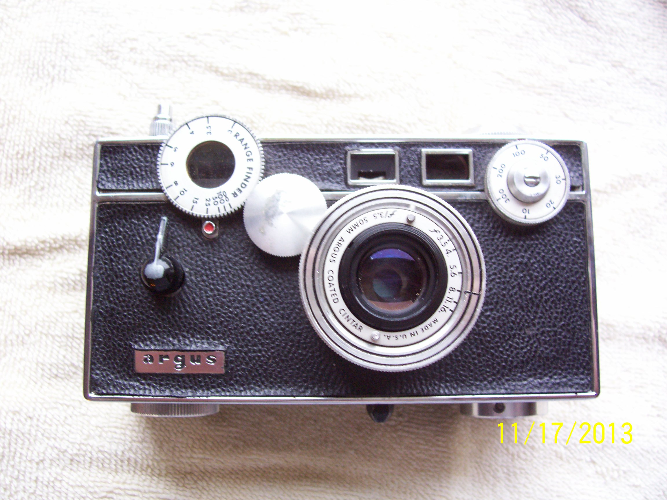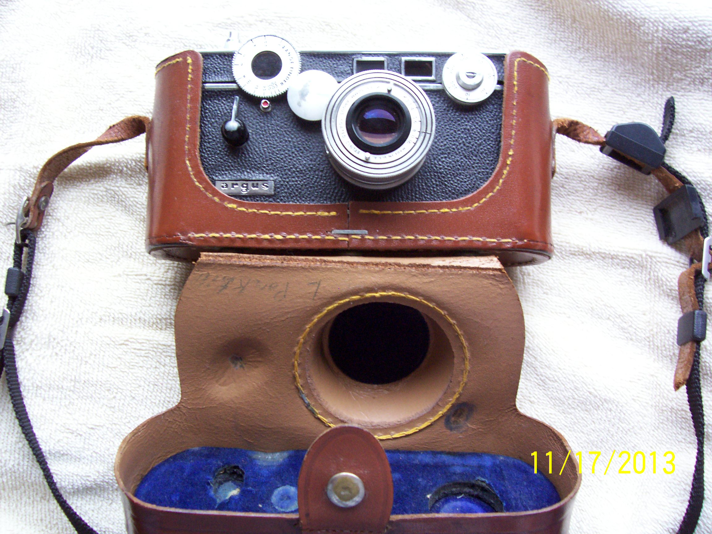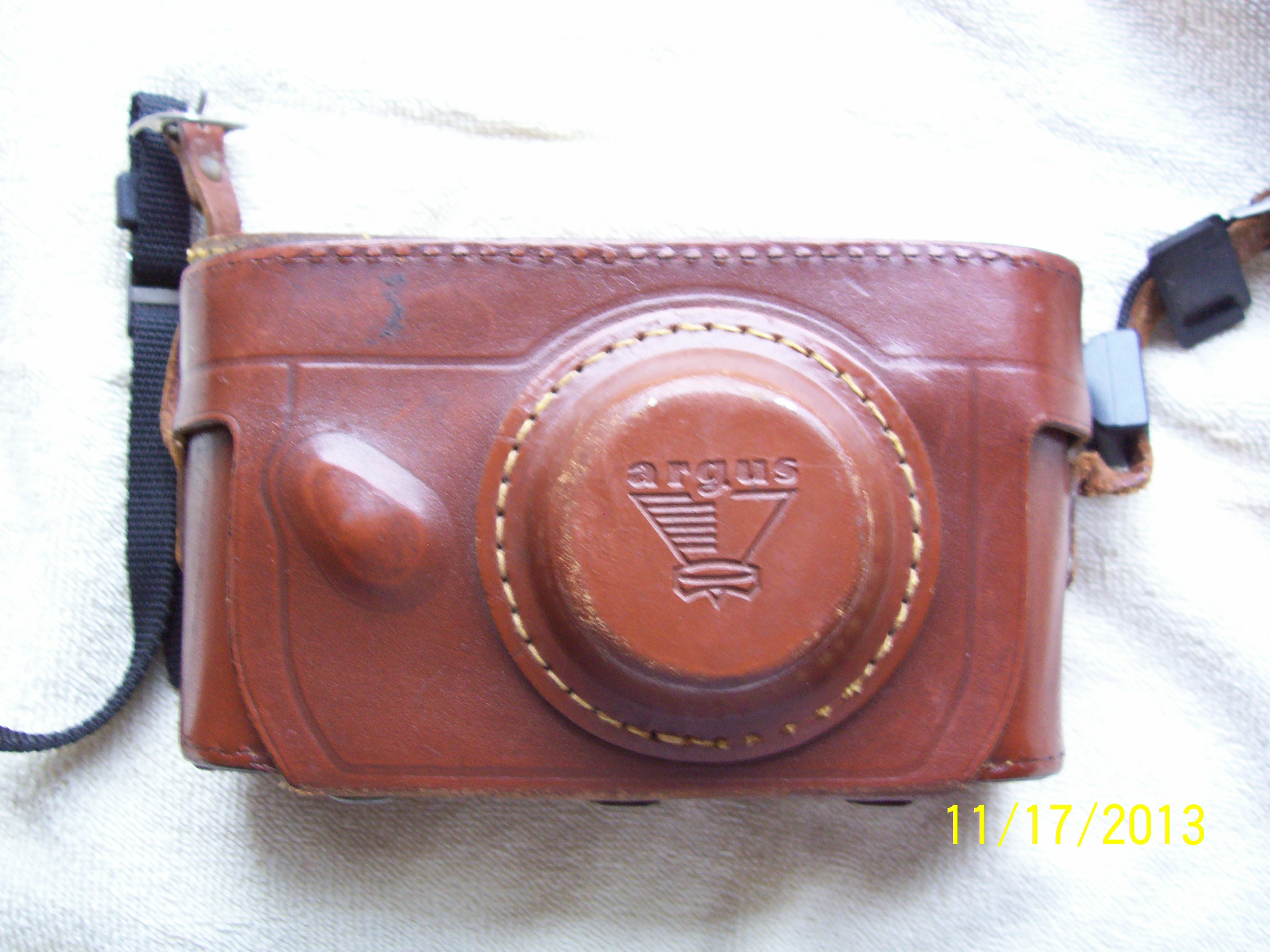 Argus 35mm camera - engraved # on camera chasis is 759840. #'s inside of camera body are uspat 2298107 & uspat 2298787. # ink stamped on inside of door is 44. Was not used much. I'de say it's in good condition. Haven't tried it. The case is in decent condition also. The bottom piece comes out because the stitching that holds it to the sides has rotted. It's made out of leather. Otherwise there are no rips, holes or stains. Needs some cleaning up.