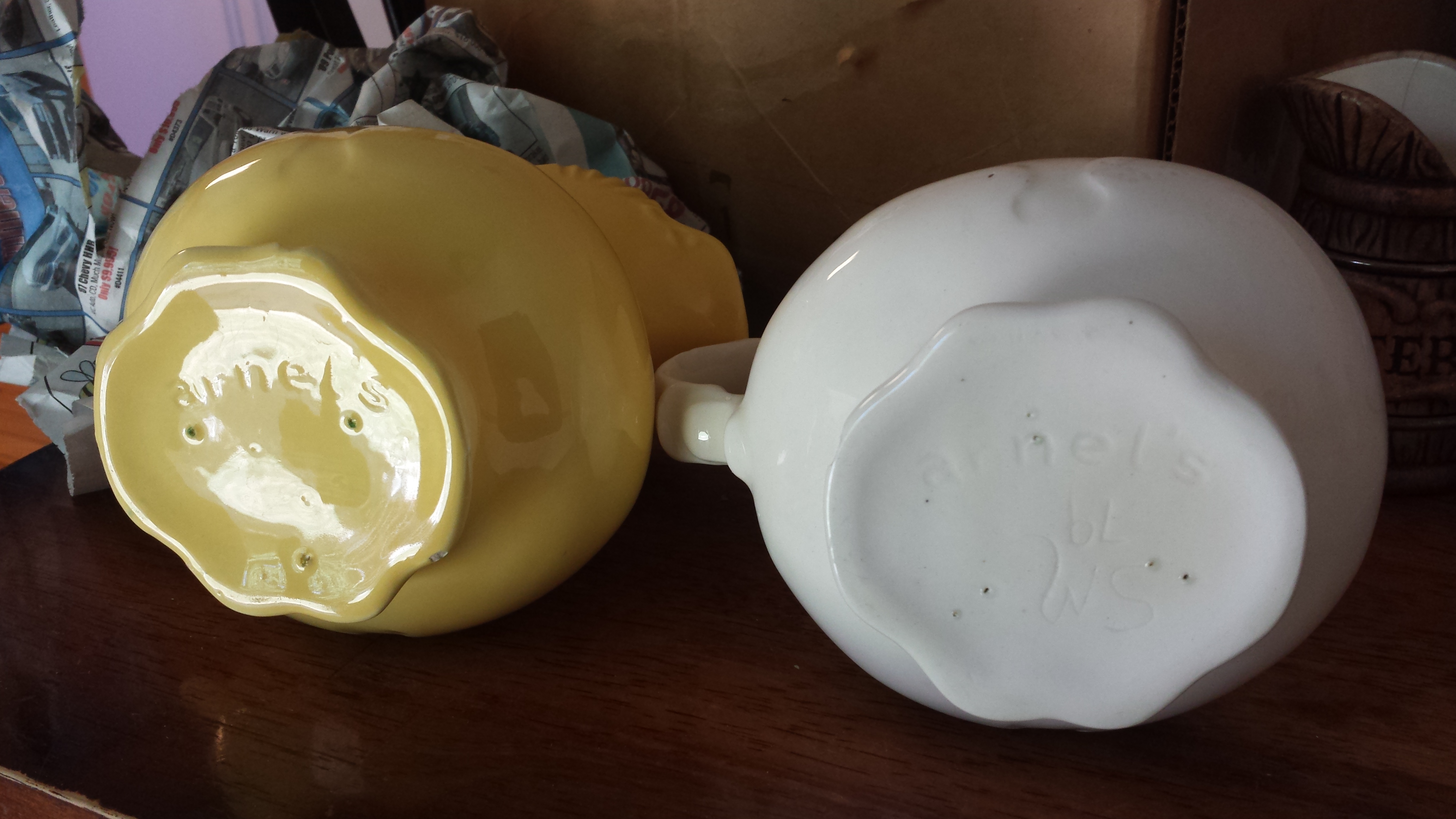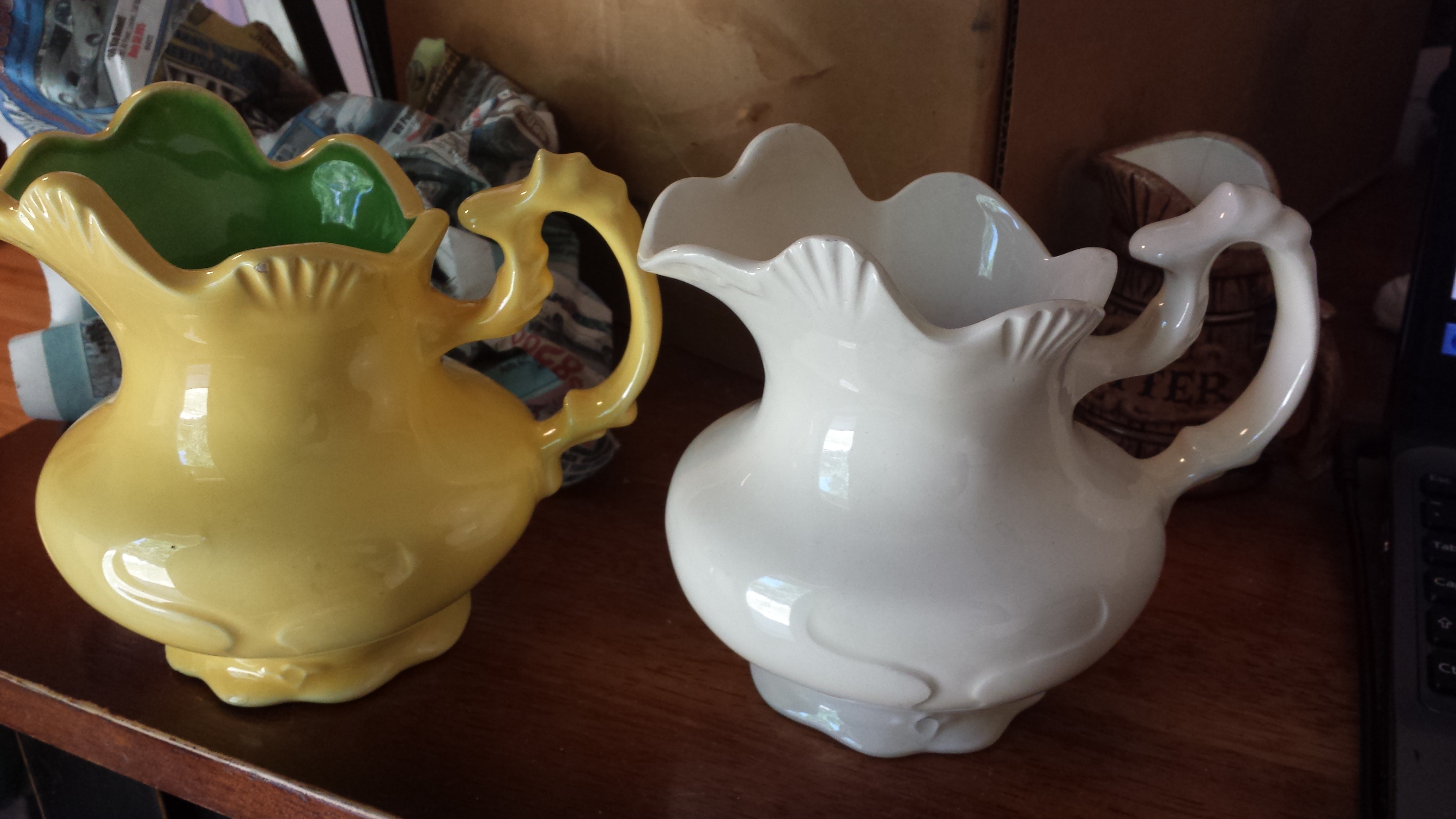 We have been going through my mother's and grandmother's stuff and found these 2 pitchers. I have looked online but cannot find a picture or description of these exact pitchers. The yellow pitcher with green on the inside has the year 77 printed on it (I think). The white one has SM 79 printed on the bottom. Any information or guidance would be appreciated.