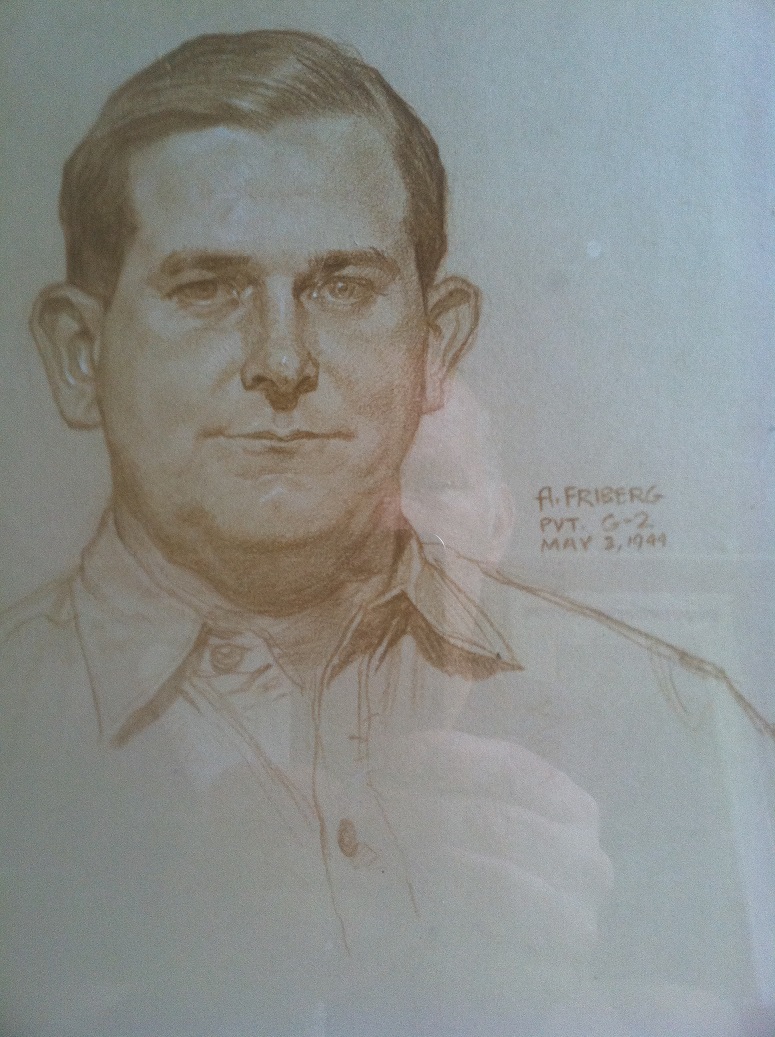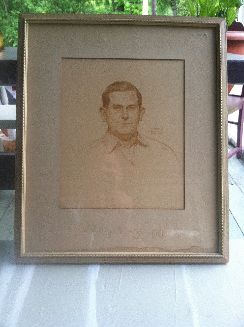 This is the sketch of an unnamed man, probably a soldier, and is signed and dated by A. Friberg, Pvt., G-2, May 3, 1944. The sketch is matted, framed, and has the sticker of "Favor, Ruhl, and Co." from Chicago. I'm not sure if they framed the sketch or is just where the frame was purchased...