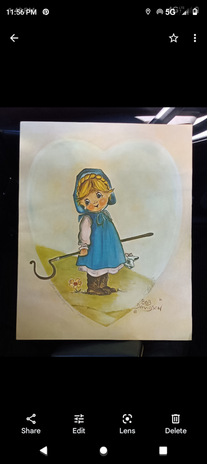 Description: This charming artwork features a young child in a blue dress holding a stick, accompanied by a small animal. The piece is signed by the artist, Bob Davidson, along with the year '82. The painting is executed in a vibrant color palette, showcasing Davidson's signature style of playful and whimsical subjects.