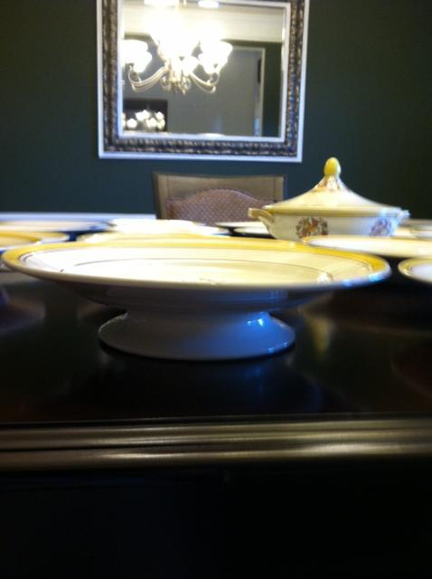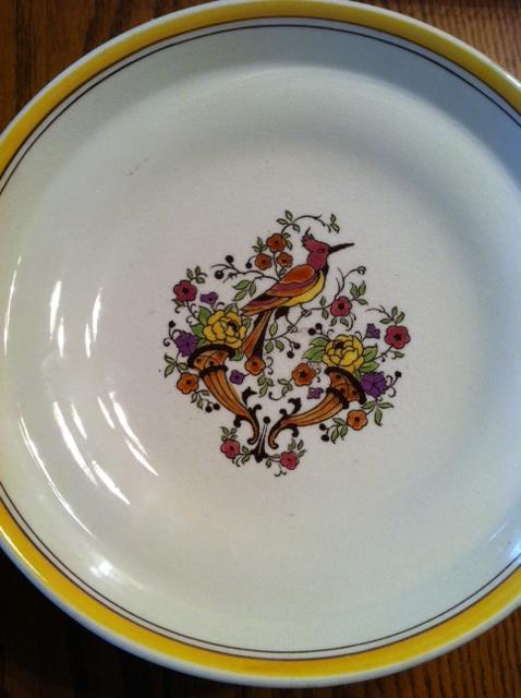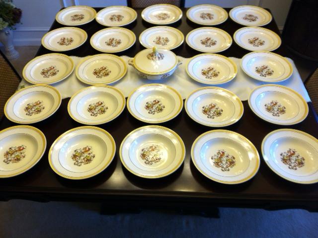 I just got these from an auction and am wondering about their approximate value for resale. They're not chipped and I have not been able to locate this set. The mark on the fruit bowl is purple while all other marks are brown. A few pieces show crackling. The pattern is D 1094. I have 12 dinner plates, 12 soup bowls, 1 tazza, 1 footed fruit bowl, and 1 covered serving dish. Any insight into these pieces is much appreciated. The design is a bird on two cornucopias, and the each piece is enameled. The imprinted letter marks vary, but most have a K over an X next to an S and an 8. They may be artist's initials and a series number. Any information on this set is appreciated. The entire set has been cleaned thoroughly. | |