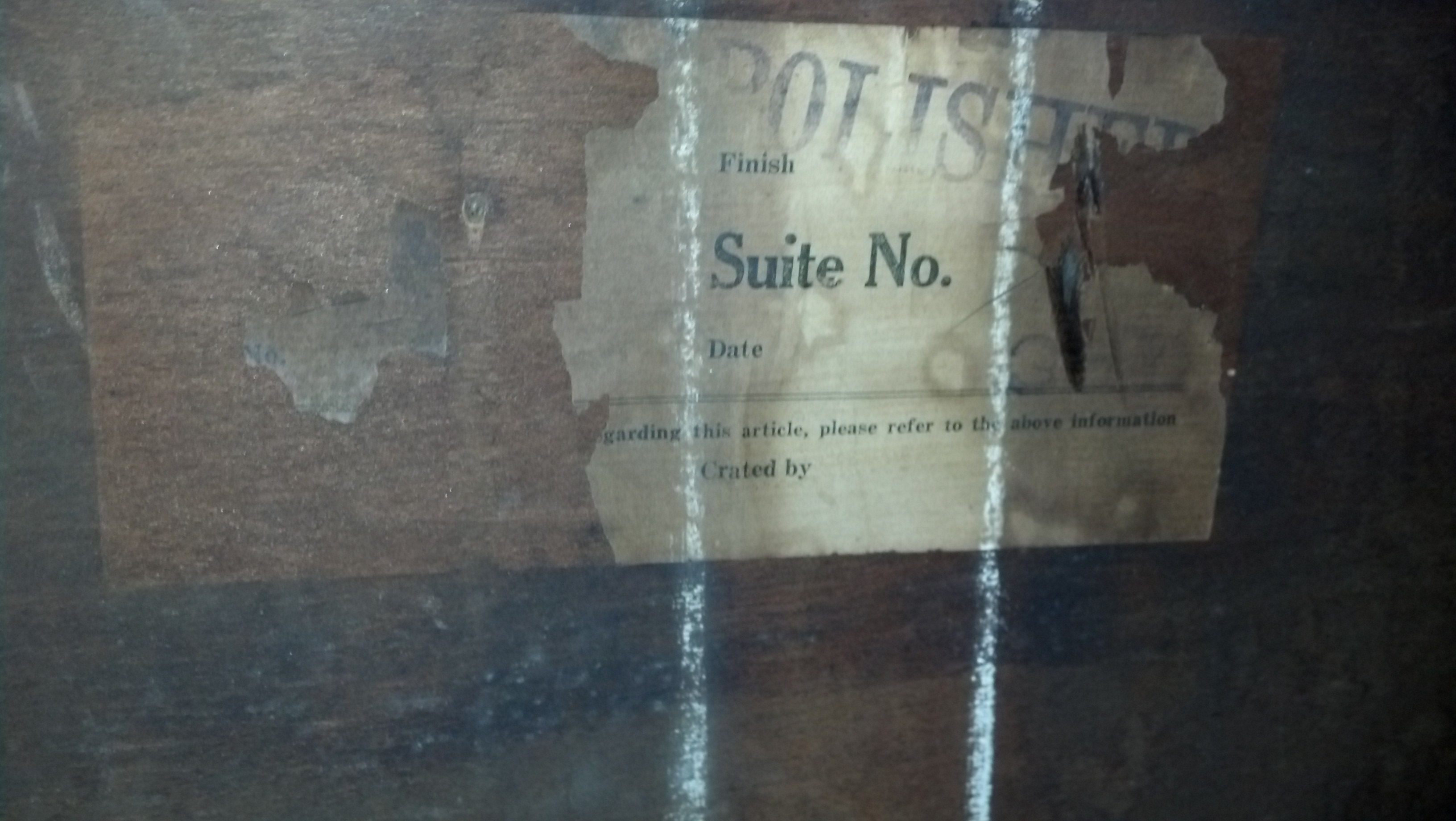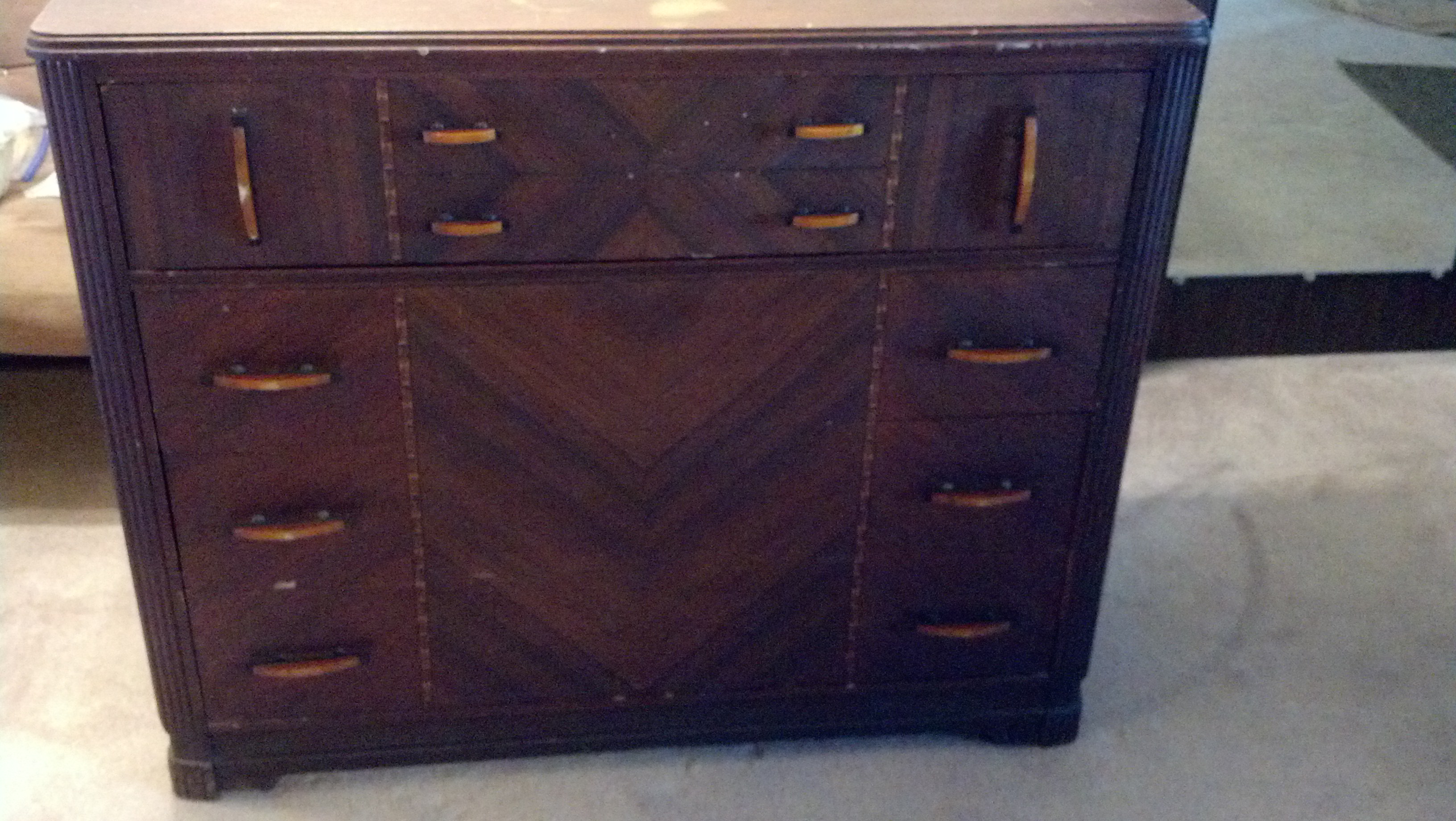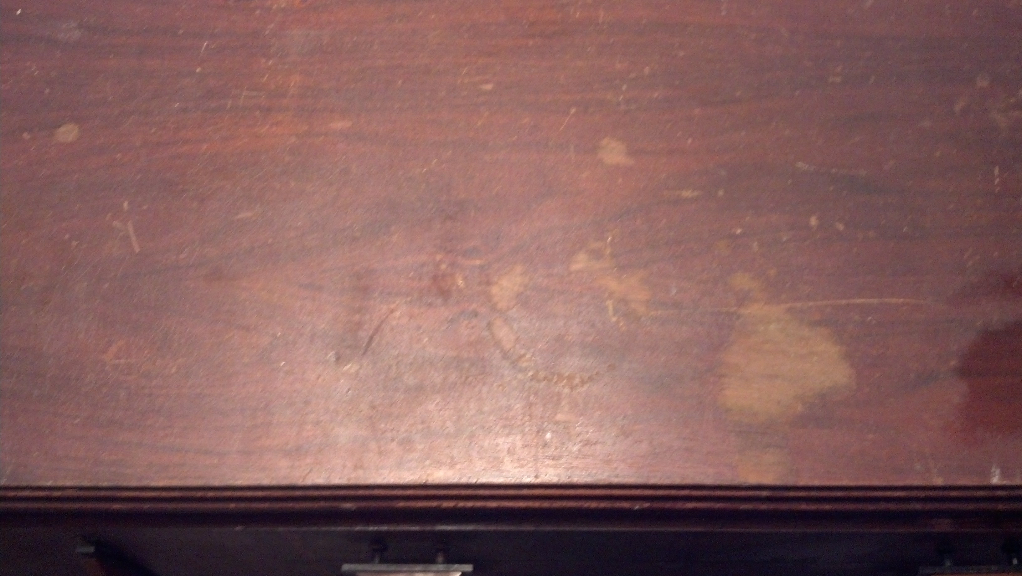 The top is not veneered, and needs refinished. One picture shows a gouge in veneer in top drawer, and not shown is another small piece missng on another drawer.