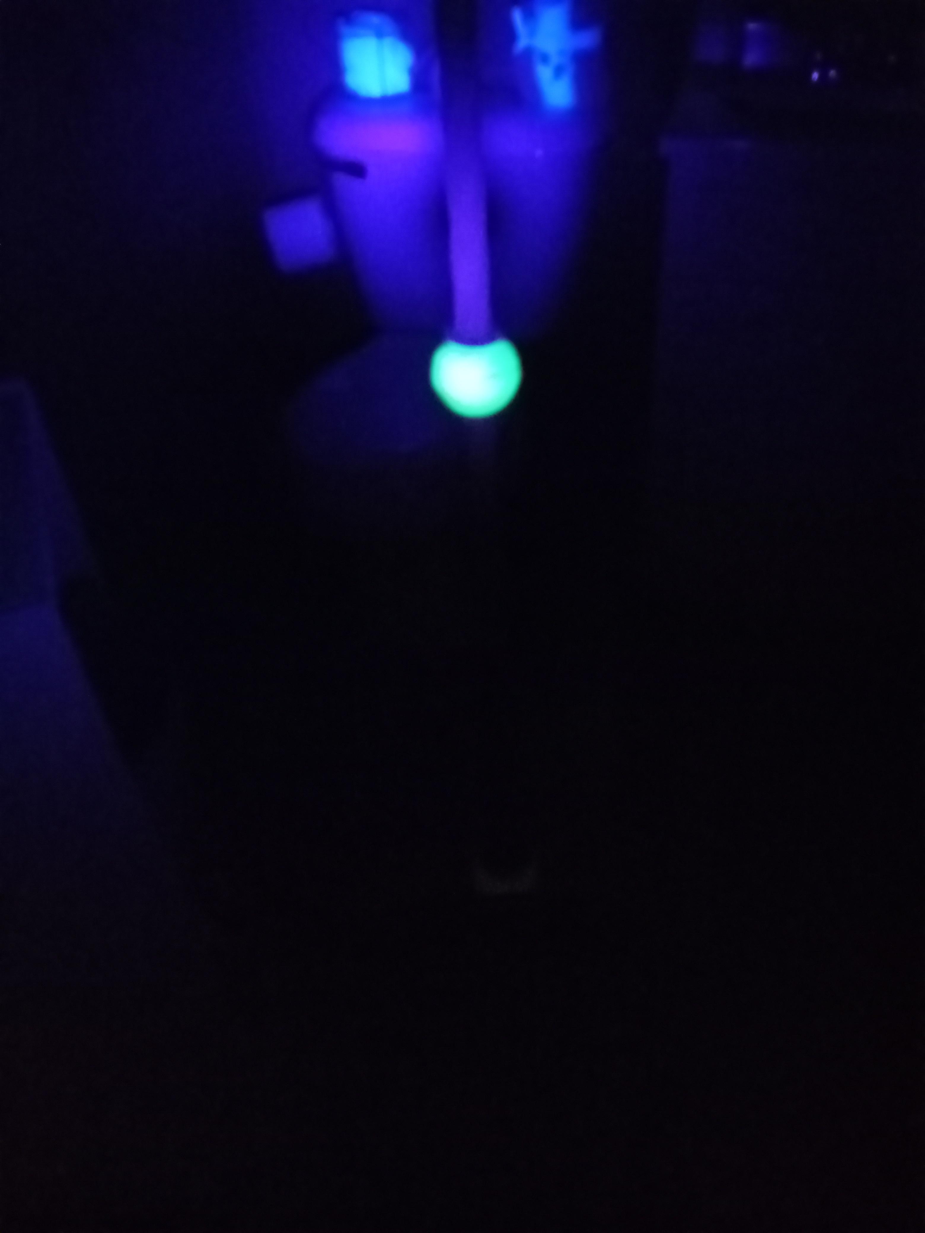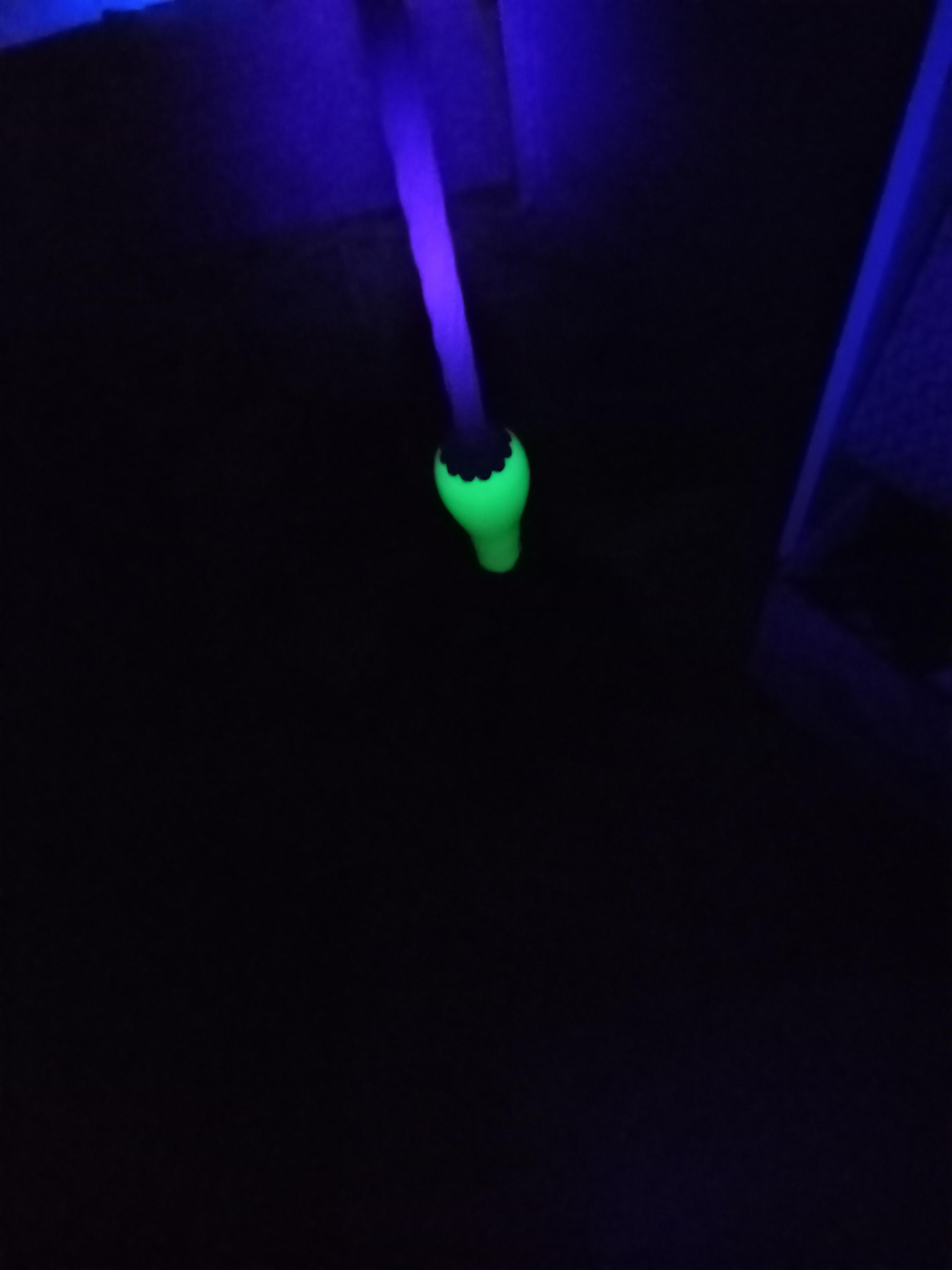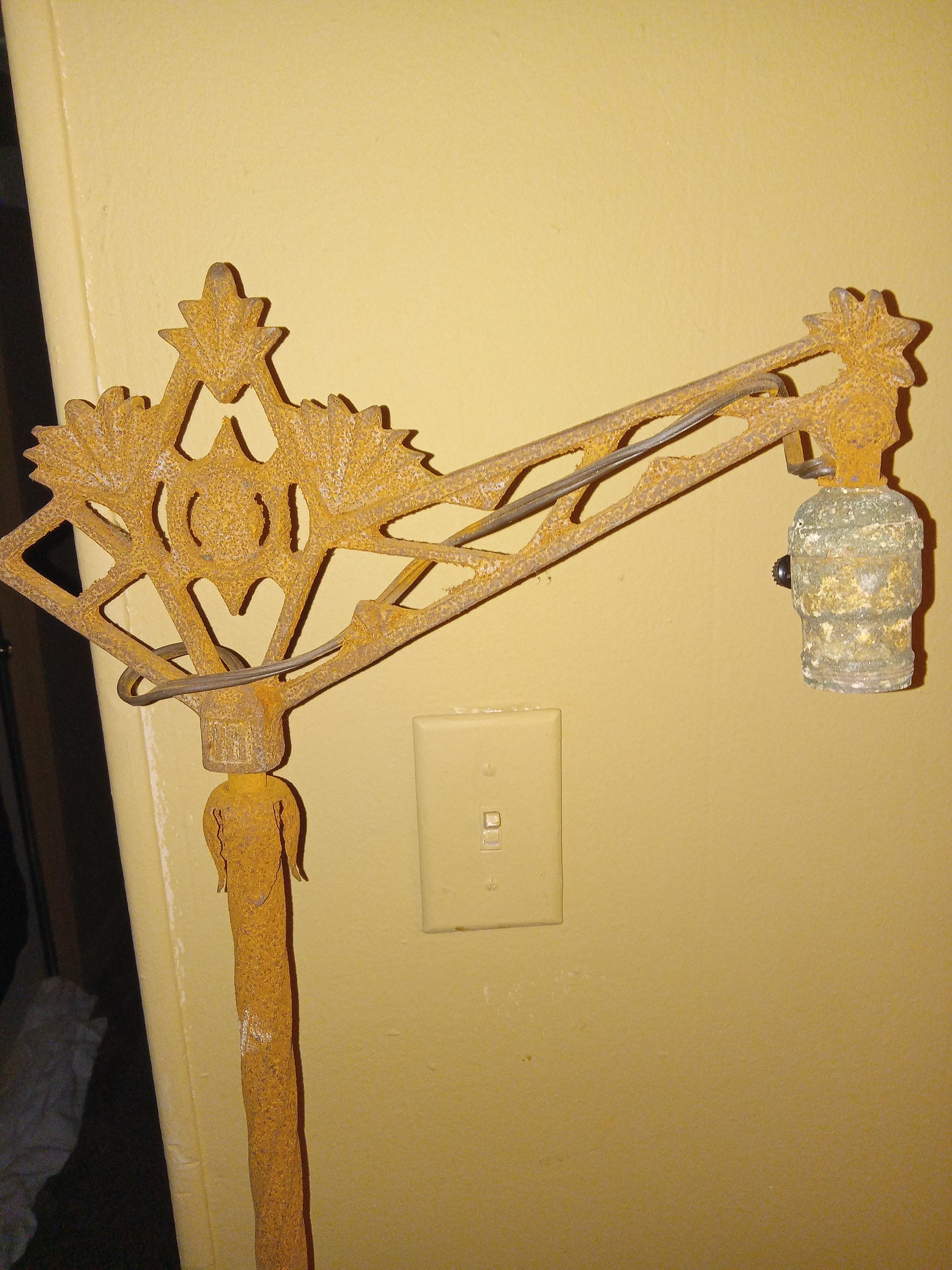 This lamp is 59" tall and I believe it is made of cast iron with jadeite inserts that glow under black light.