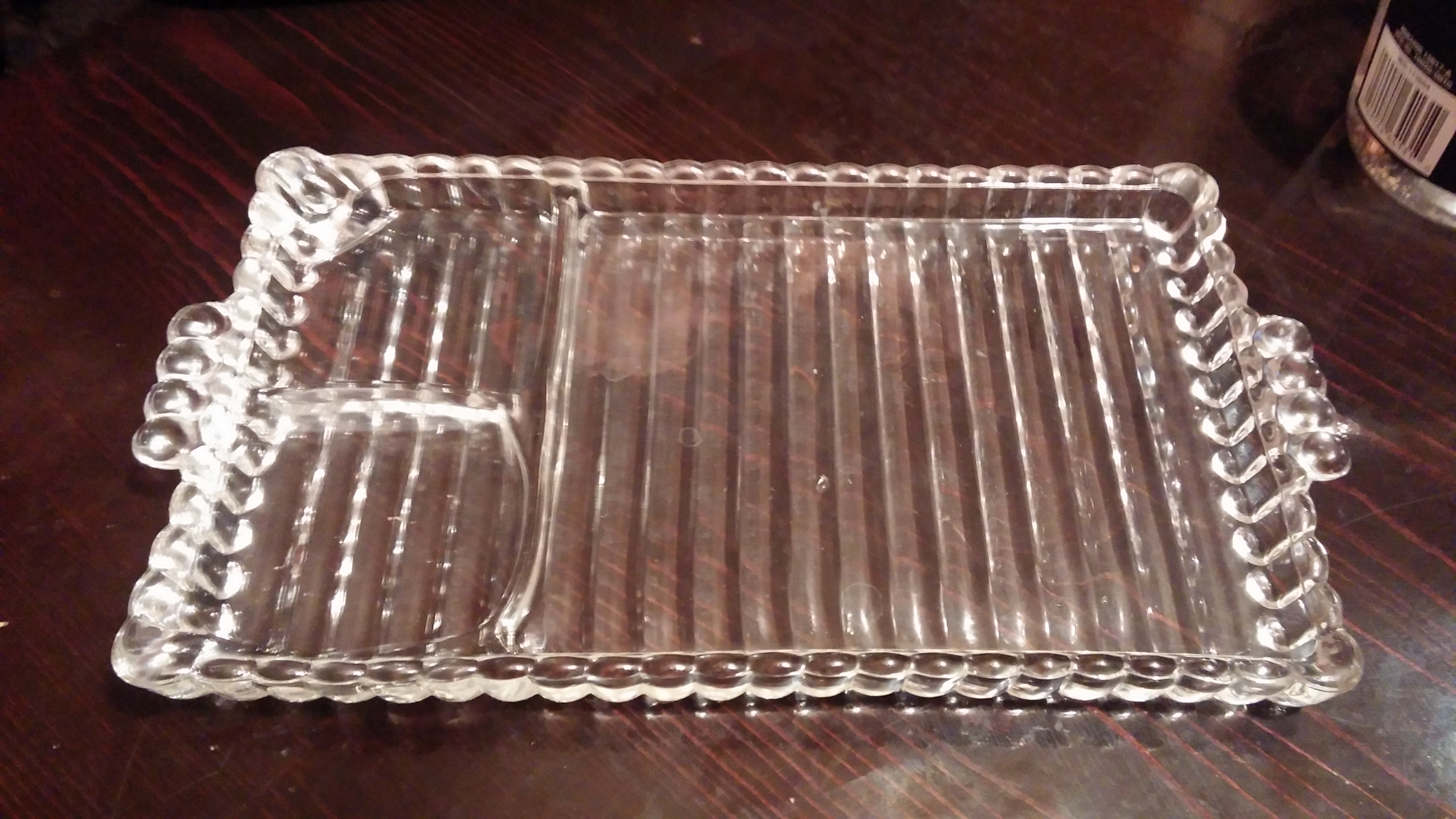 I think that what you have is a luncheon tray (also known as sip and smoke trays)-you placed a small, matching glass cup in one of the smaller compartments, your cigarette in the other and your snacks in the large area.