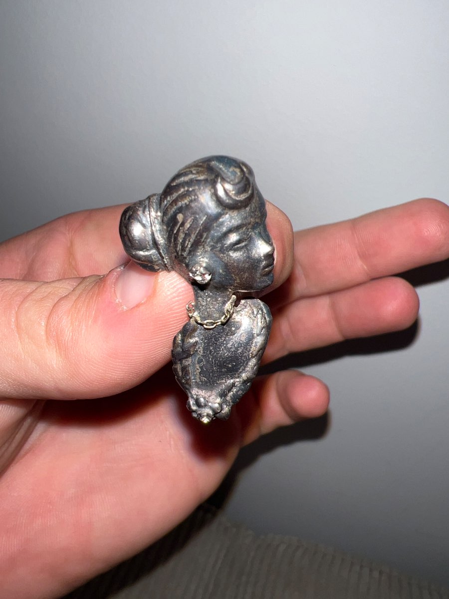 Physical Description: This brooch features a stylized female head with intricate detailing, showcasing Art Deco design elements. The piece is made of silver, likely sterling, and measures approximately 2.5 inches in height and 1.5 inches in width. The back of the brooch has a pin mechanism for attachment, typical of vintage brooches.