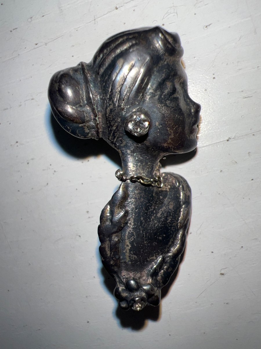 Physical Description: This brooch features a stylized profile of a woman, likely from the Art Deco period, characterized by its elegant lines and intricate detailing. The brooch is made of silver, with a polished finish that highlights the design. It measures approximately 2.5 inches in height and 1 inch in width. The piece is adorned with a small, clear rhinestone at the ear, adding a touch of sparkle. The back of the brooch has a standard pin clasp for secure attachment.