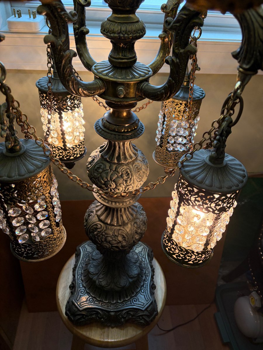 The lamp appears complete, with all four arms and shades intact. Missing components could significantly affect value, especially if they are difficult to replace.