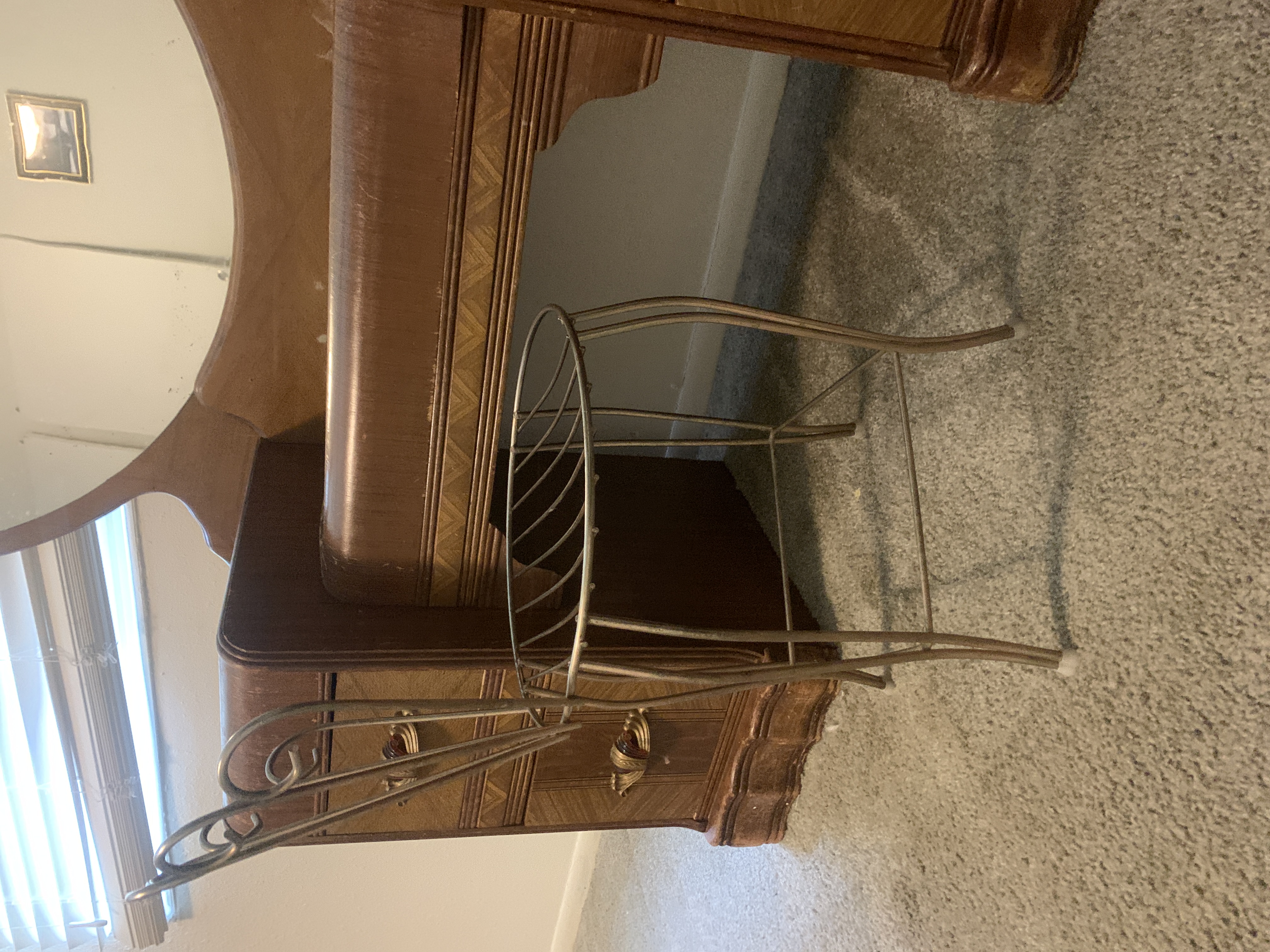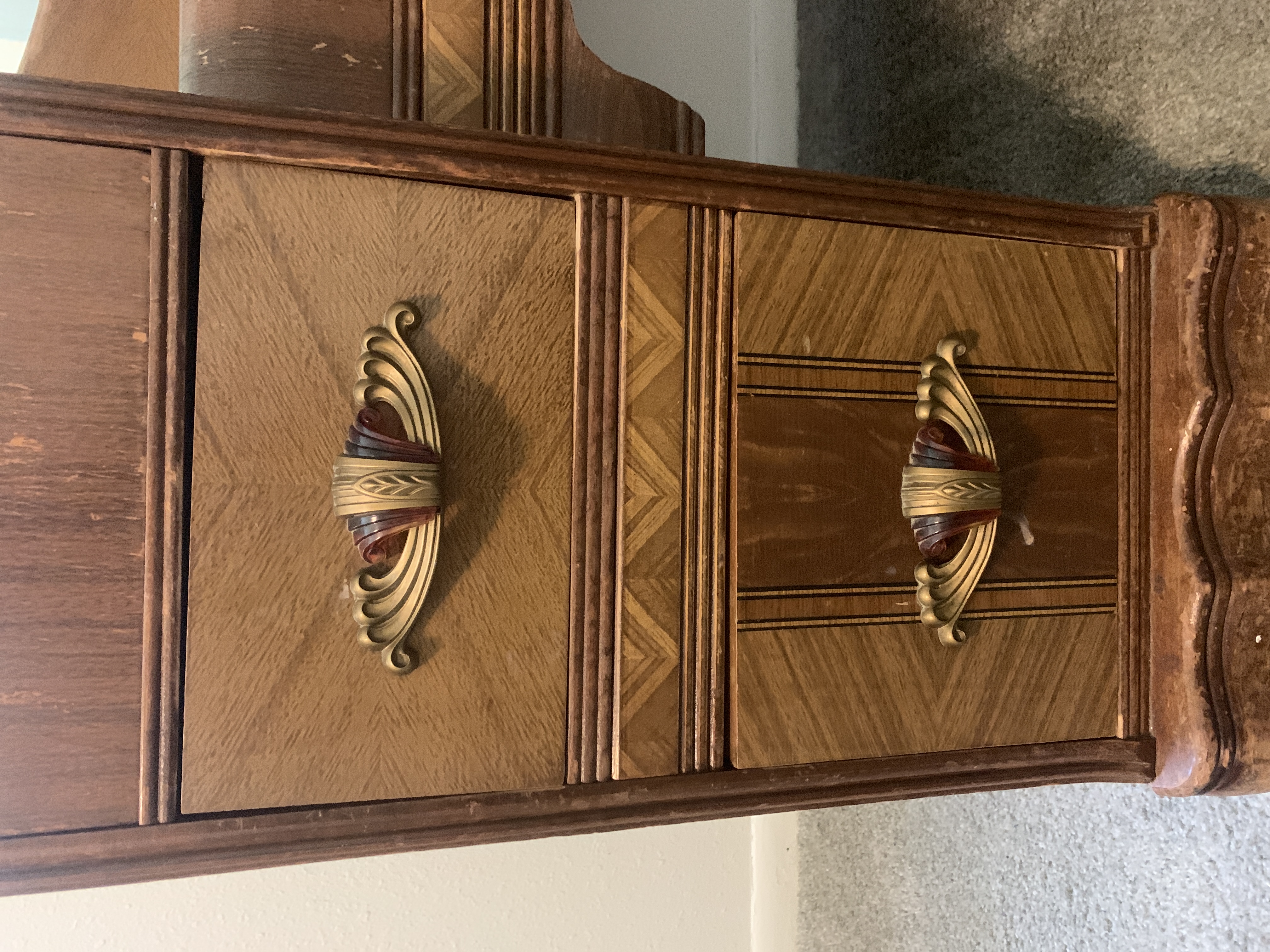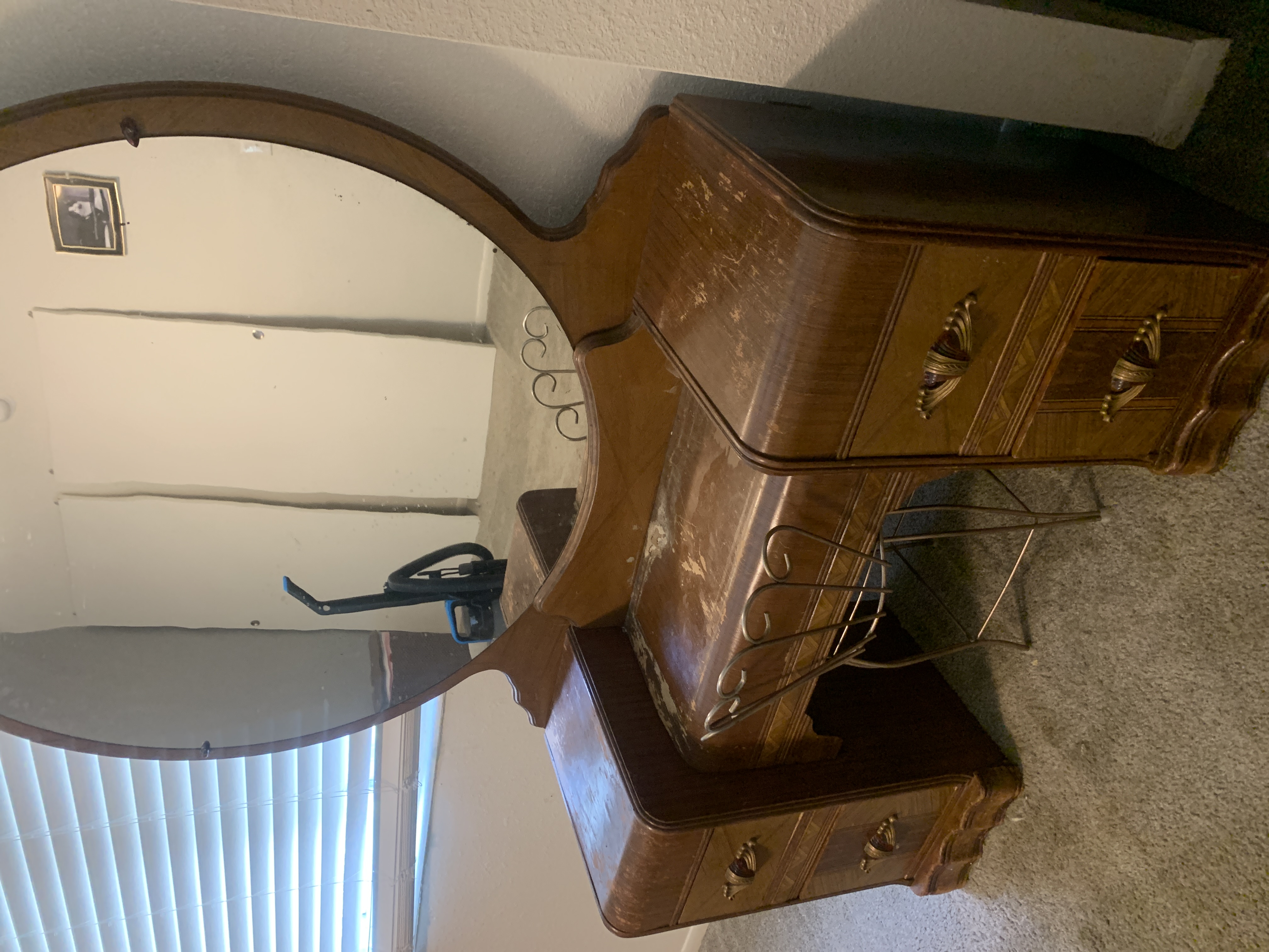 Three piece art deco set. Comes with vanity, stool, and dresser. Minor water damage and wear to the top of the vanity. I am needing an aprasial on this piece.