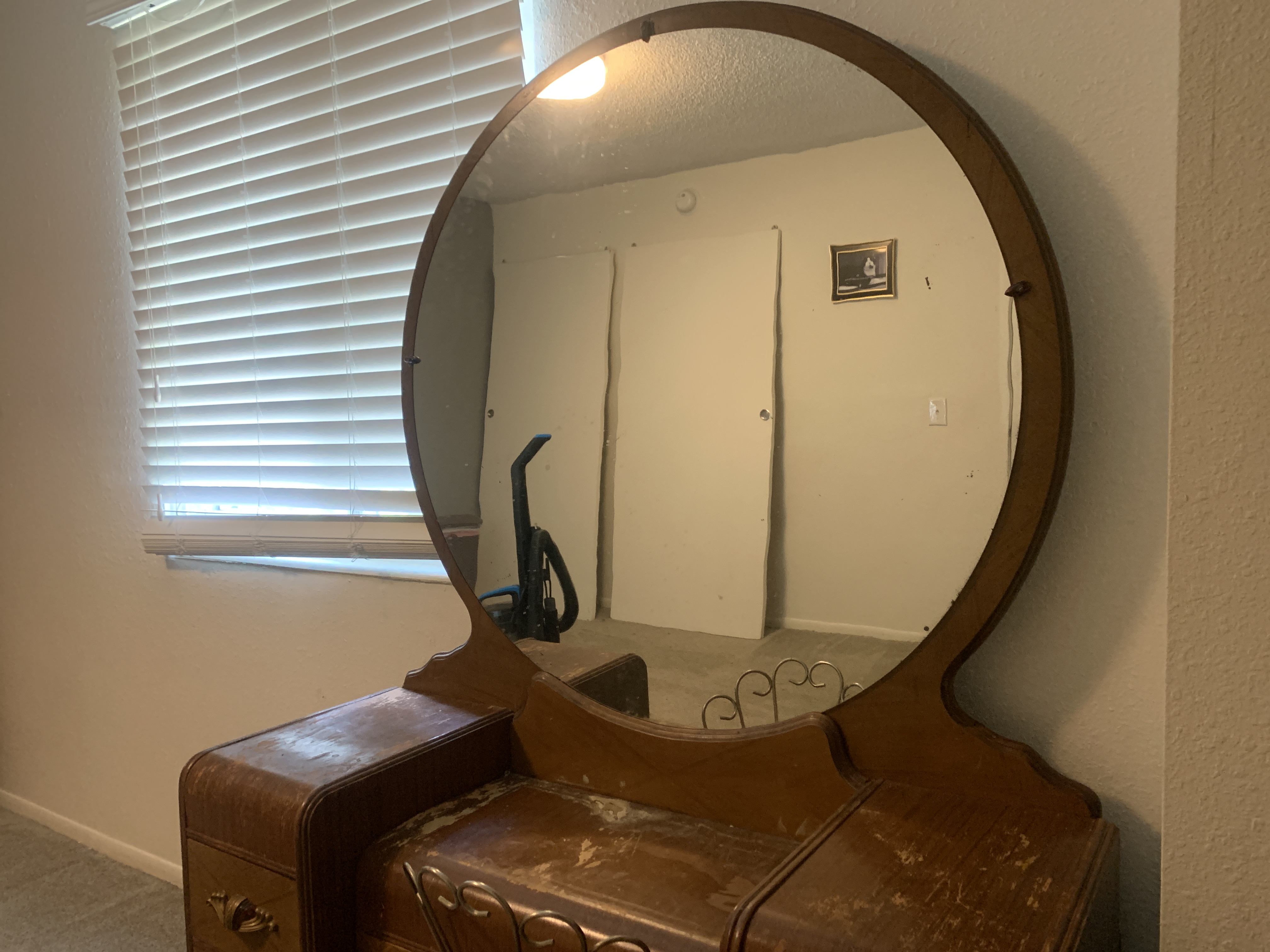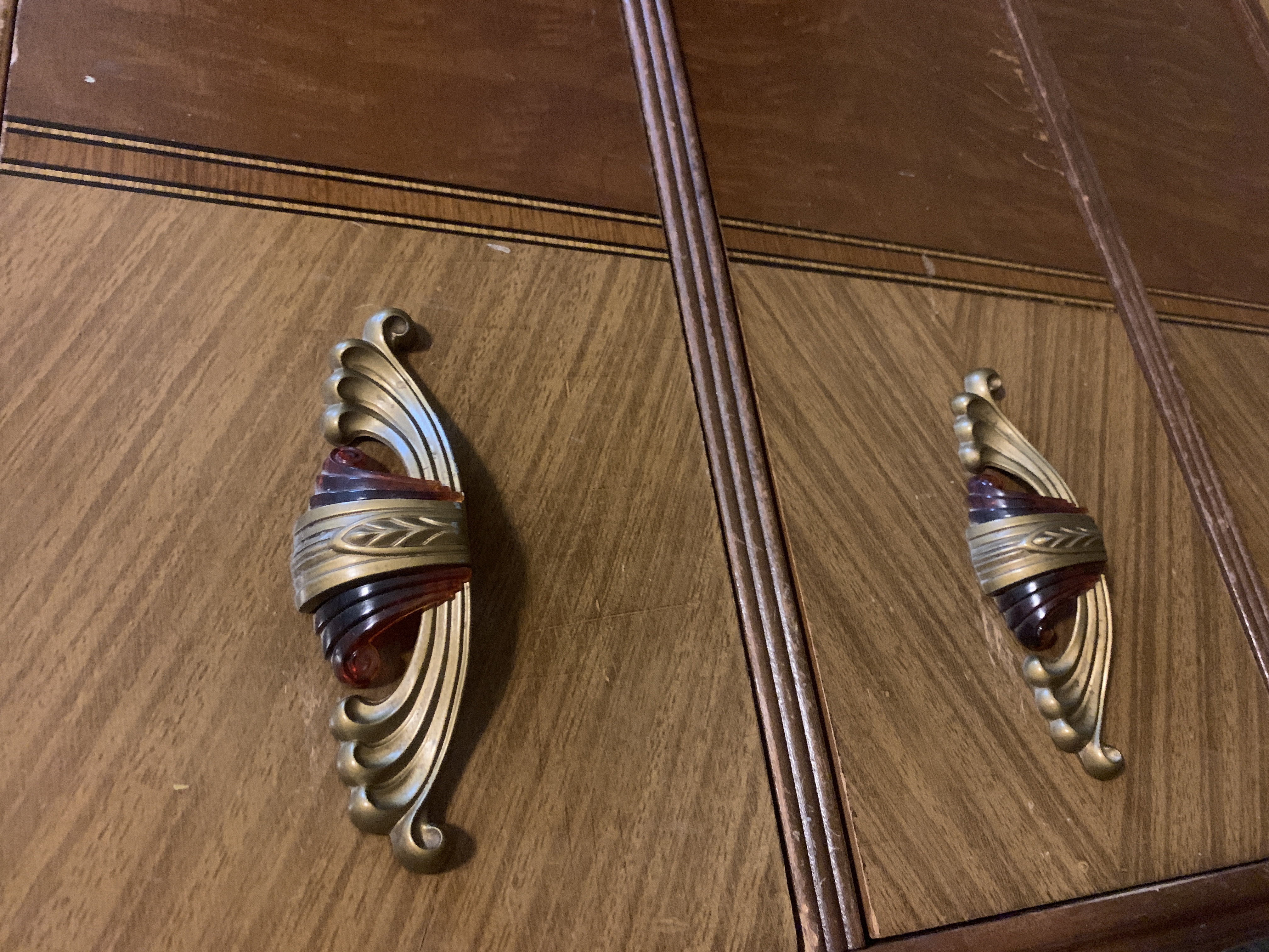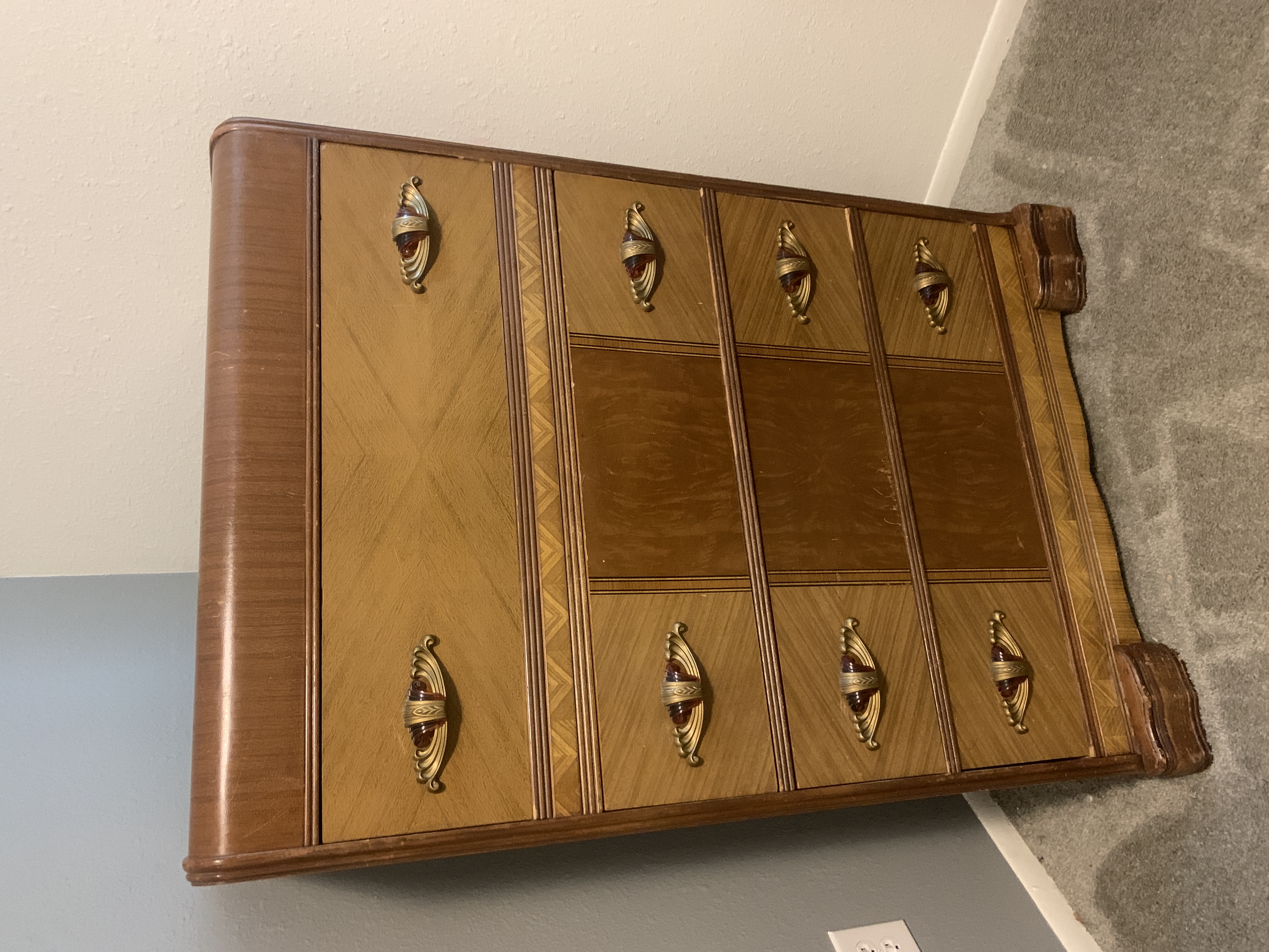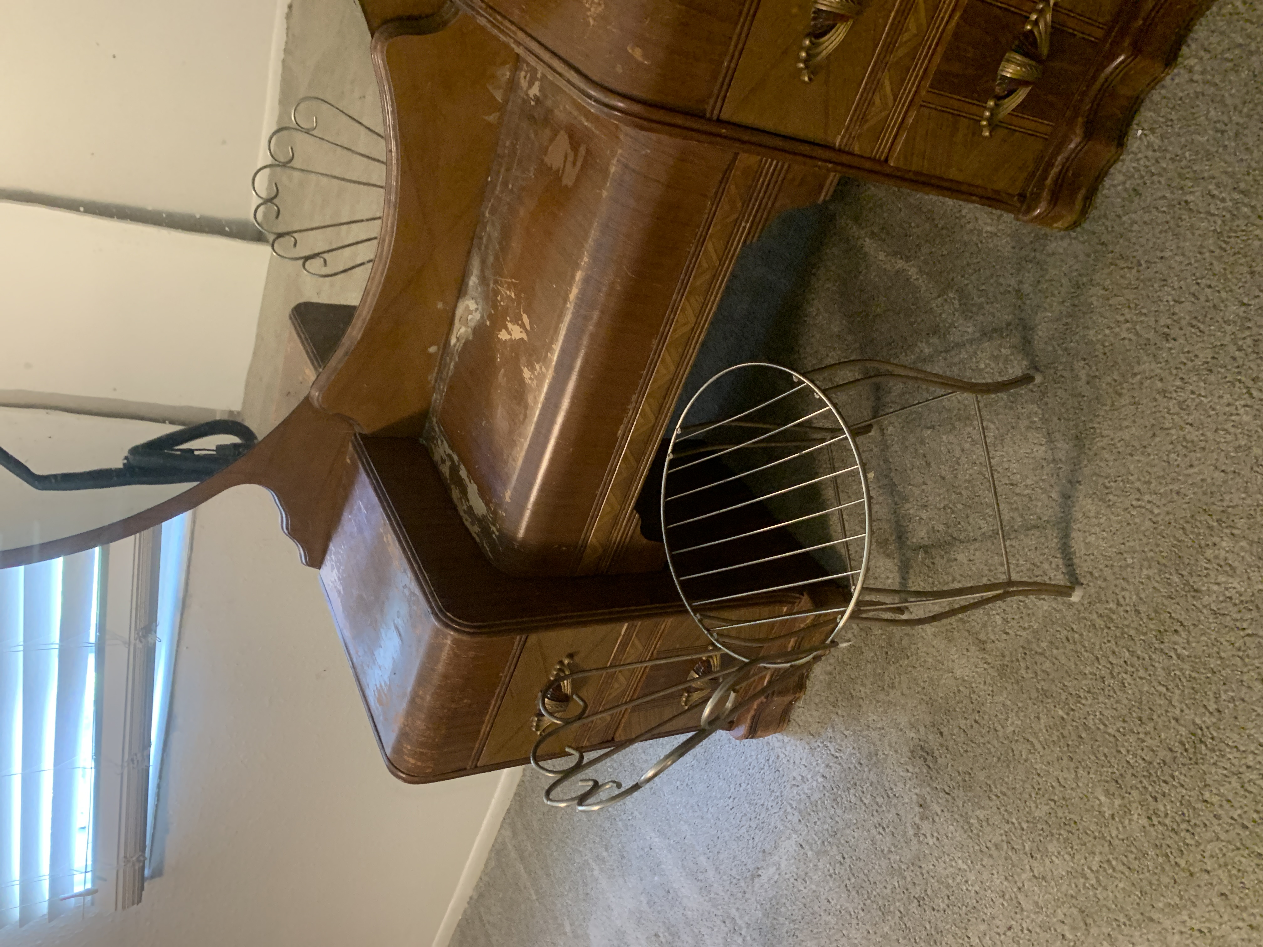 Three piece art deco set. Comes with vanity, stool, and dresser. Minor water damage and wear to the top of the vanity. I am needing an aprasial on this piece.