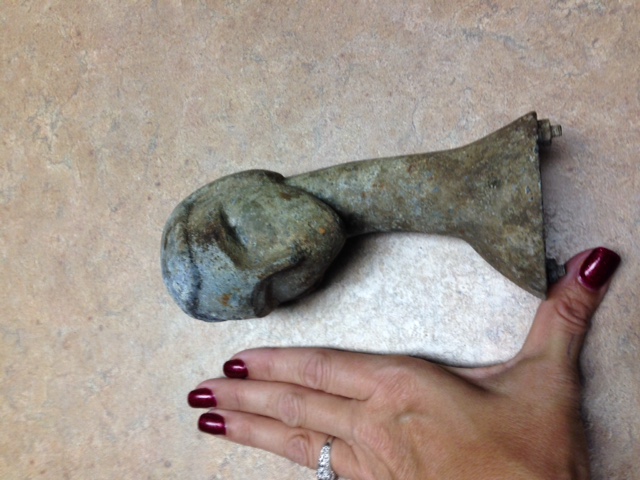 She has no mouth or real eyes, although they are indicated. She also has a period hairstyle that reflects the early 1900's. There are also nuts and bolts that show the item was bolted to something at one time.