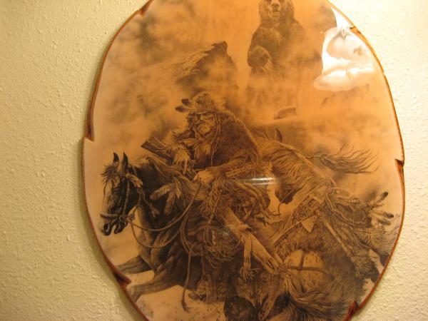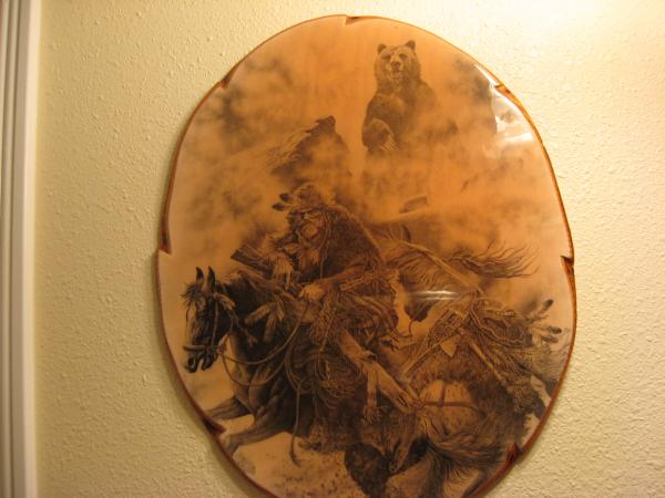 This is a sketch of a Man on a Horse, he is pulling another horse that has indian symbols on the saddle. they are in the mountains and there is a bear in the background.