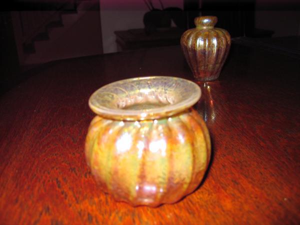 Two ribbed irridescent art glass vases from the late 1800's or early 1900's.