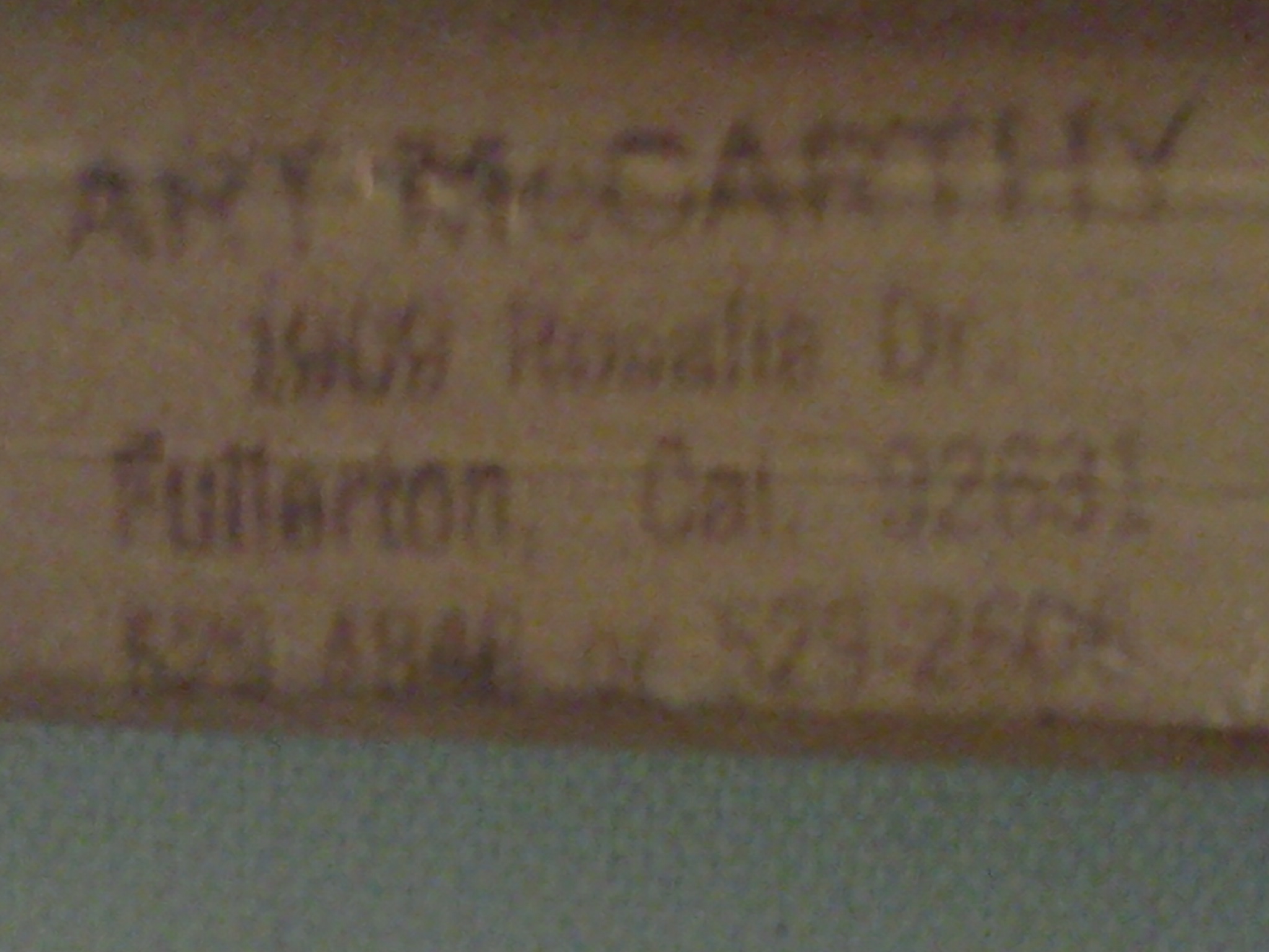 There is a stamp that reads ; ART McCARTHY 1919 Rosalia Dr., Fullerton, Cal 92631, 529-4848 or 529-2606.
