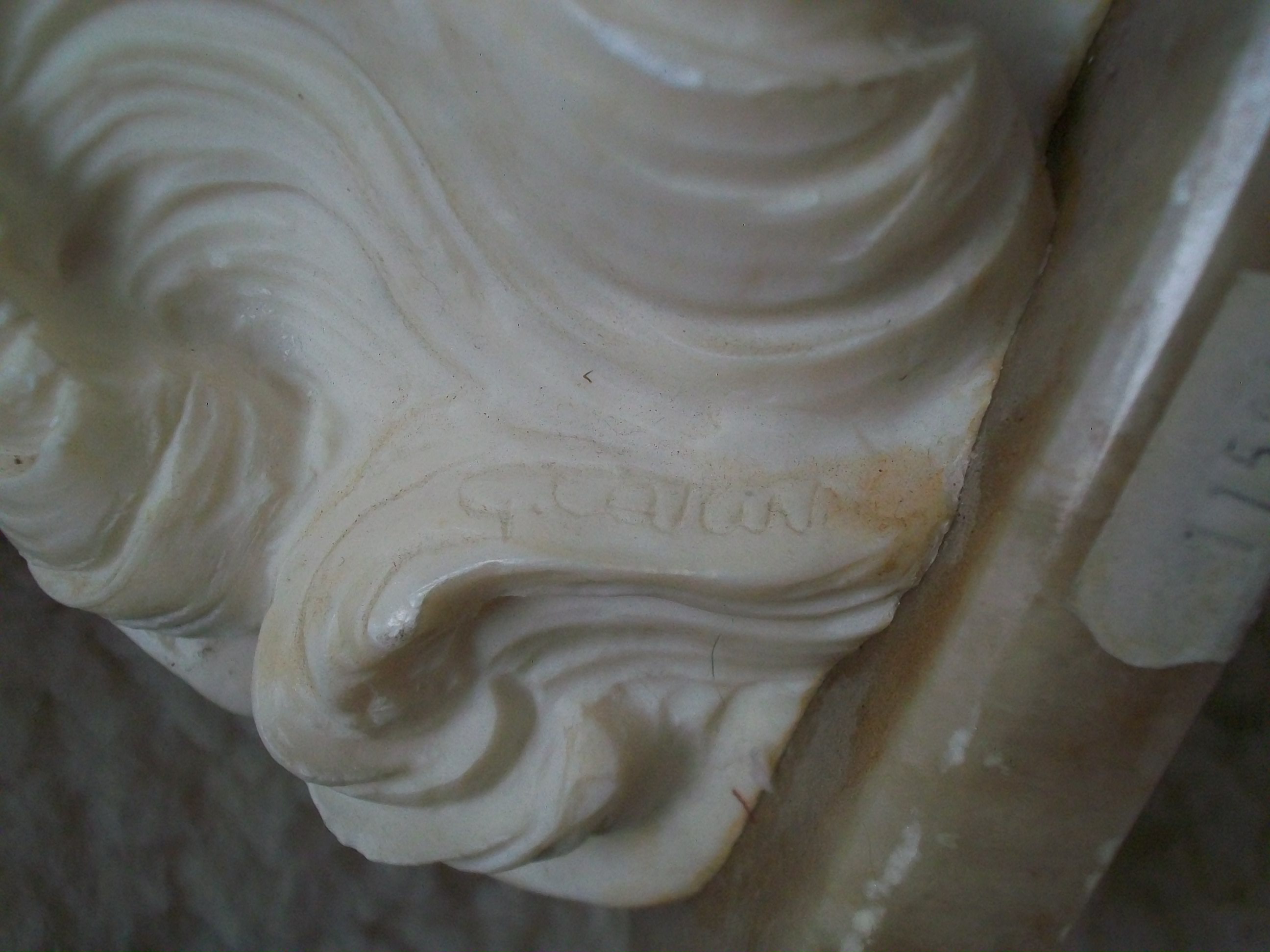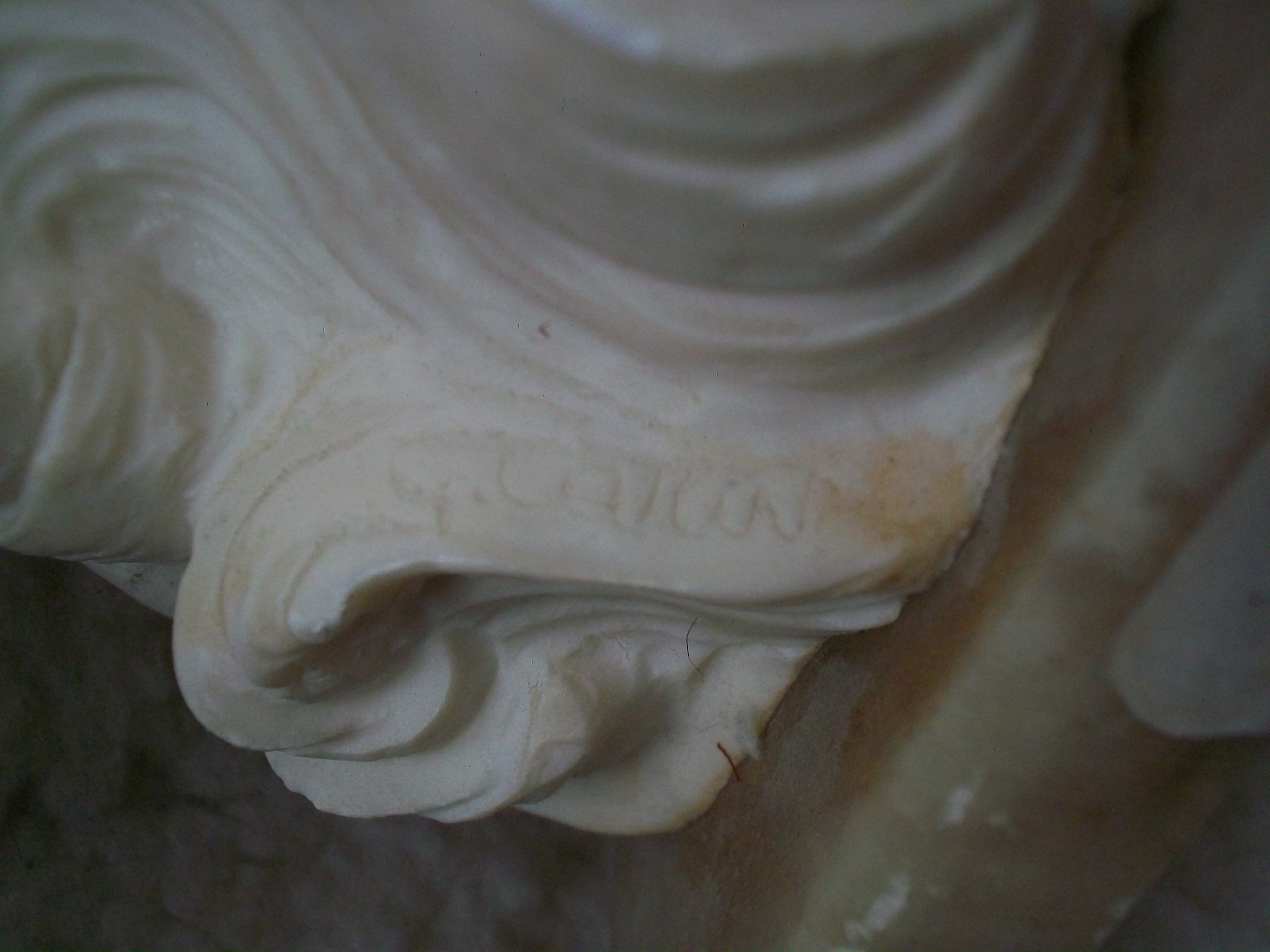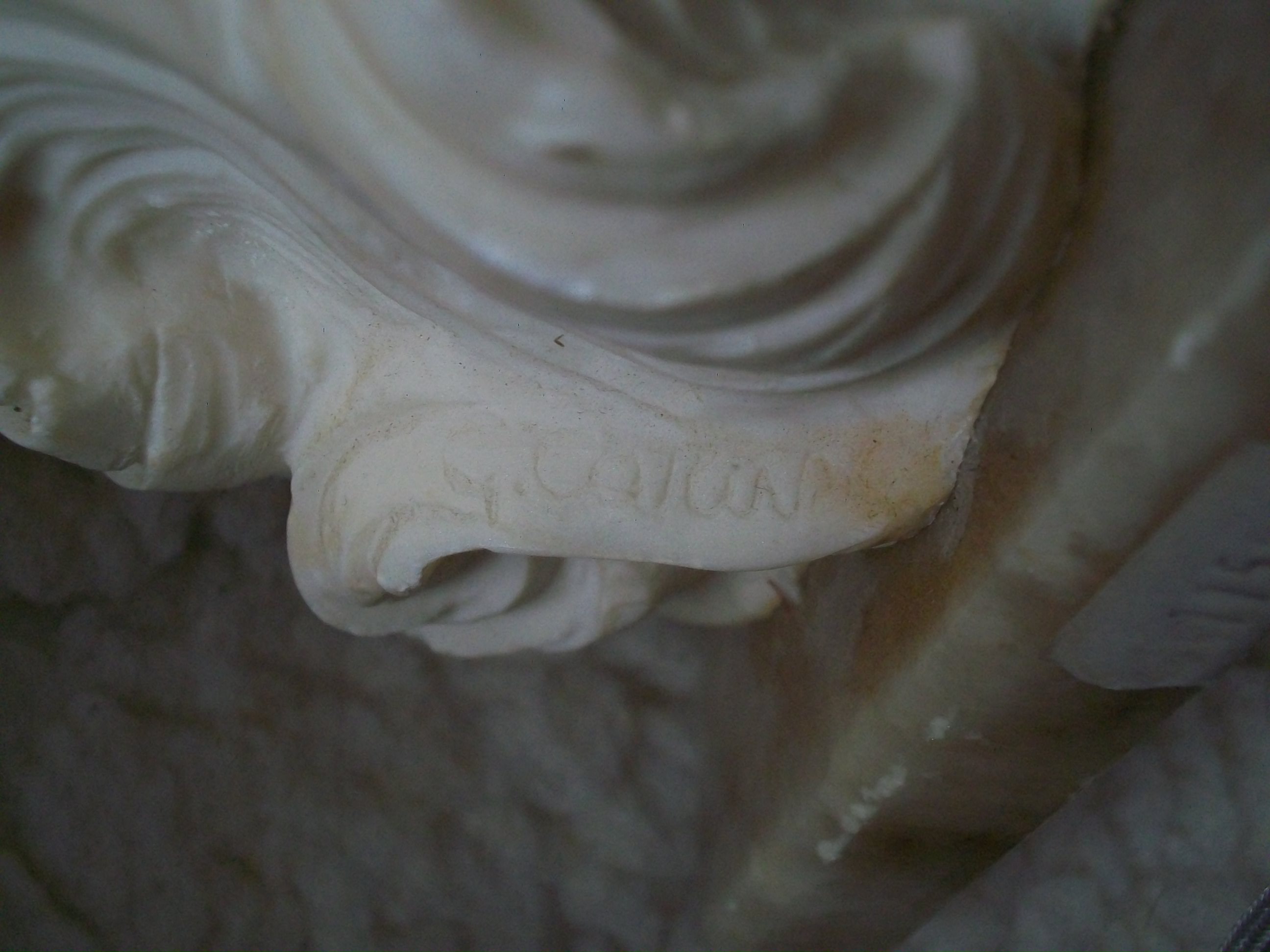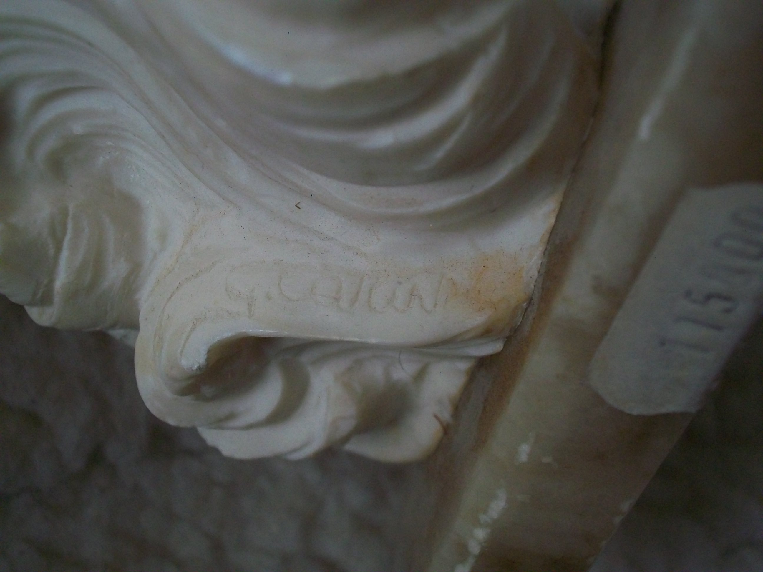 This alabaster statue is signed, but I cannot make out the full signature. Seems to be something like: "G. Car...." Measures 16 inches tall, 6 inches wide across the shell & about 5 3/4 inches across the marble base. The sticker on the marble base seems to indicate it once cost $1150.00. Hoping someone will recognize the artist or be able to tell me what the value might be. Thank you!