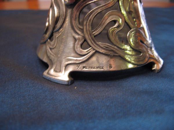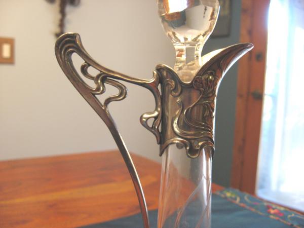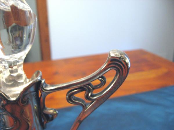 Beautiful glass and silver plate decanter. Original stopper is missing and has been replaced with a crystal stopper. Original excellent condition. Only flaw is worn spot at end of handle as seen in photo. Art Nouveau style lady's head on bottom with flowing hair. Also swirling Art Nouveau pattern on handle and glass and top of decanter. Plewkiewicz stamp is on bottom as follows: