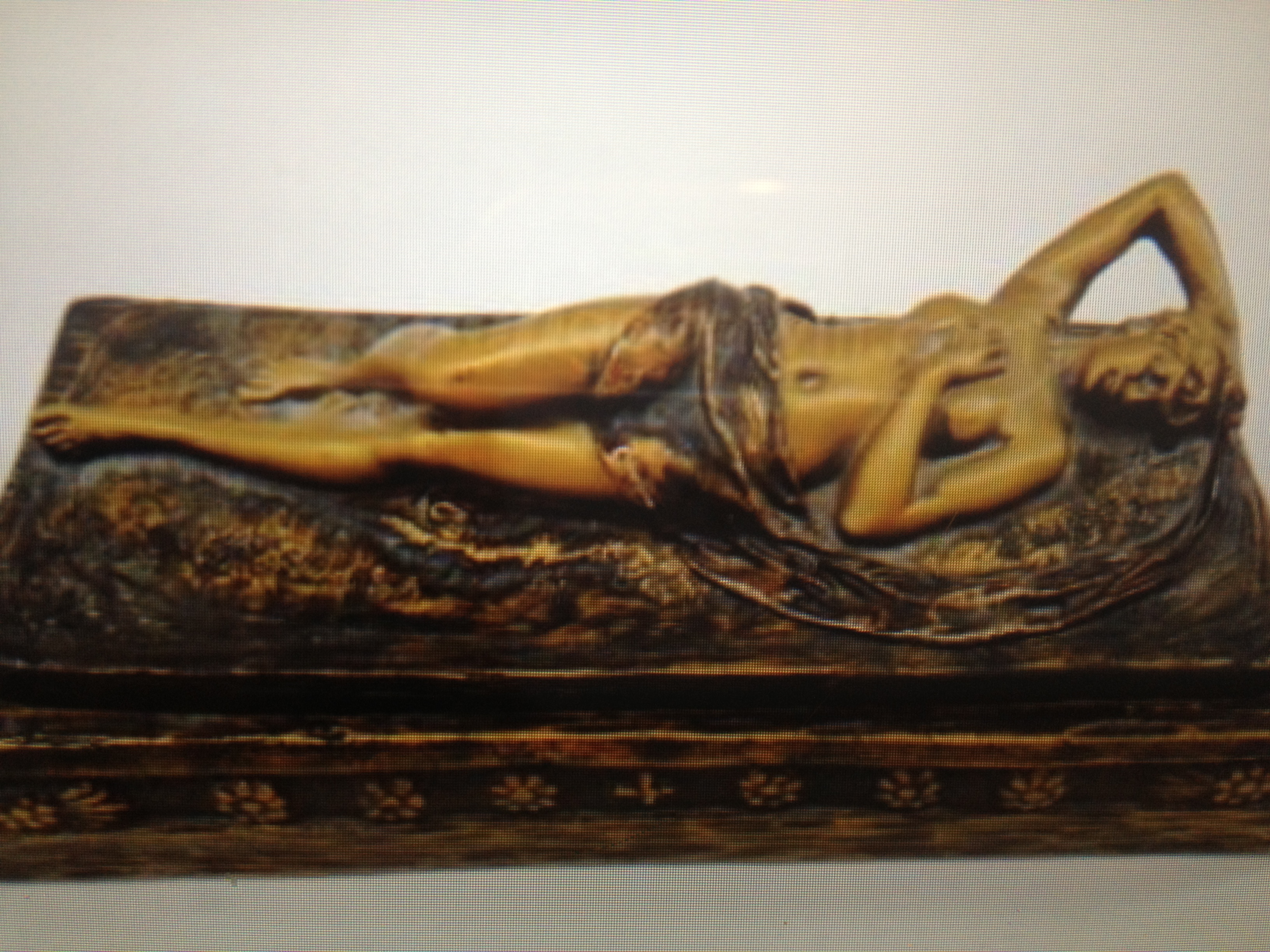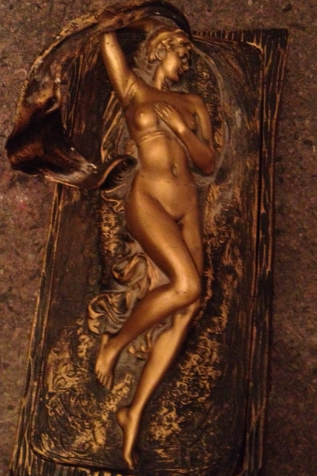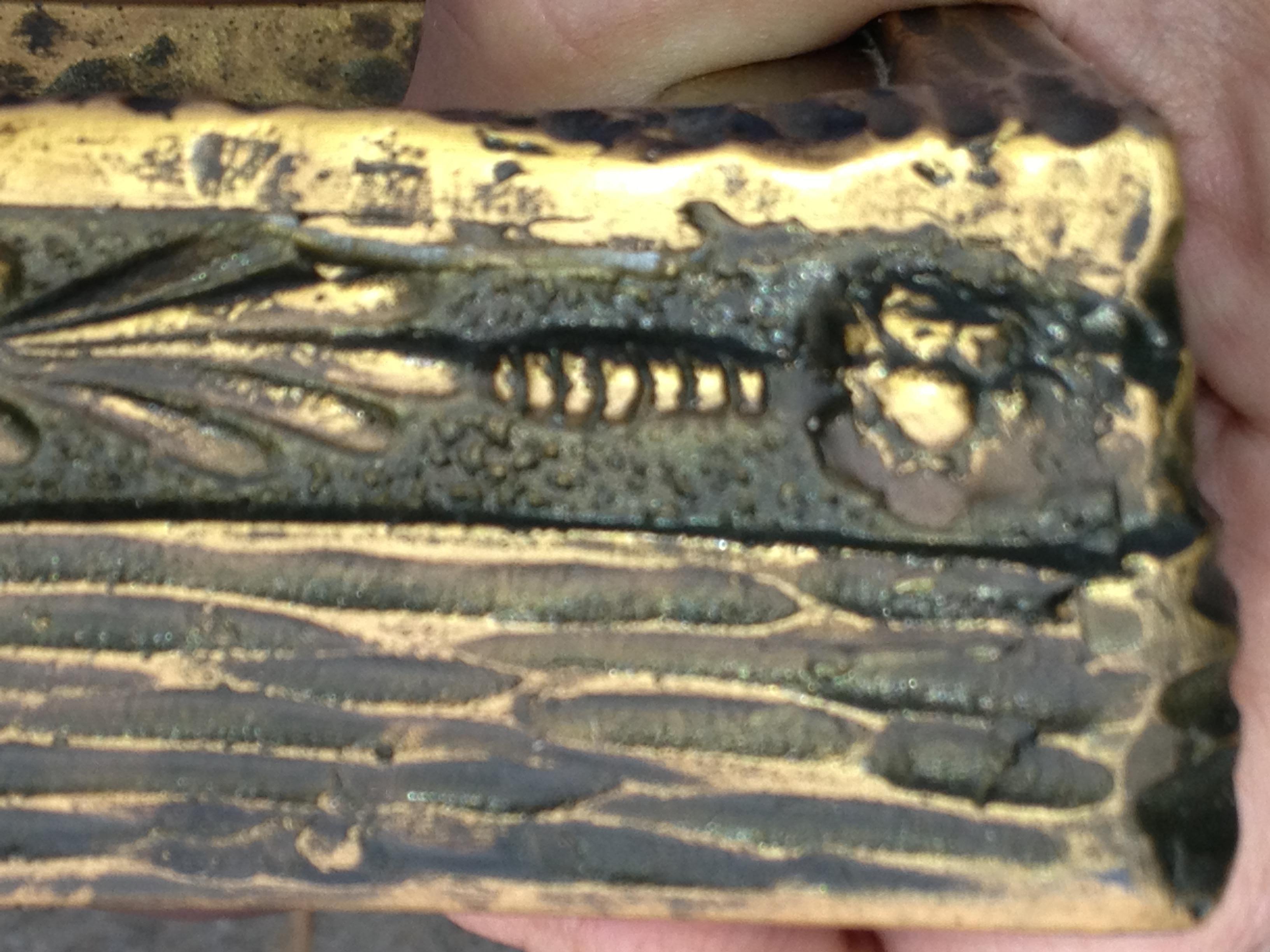 Help! My family is about to give up on me as I obsess who this lady is. This 2 section box with the nude figural lady, I once loved, is now getting on my last nerve. She is a box with a plaque lid. A spelter with patina. I removed the felt on the bottom since I could not locate any makers mark at the time. She refused to easily give up her secrets. When removing the green backing Im greeted with adhesive I've been manually rolling off. There are some raised characters. see last image. Then magically on one corner, on the side I located hidden a 3 letter initial. Maybe B A K or B A R. I filtered the picture and maybey these letters are completely different. It all depends what angler you view.