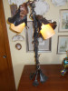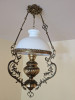 seems to be a rare hanging lamp (Elevator kerosene lamp), with a majolica body which fits onto the brass recipient. It is a dated, Art Nouveau lamp with six enamelled miniatures of women in the three arms.
