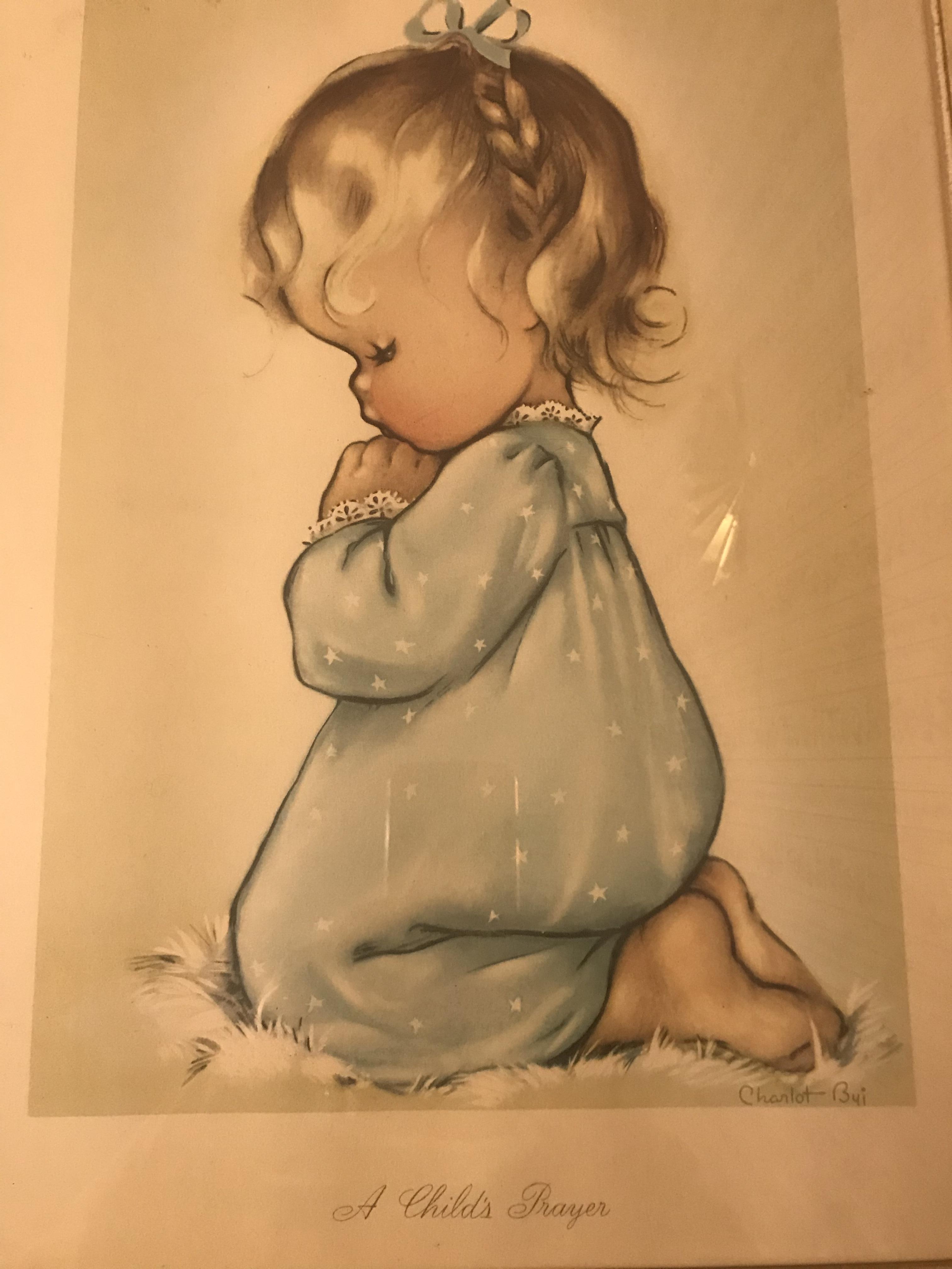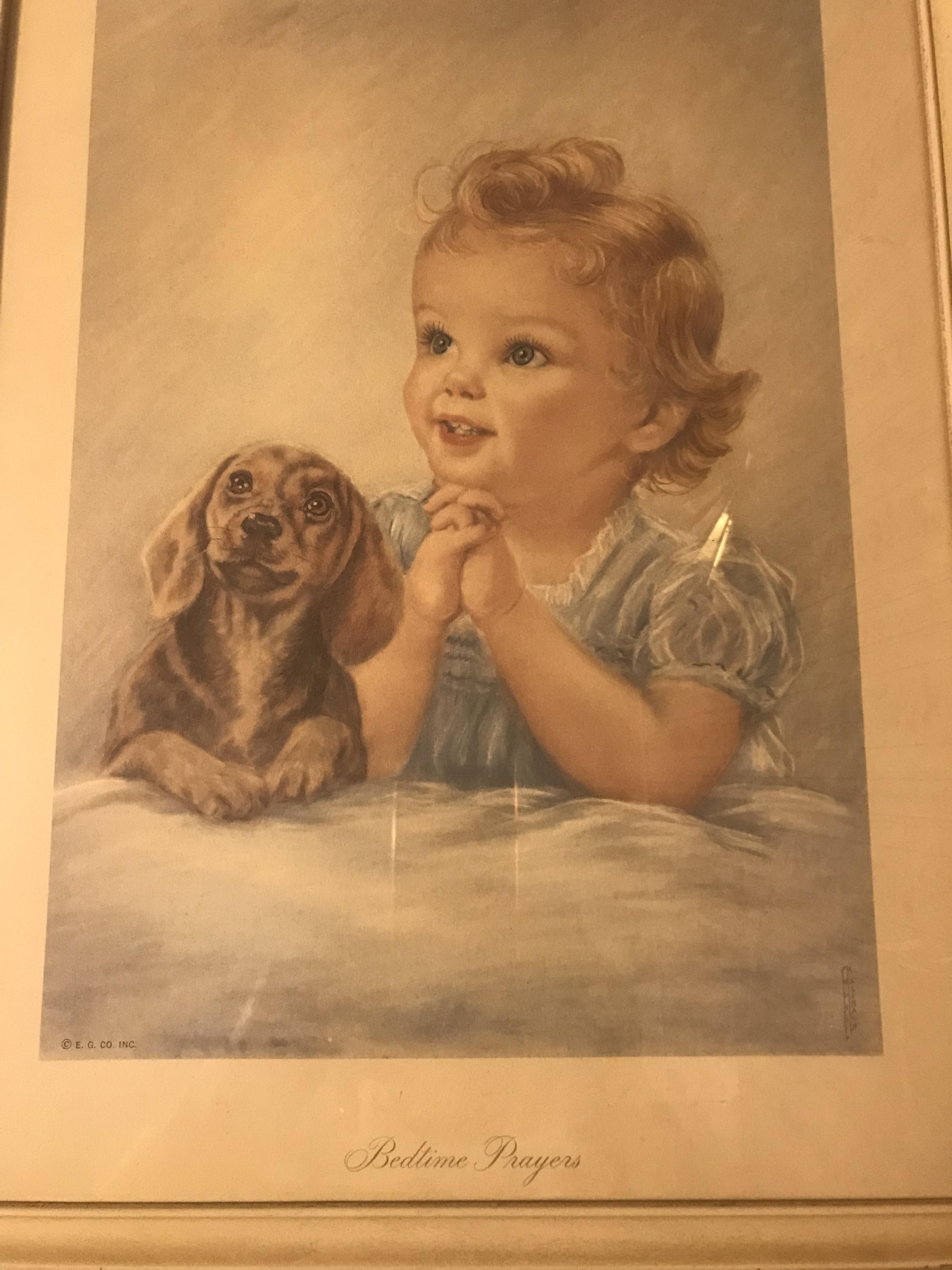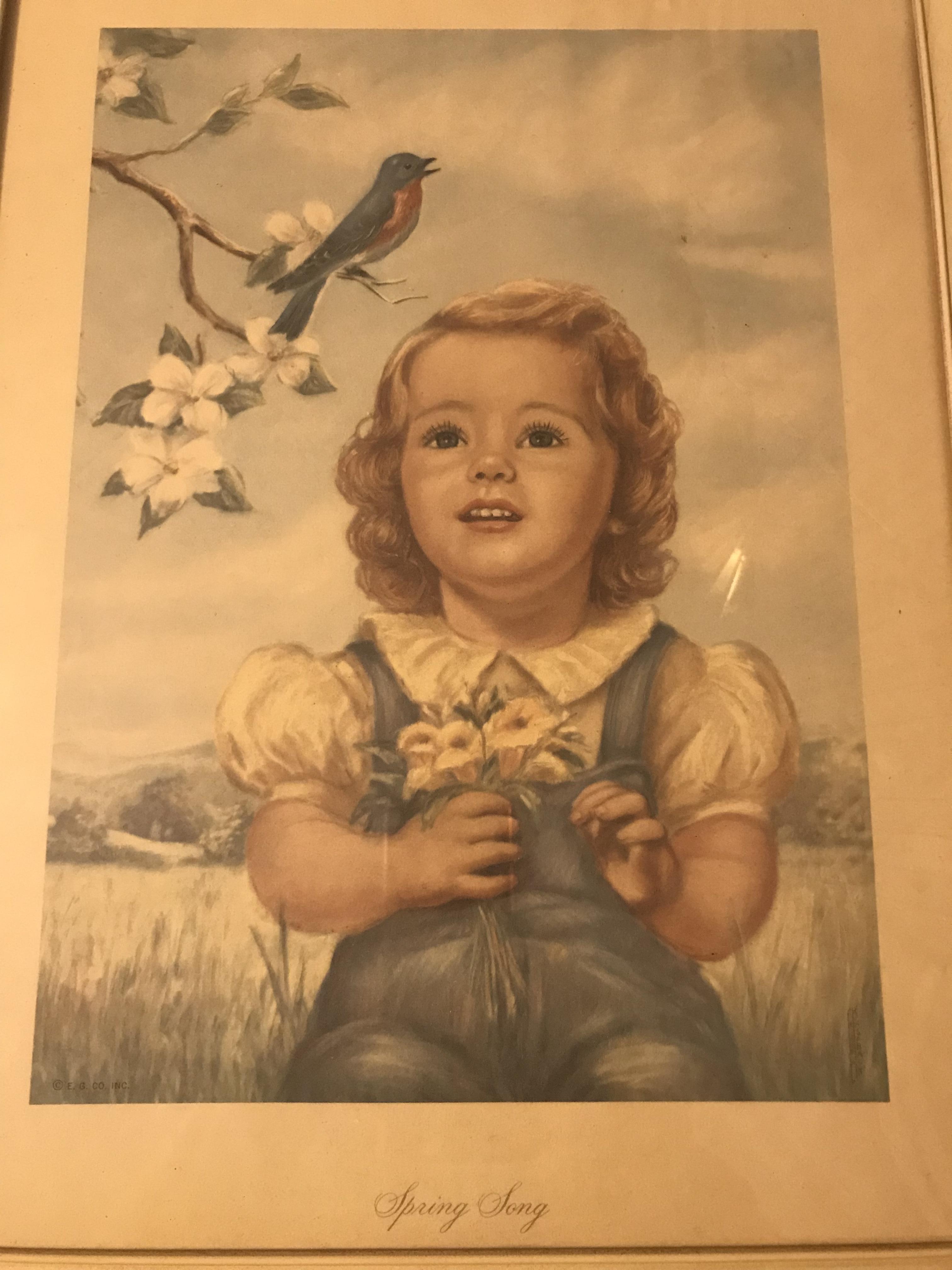 3 prints, 2 still have “Product of Reliable Newark, NJ” labels and item numbers on them. Likely from the mid 1950s. Entitled “Bedtime Prayers”, “ A Child’s Prayer” and “Spring Song”.