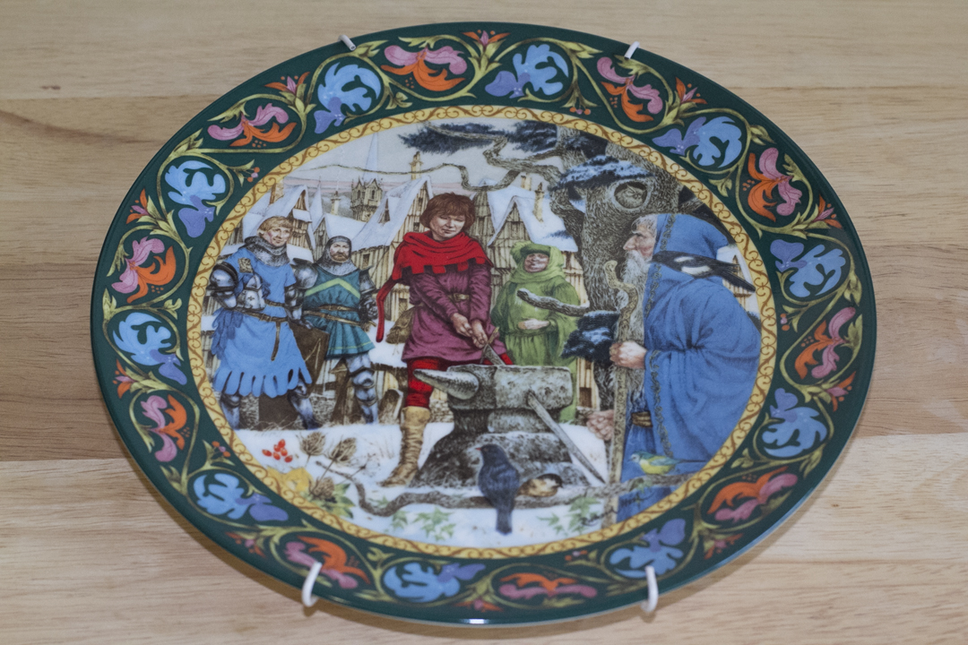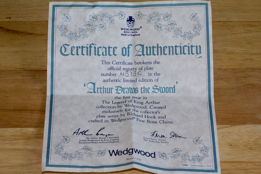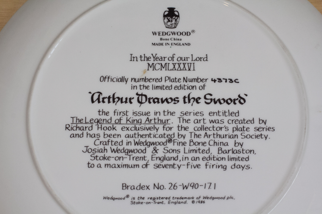 A Wedgwood Bone China made in England. It is titled: In the Year of our Lord MCMLXXXVI. An officially numbered plate number 4373c in the limited edition of "Arthur Draws the Sword." It is the first issue in the series entitled "The Legend of King Arthur." The art was created by Richard Hook exclusively for the collector's plate series and has been authenticated by The Arthurian Society. Crafted in Wedgwood Fine Bone China by Josiah Wedgwood & Sons Limited, Barlaston, Stoke-On-Trent, England, in an edition limited to a maximum of seventy-five firing days.