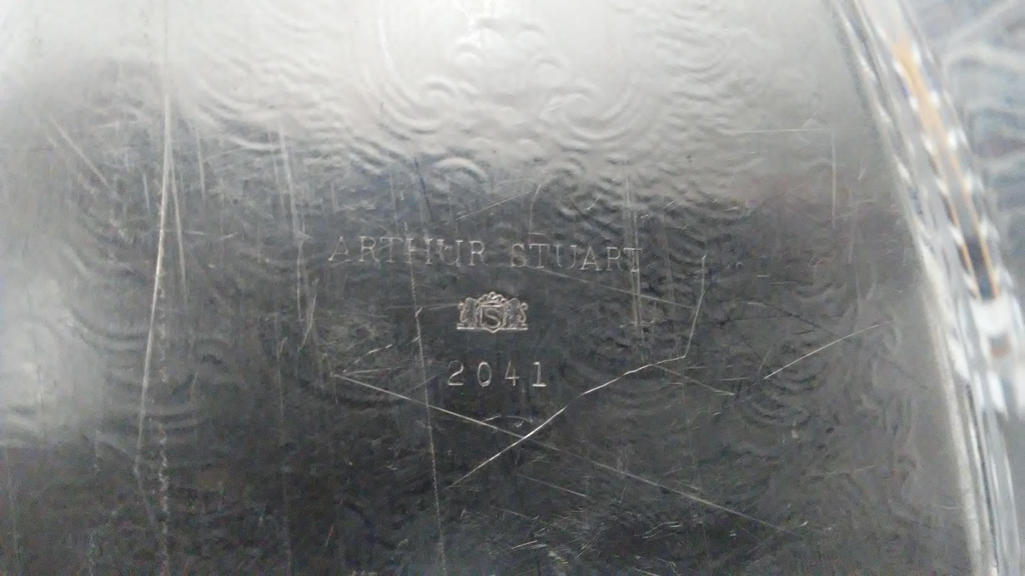 I have been looking to identify/price match for this bread plate online and can not find it anywhere. The back is marked Arthur Stuart 2041. The tray measures approx. 12" long, 7" wide and 1" tall. Any information would be greatly appreciated.