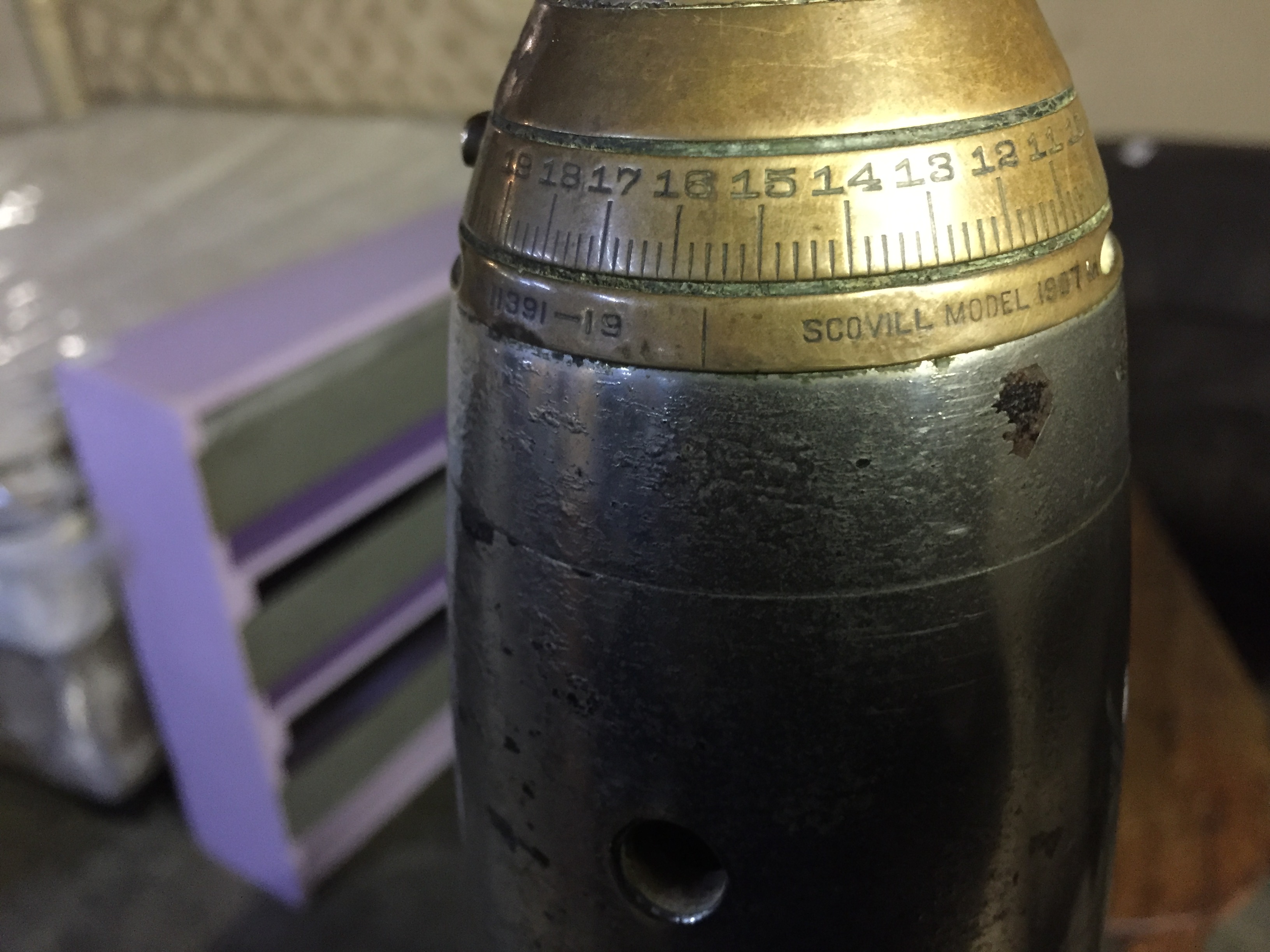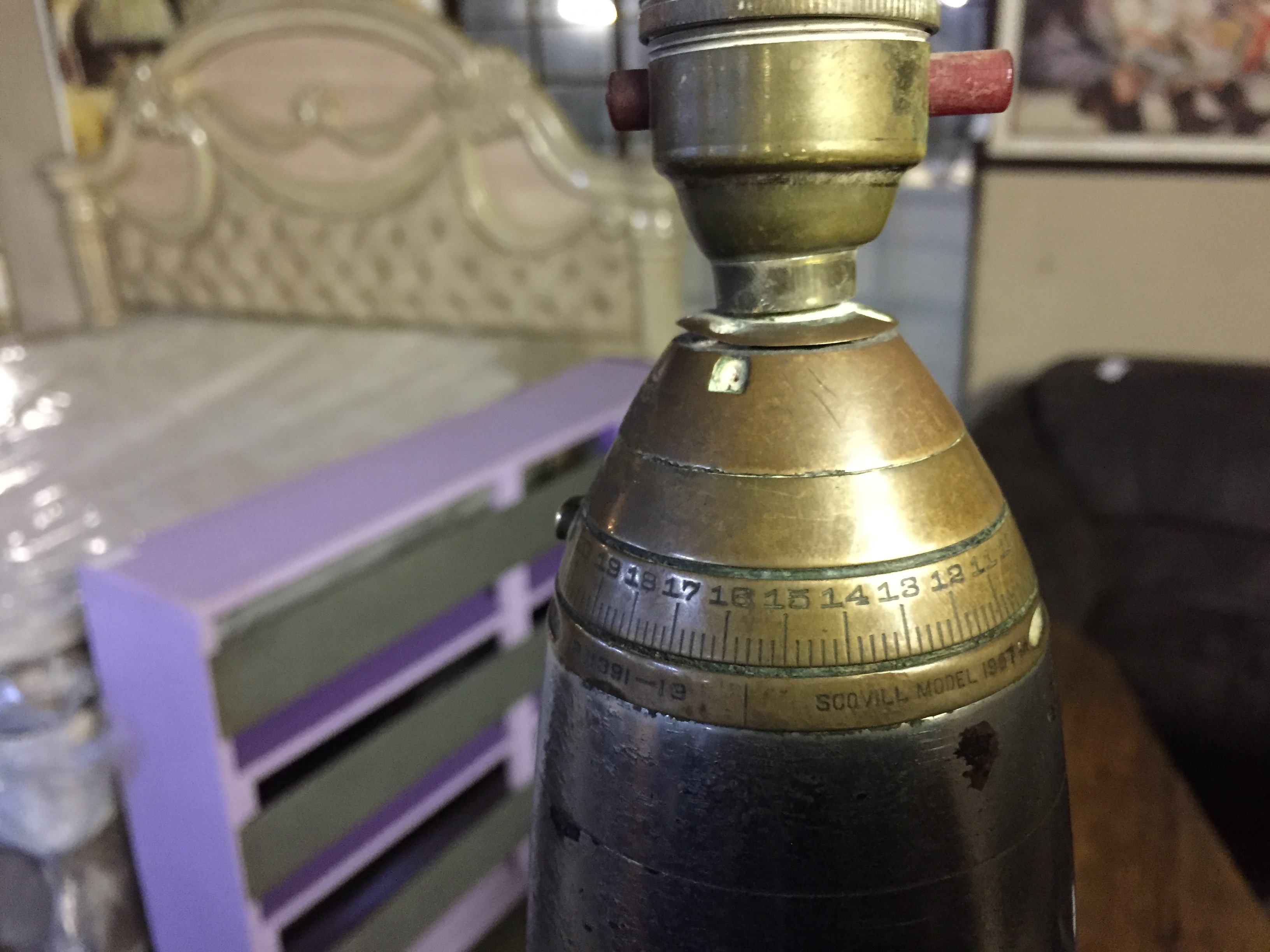 I bought this “ bullet lamp” last night at my regular auction and I was wondering if somebody could give me more info about this piece and if it’s worth anything. The marking on it reads SCOVILL MODEL 1907...