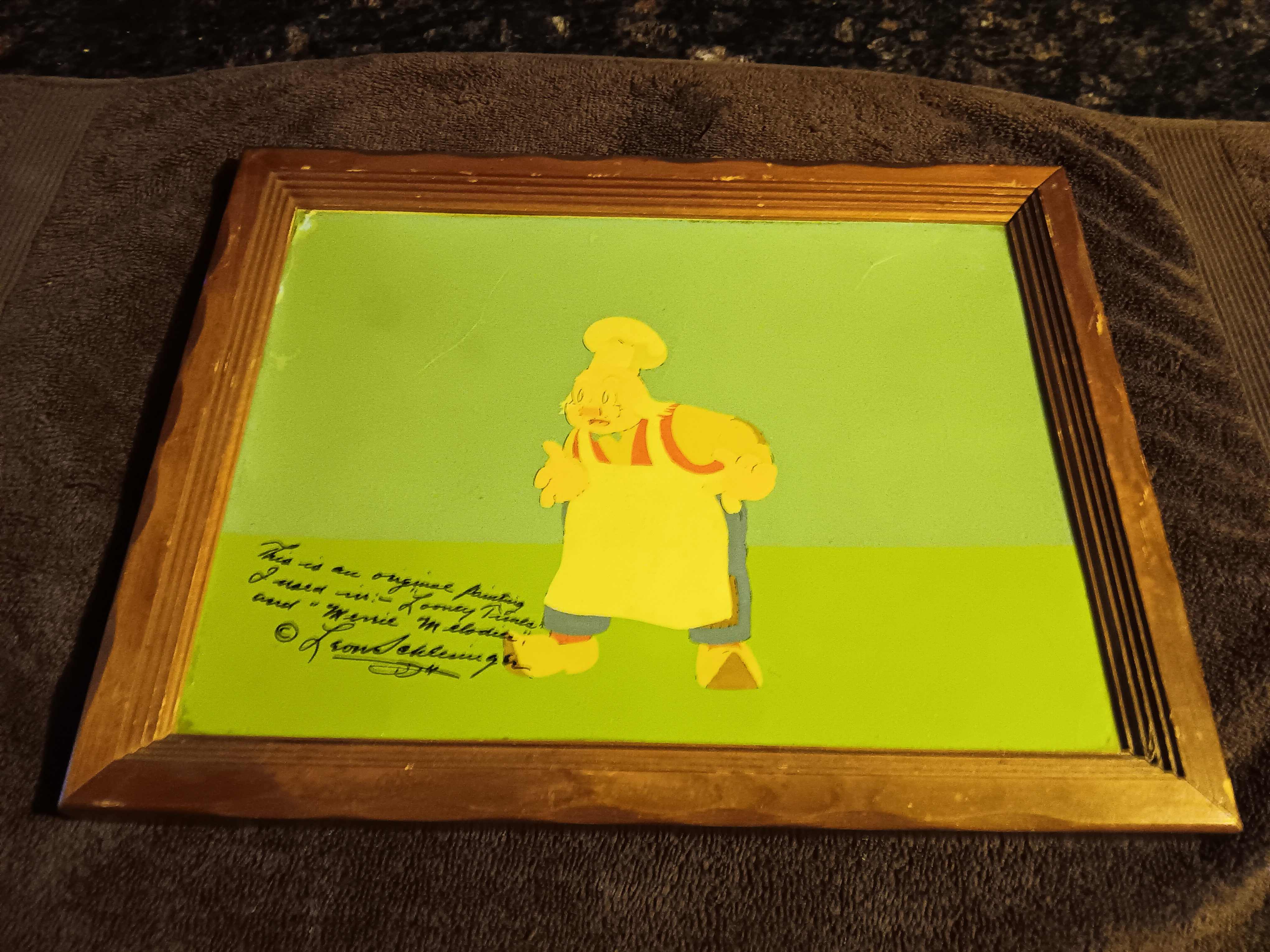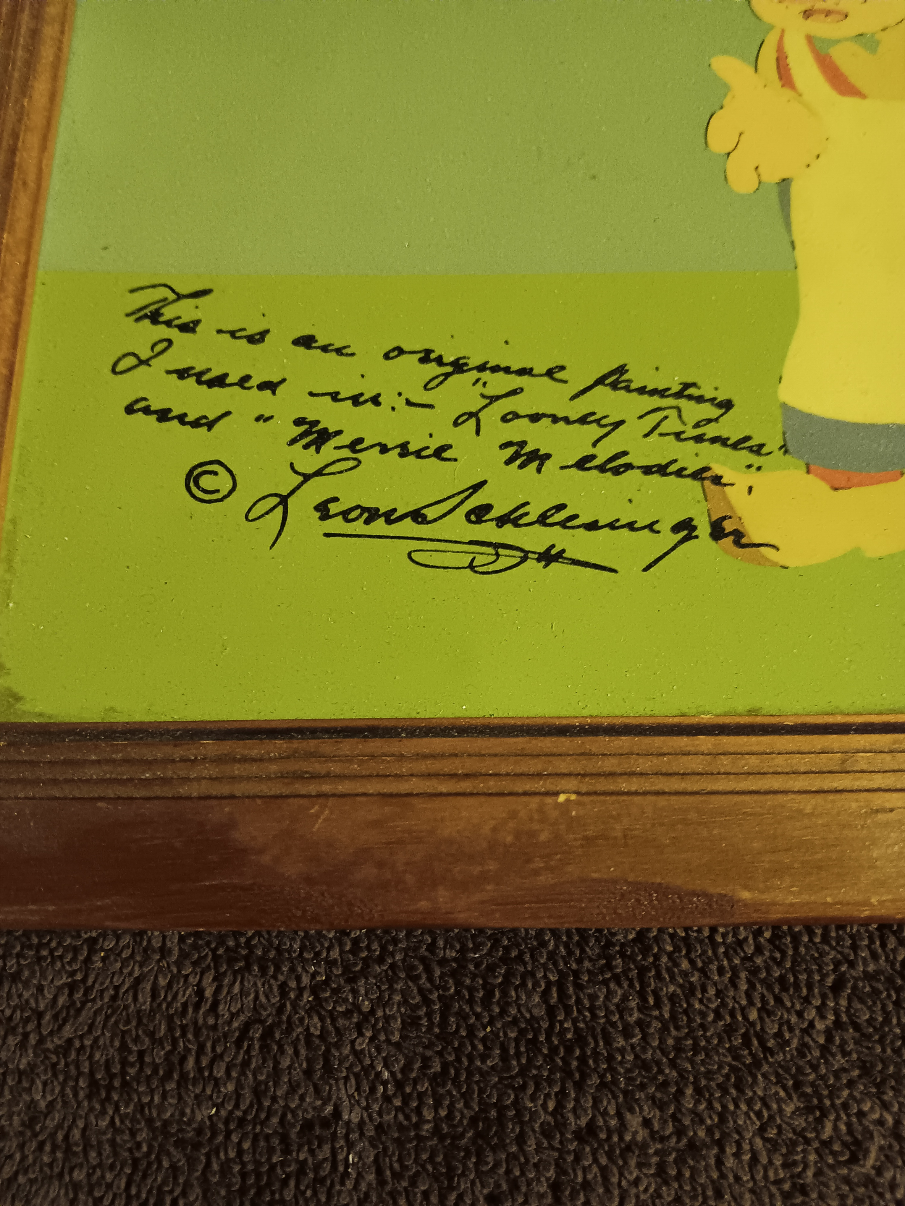 If this is a studio-authorized lithograph reproduction or cel with an authentic or printed signature from Schlesinger’s studio, its value could range between $150 to $450, depending on provenance, condition, and collector interest. If it's a true original production cel or hand-painted cel (not a lithograph), the value could be significantly higher—$800+ if authenticated.