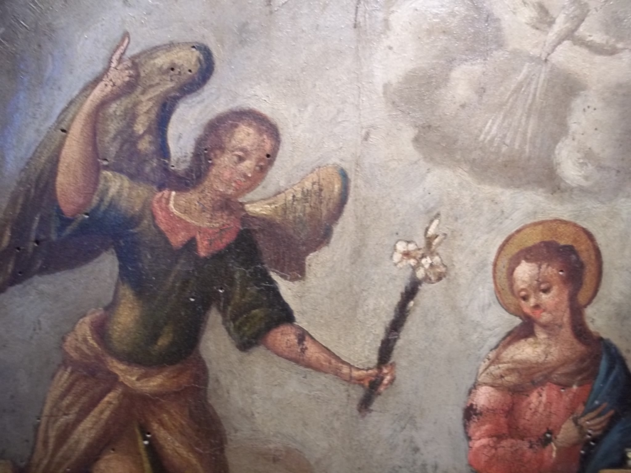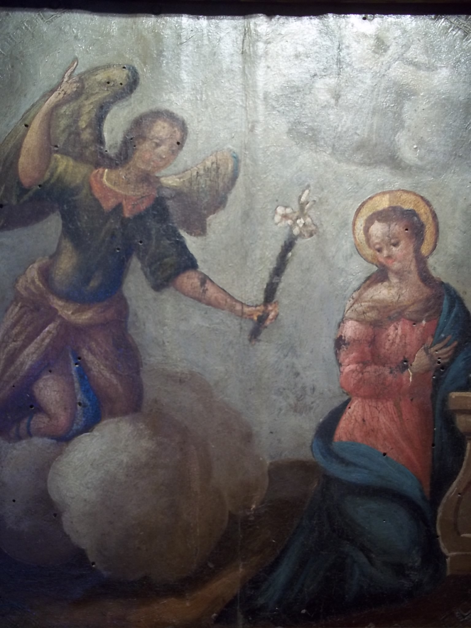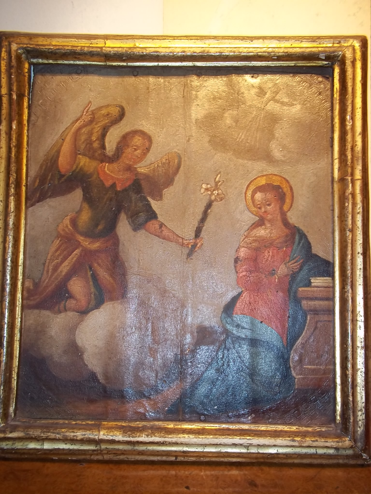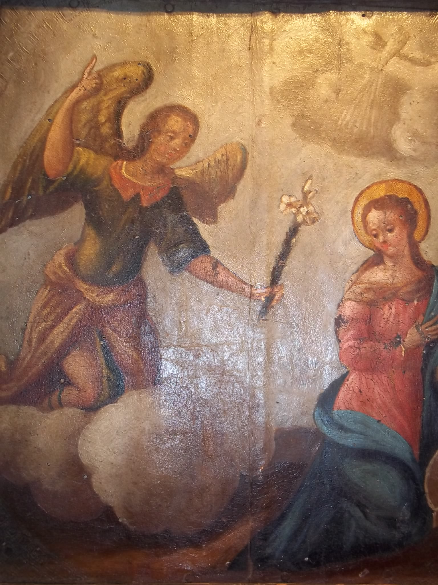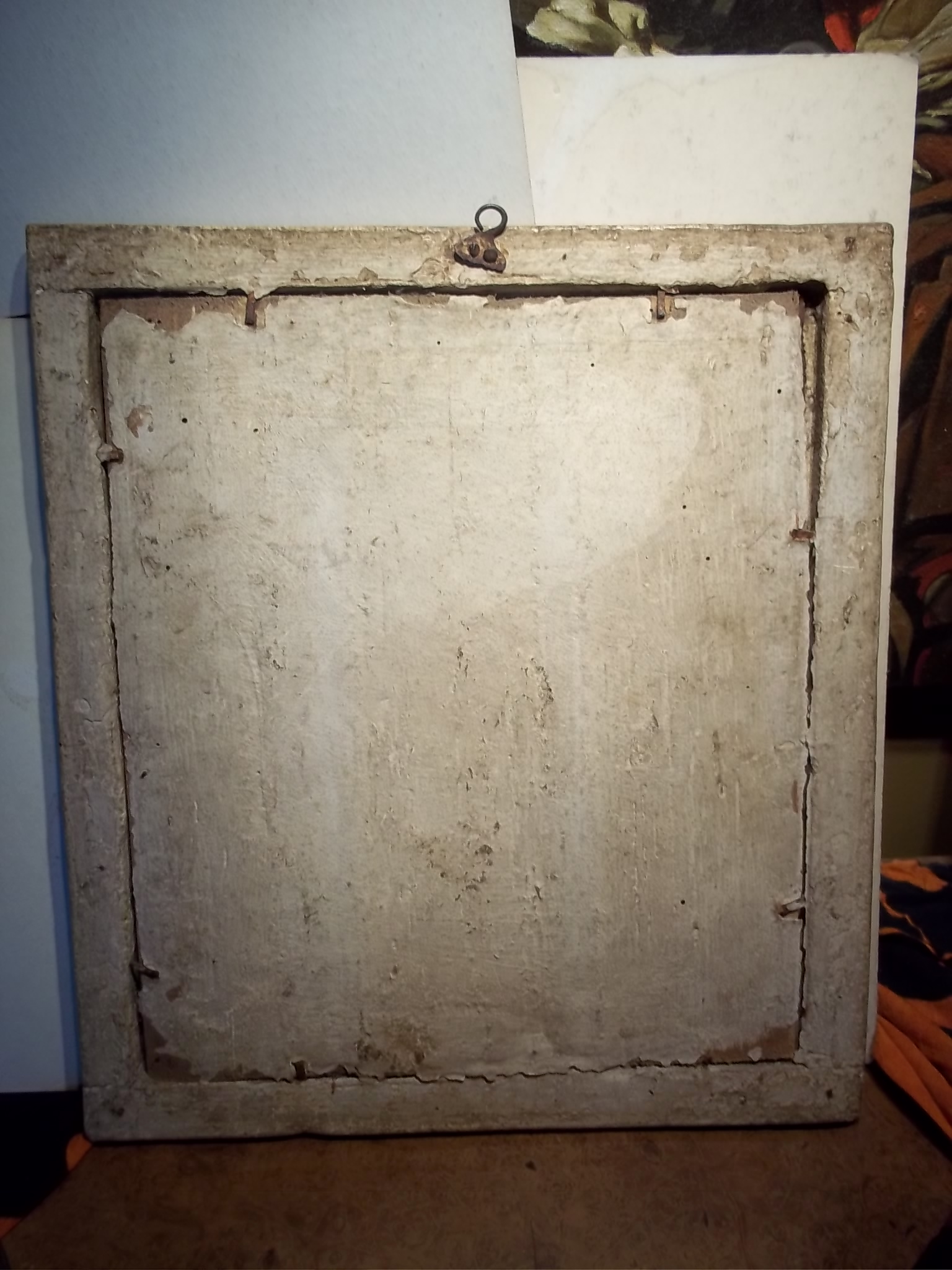 This painting is on leather over wood. The frame looks original to painting.The painting looks very old and has worm holes and crazing in the paint. Looks like a Russian icon painting but have never seen one like this before. It was bought in NYC in the 80s. Has never been appraised so not sure if it's origin or age. If anyone can give their input on this painting about it's origin and age and possible worth would be greatly appreciated.