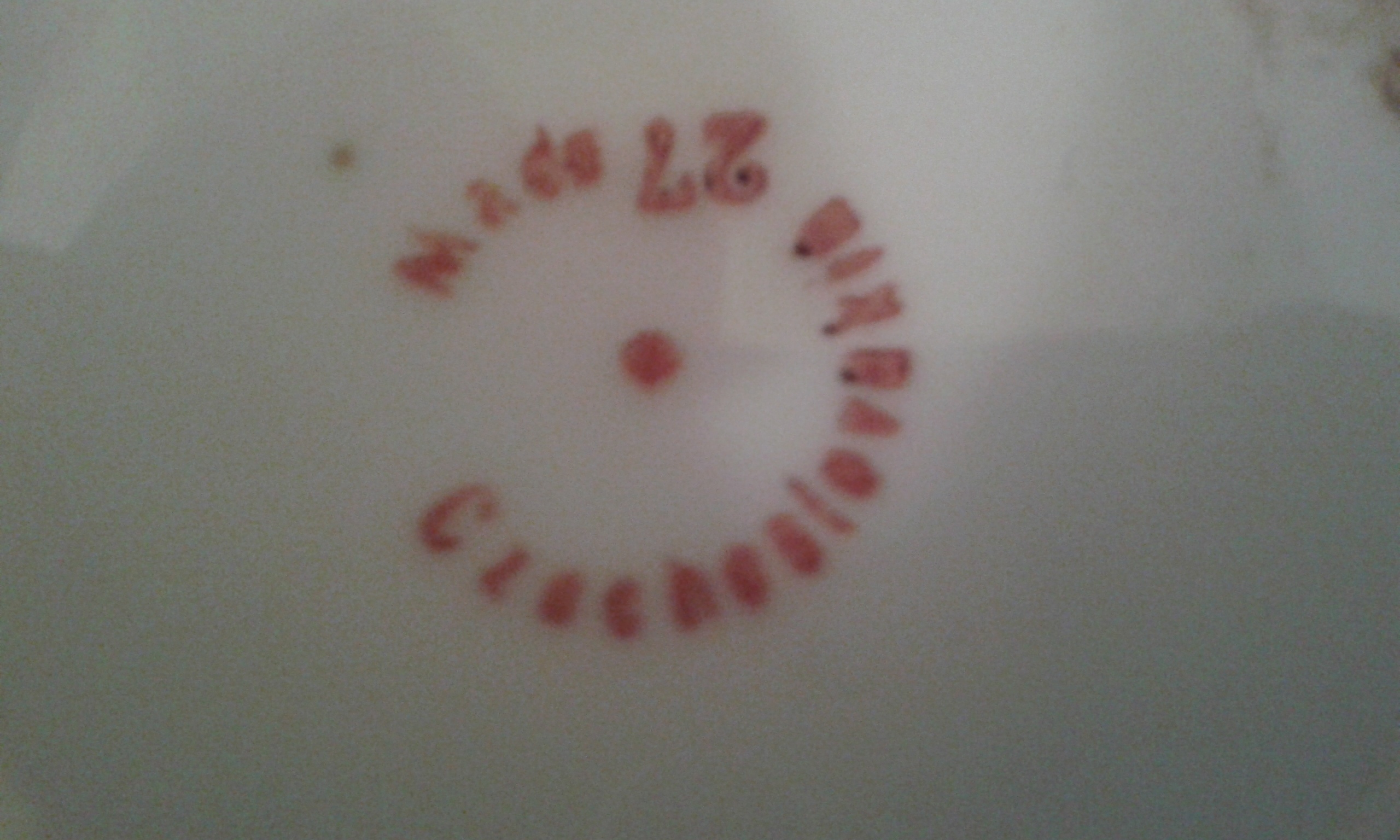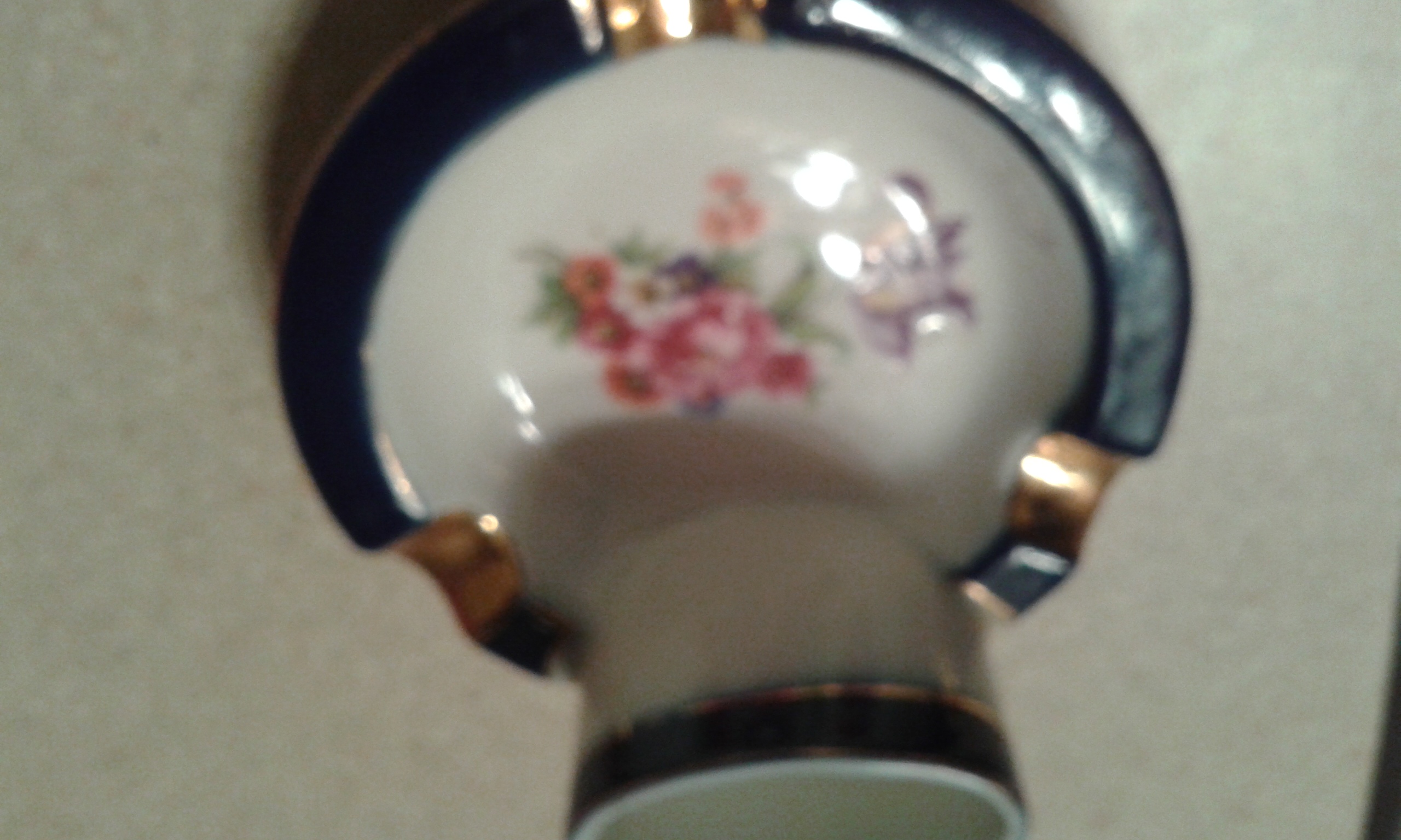Its small white with blue trim and gold rimmed. Has floral center and cylindrical space for matches or cigarettes, perhaps. Has stamp on bottom.