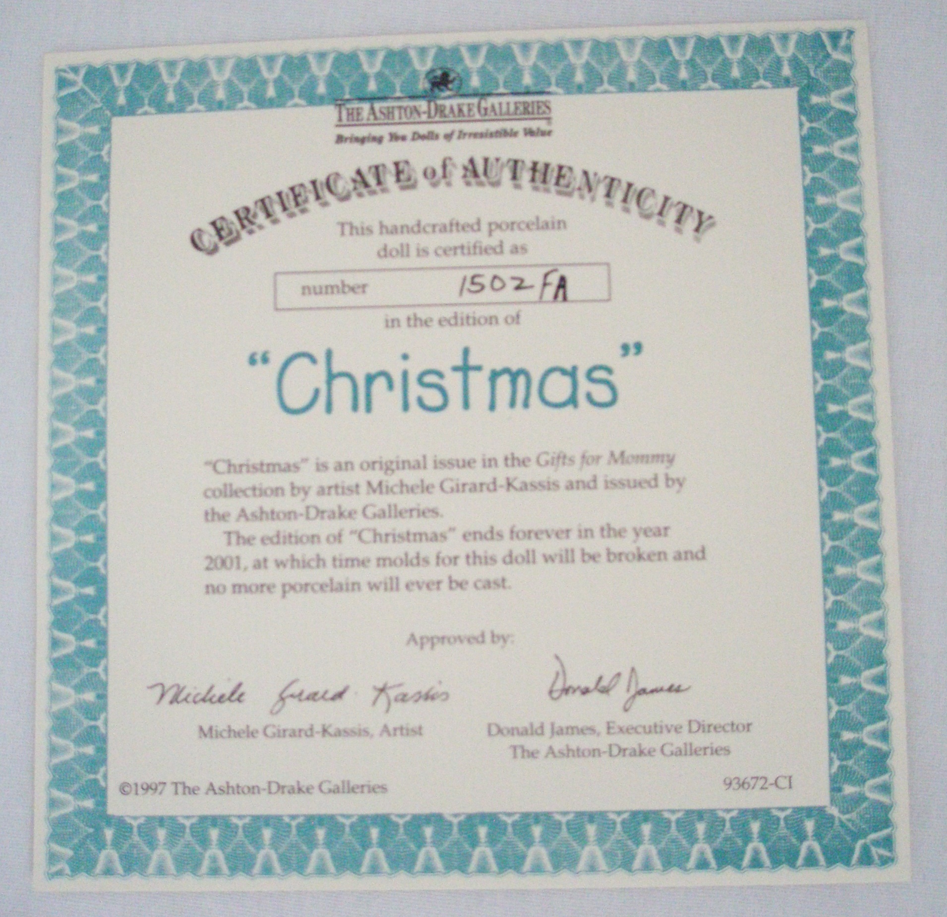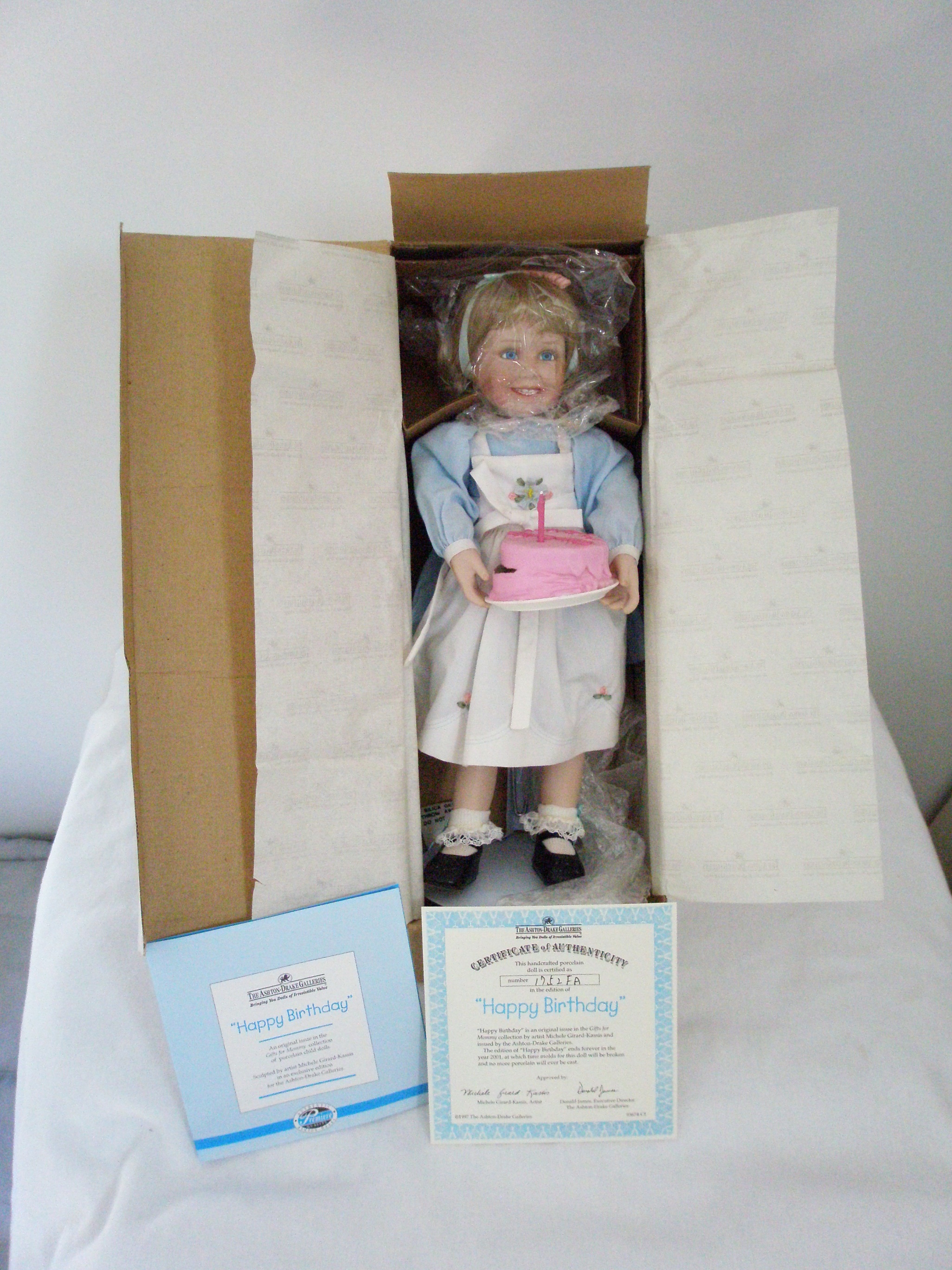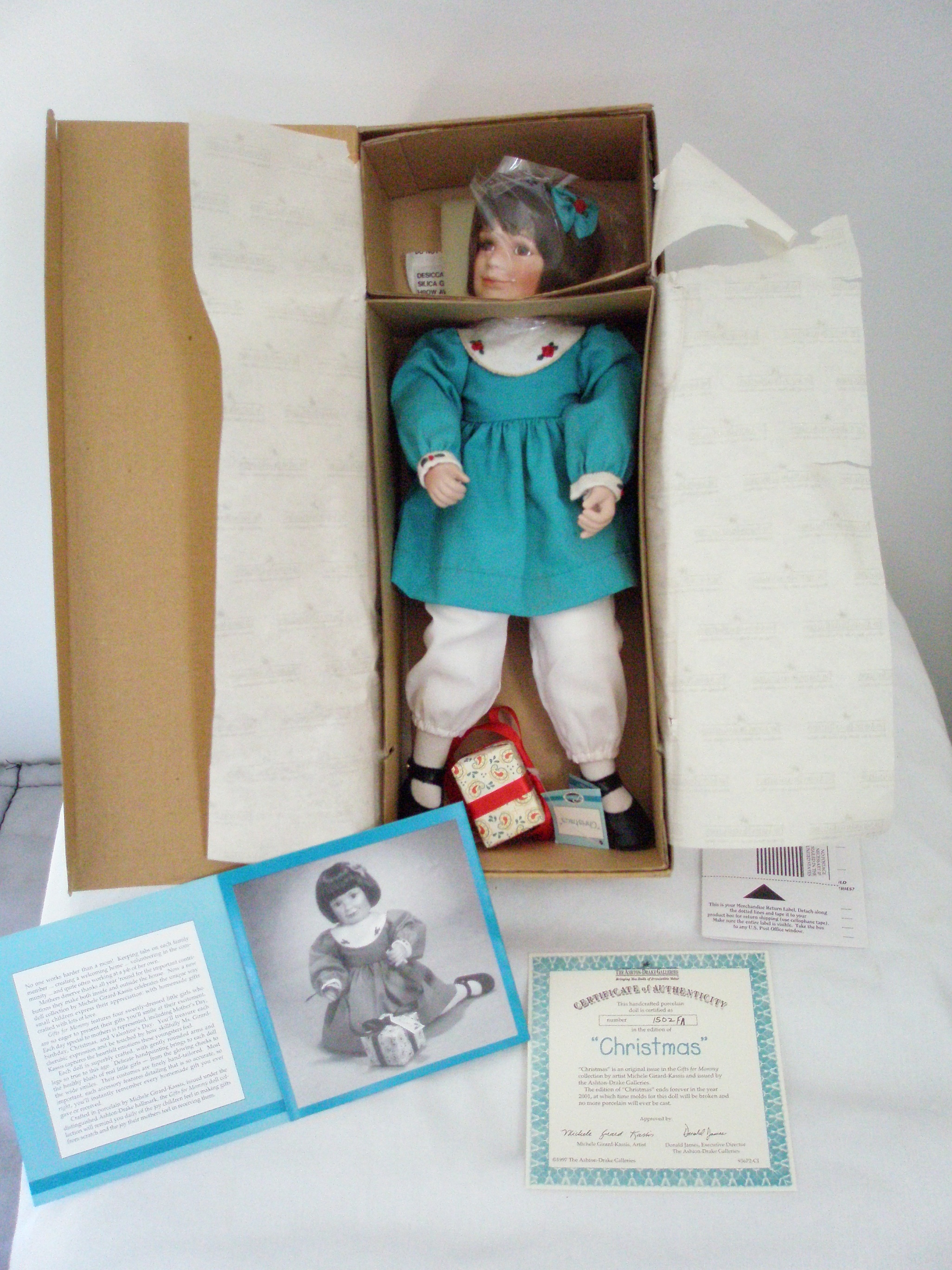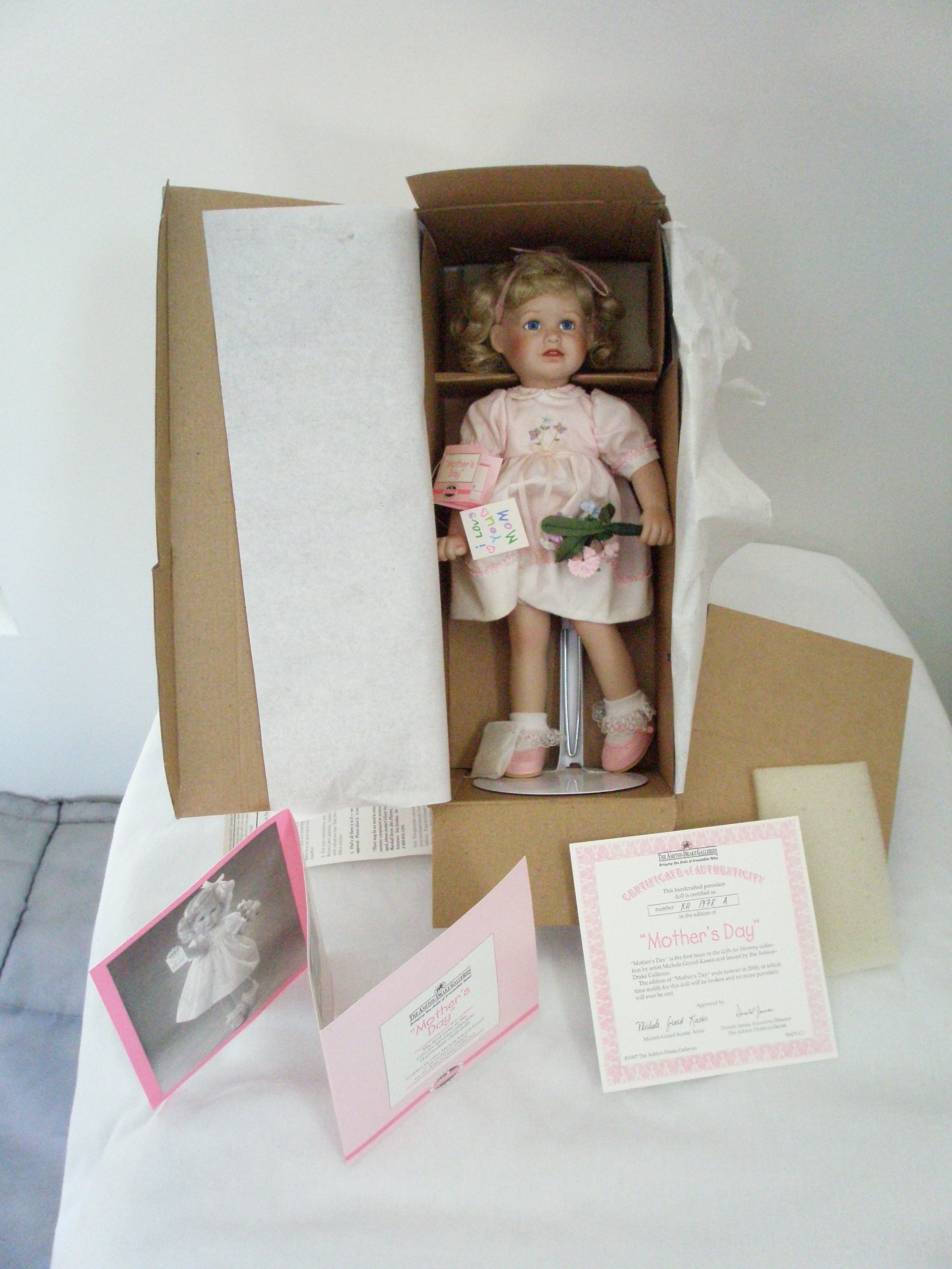 These are porcelain dolls from the artist, Michele Girard-Kassis. Each doll bears the signature of the artist, is individually numbered, and comes with a matching-numbered Certificate of Authenticity. The "Gifts for Mommie" Collection ended in 2000, when the molds were broken forever.