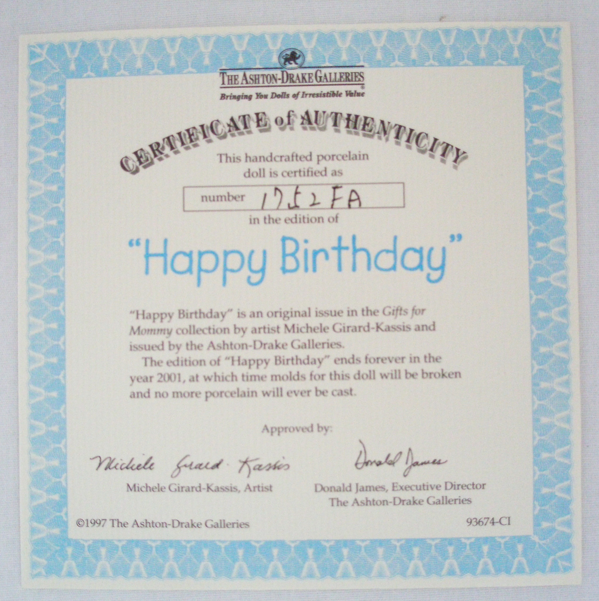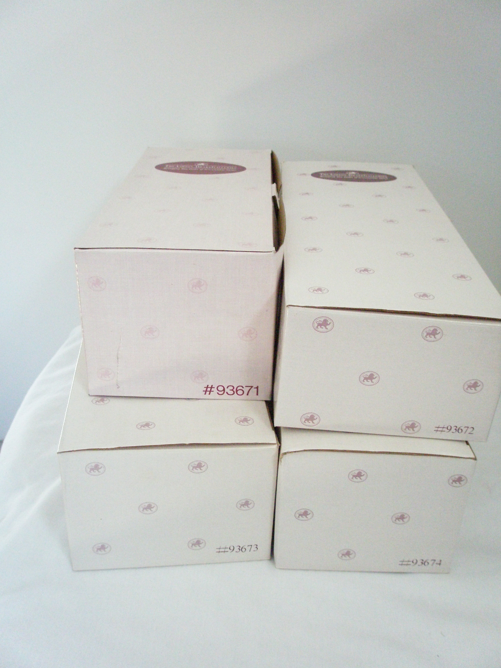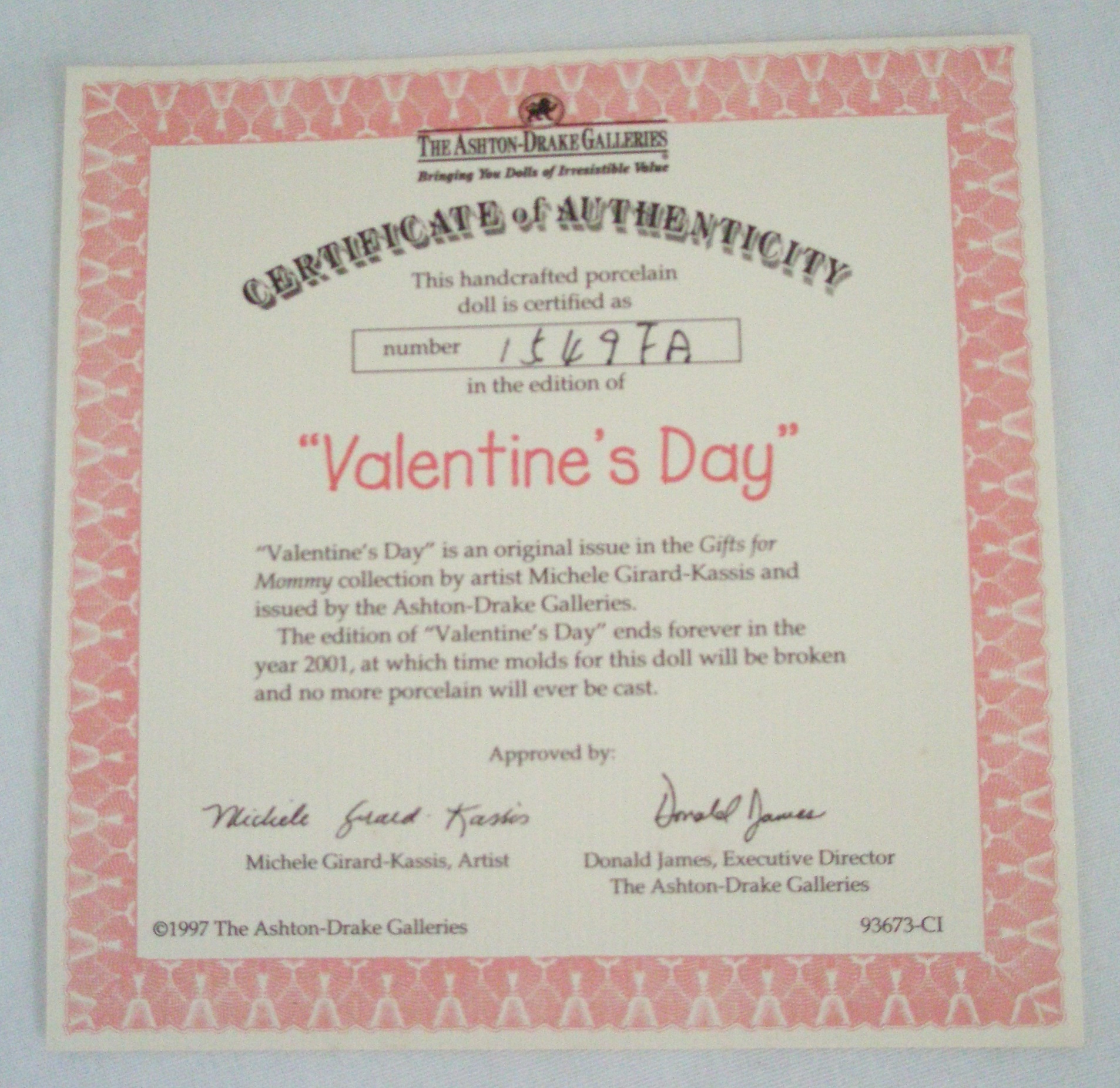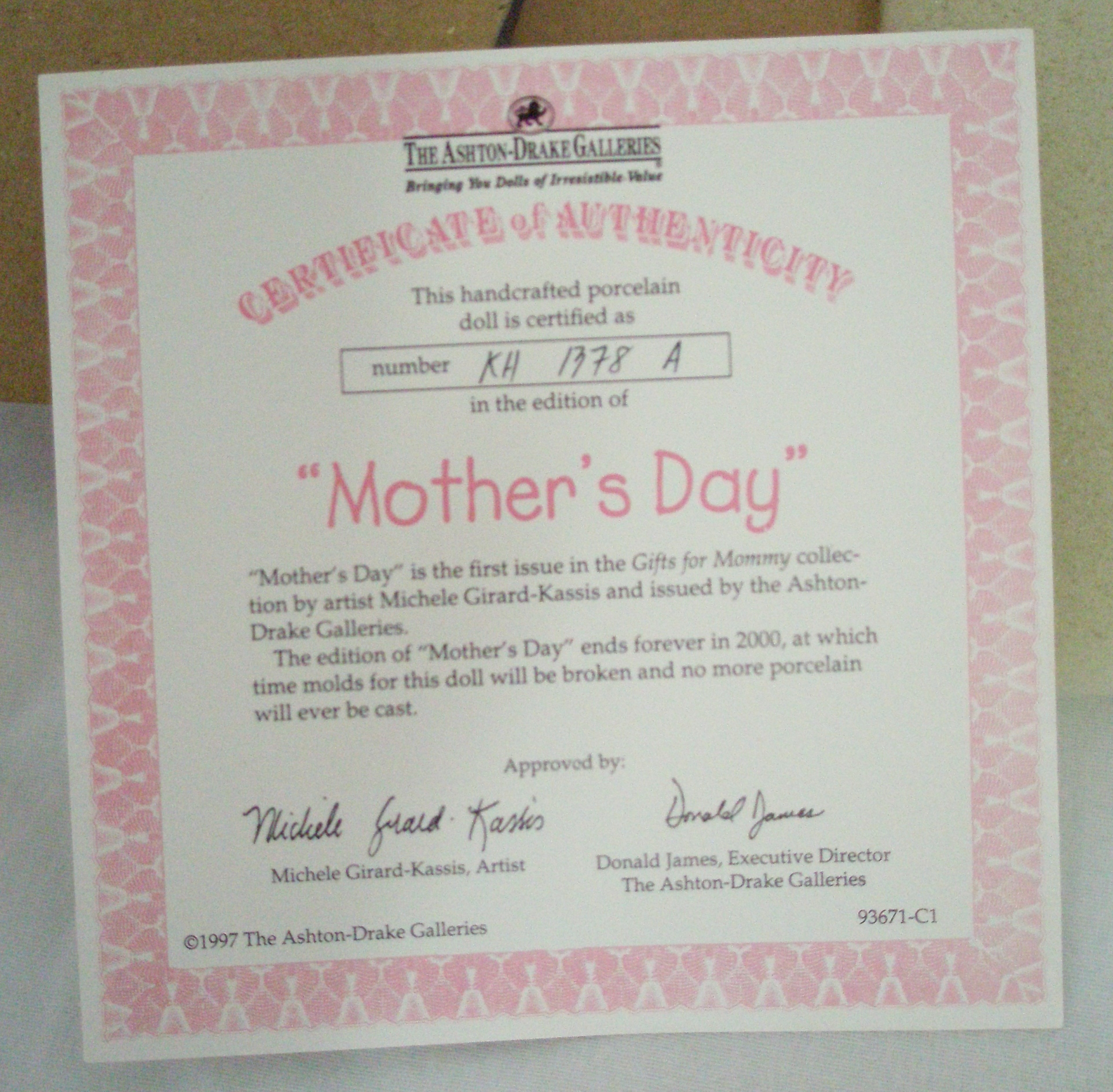 These are porcelain dolls from the artist, Michele Girard-Kassis. Each doll bears the signature of the artist, is individually numbered, and comes with a matching-numbered Certificate of Authenticity. The "Gifts for Mommie" Collection ended in 2000, when the molds were broken forever.