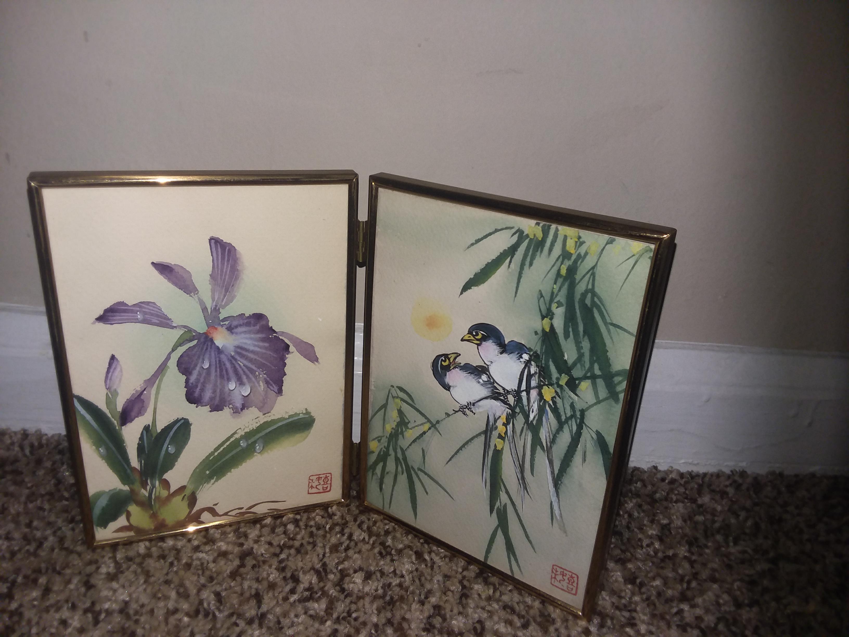 two small 5x7 paintings on construction paper, stamped with an asian mark