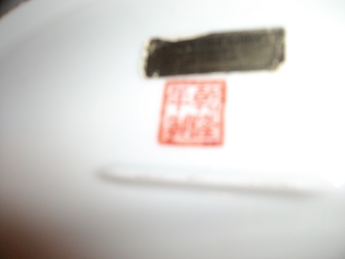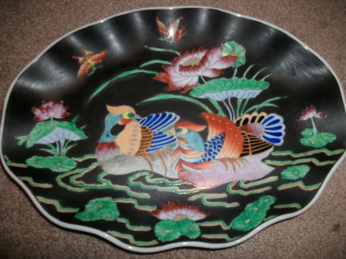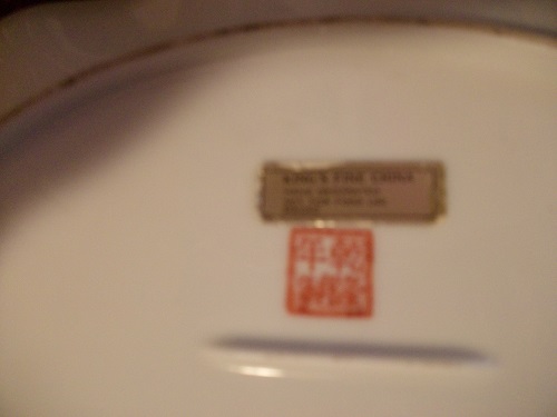 This is a unique platter handpainted in black background with beautiful bright colors on top. The back of it says Kings Fine China. Hand Decorated not for food use. Macao. I have seen other pieces and they are $500 or more but I can not find this actual piece. I think it is the Qianlong Period, I know it is Porcelain, and has 2 Phoenix sitting in water surounded by Roses, I think it is part of the Famille of Roses? not sure though. Anyone know anything about please let me know. It is signed.