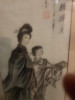 It is a wooden frame with the picture painted on. Asian influenced? A girl praying to a statue set above her and an urn of flowers in front of her.
