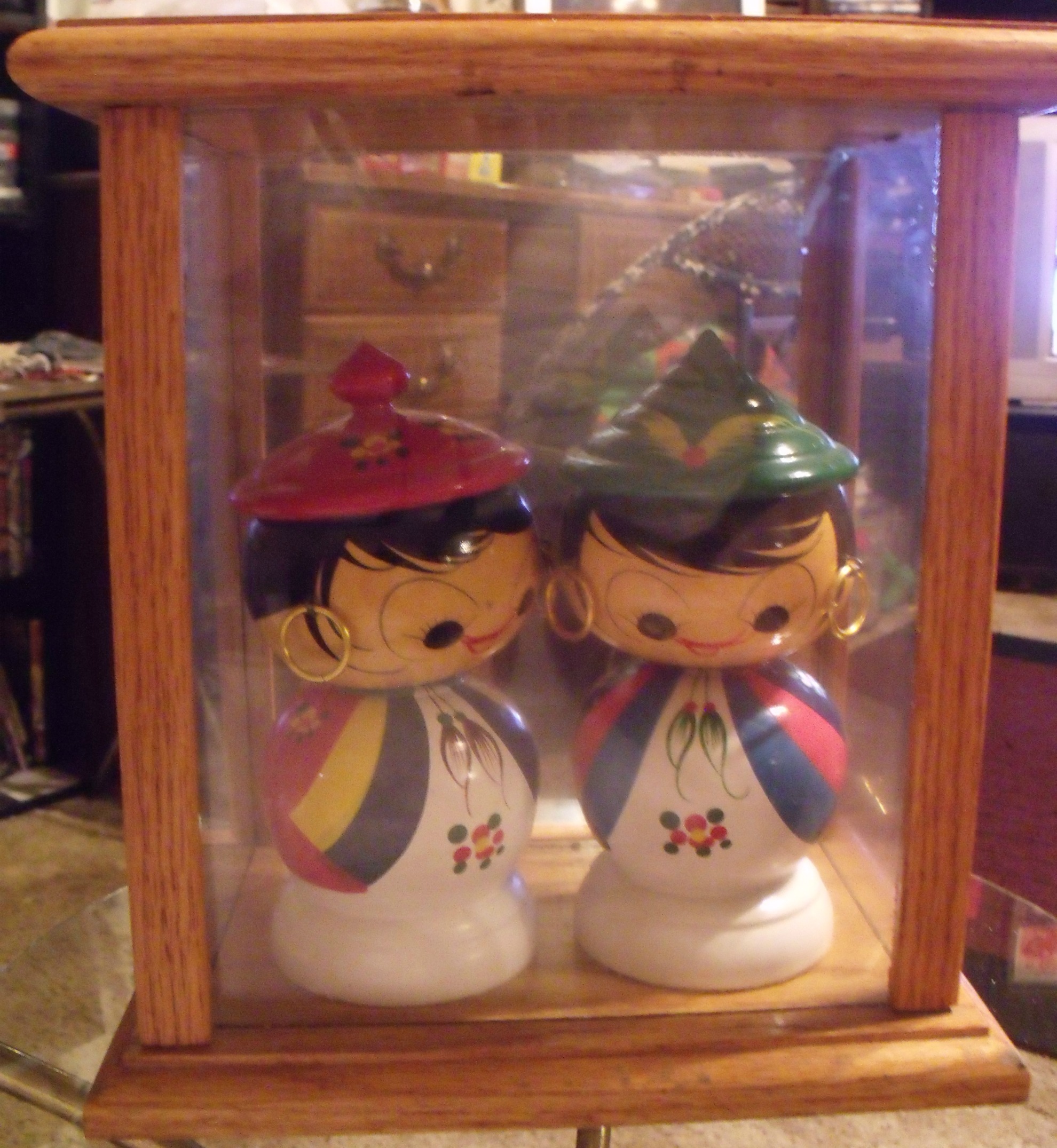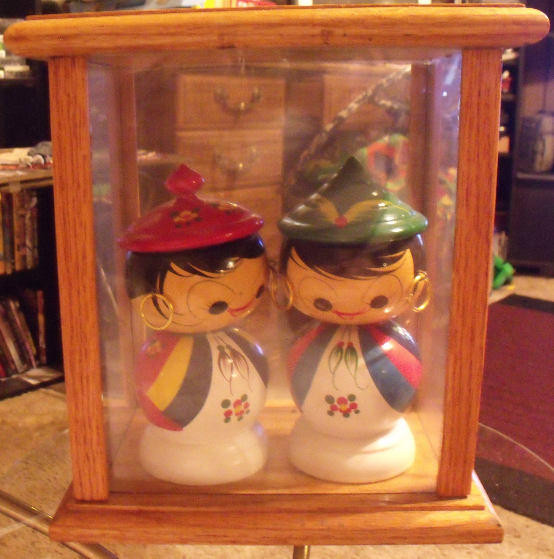 Re: Asian Bobble Head set in glass case