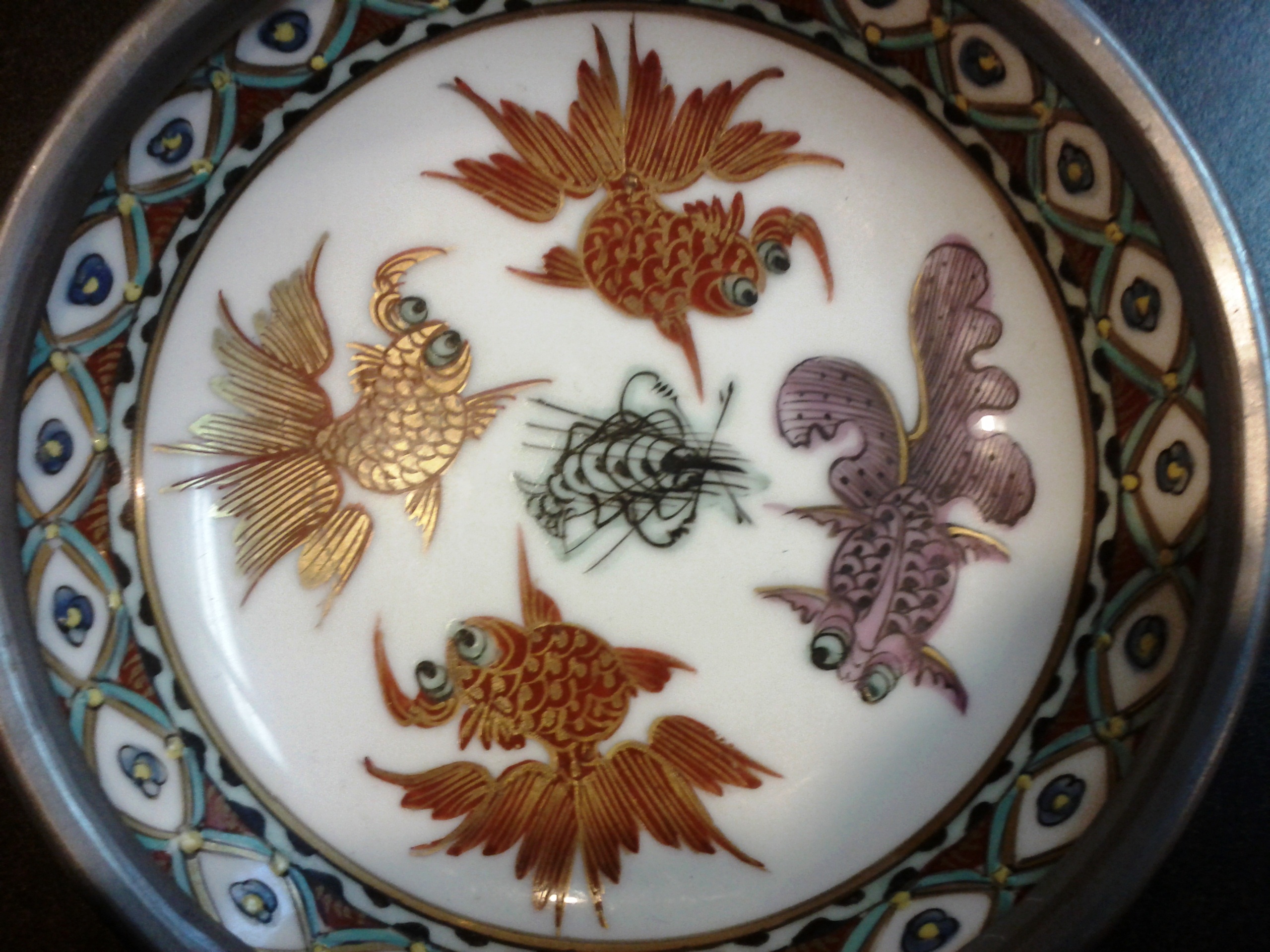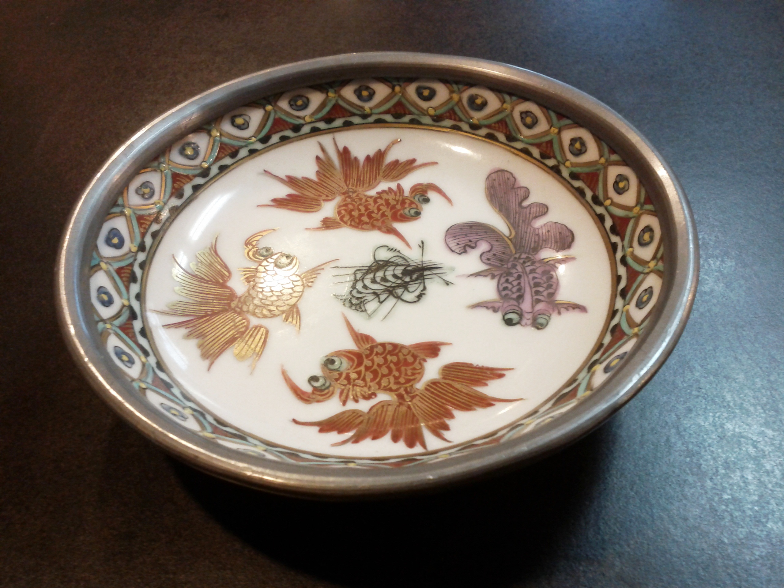 Antique Small Asian Bowl with Fish and Pewter bottom