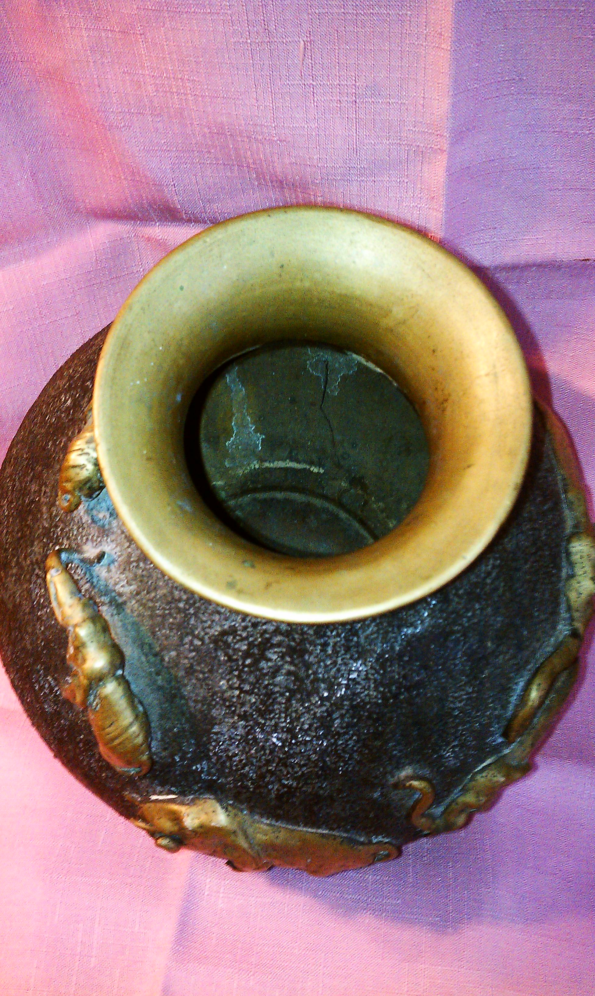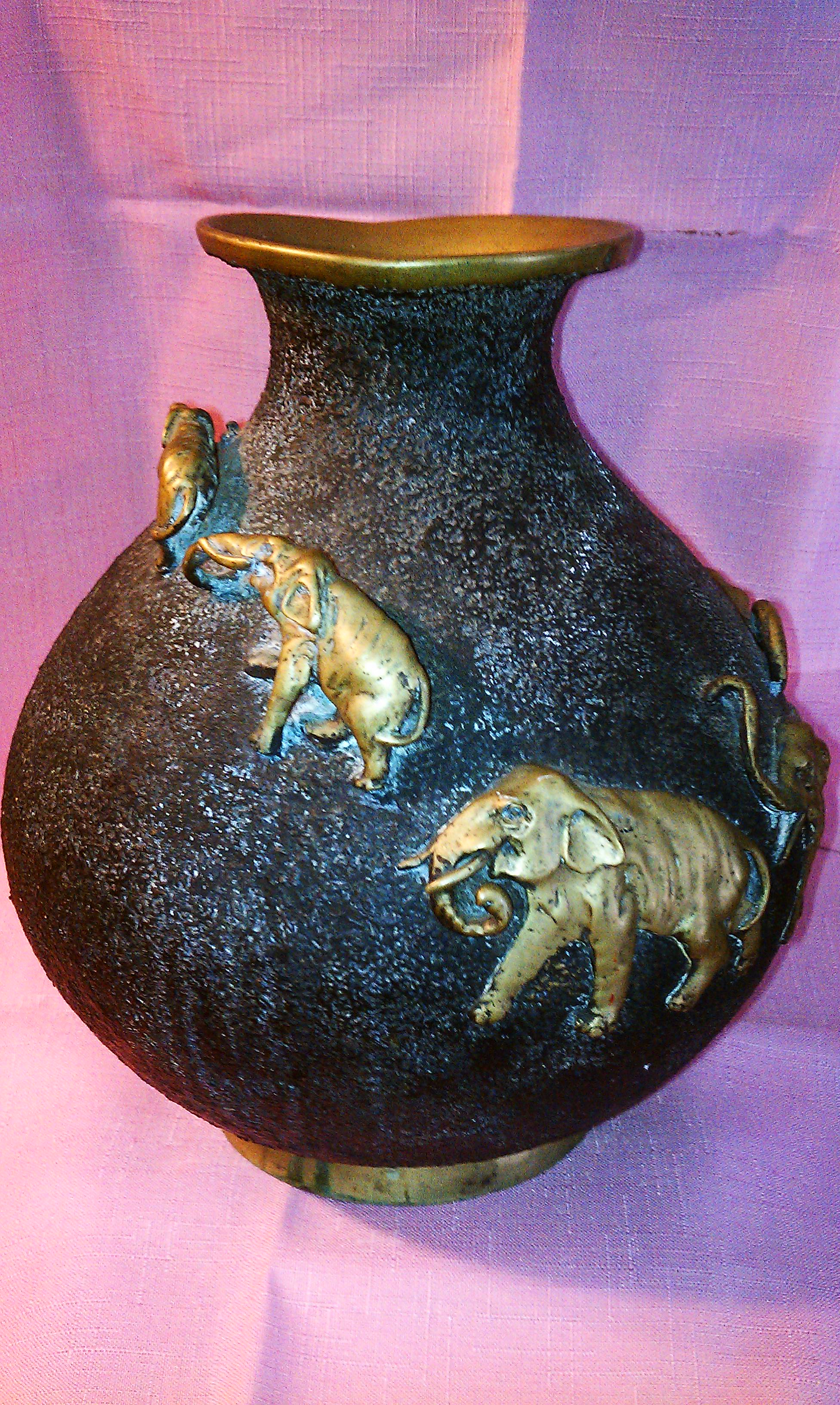 Line of elephants curving around the center of vase made of brass.