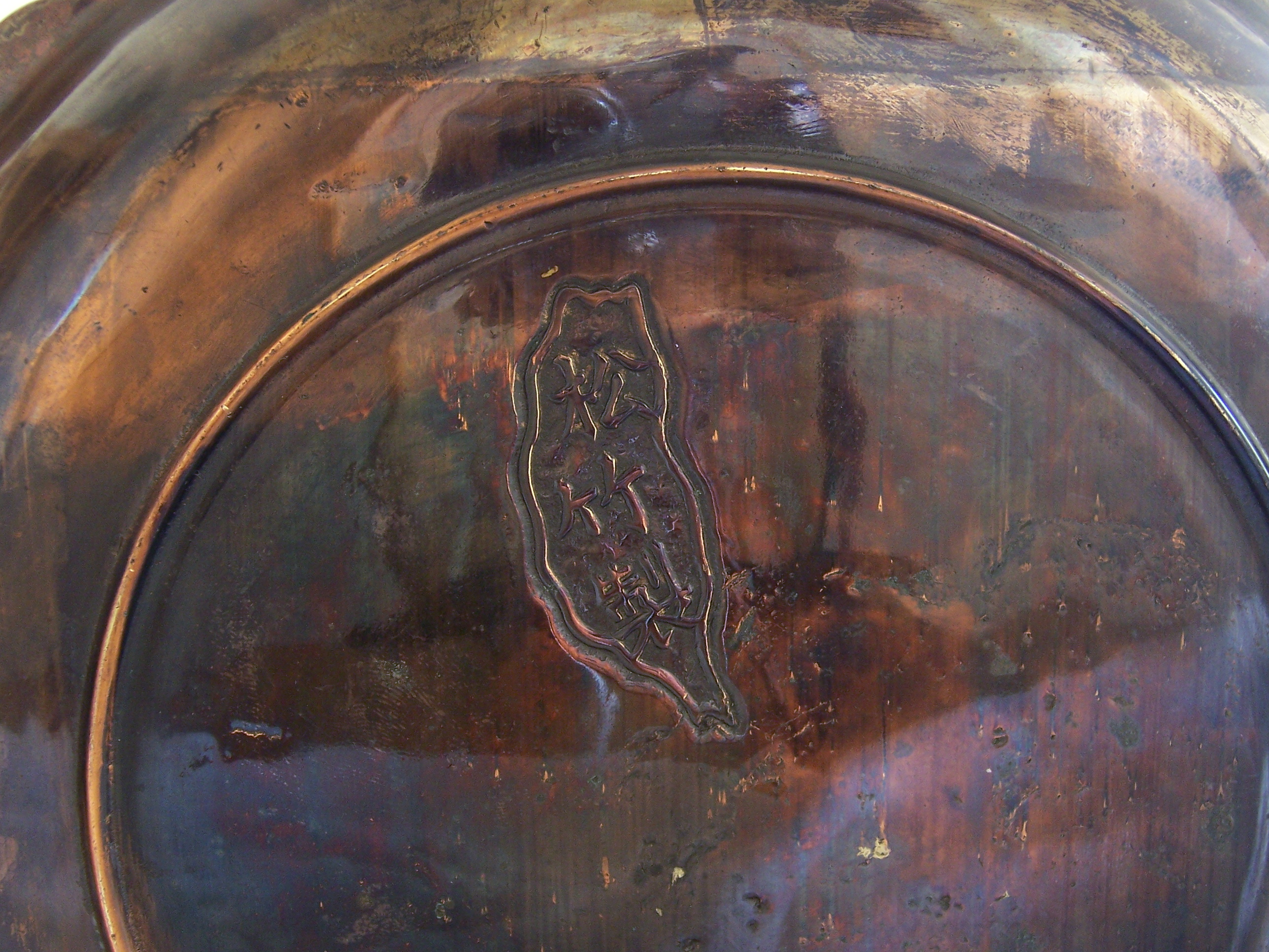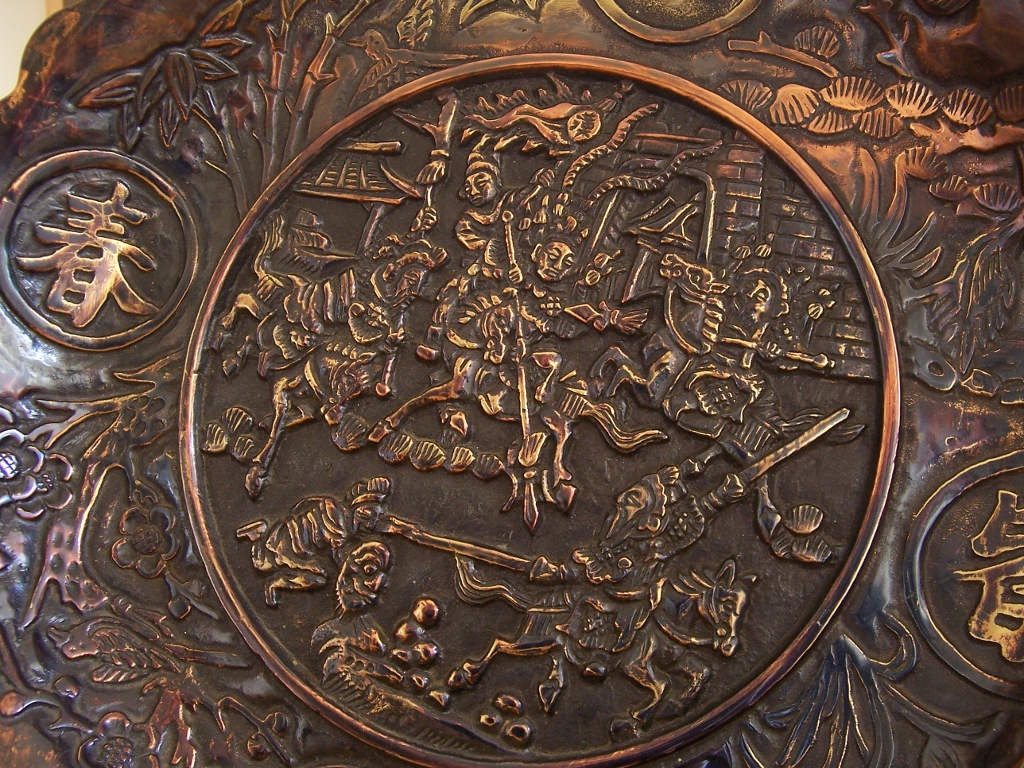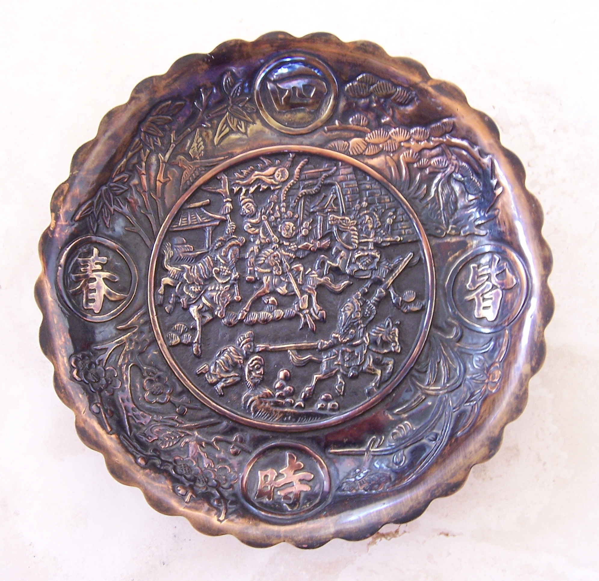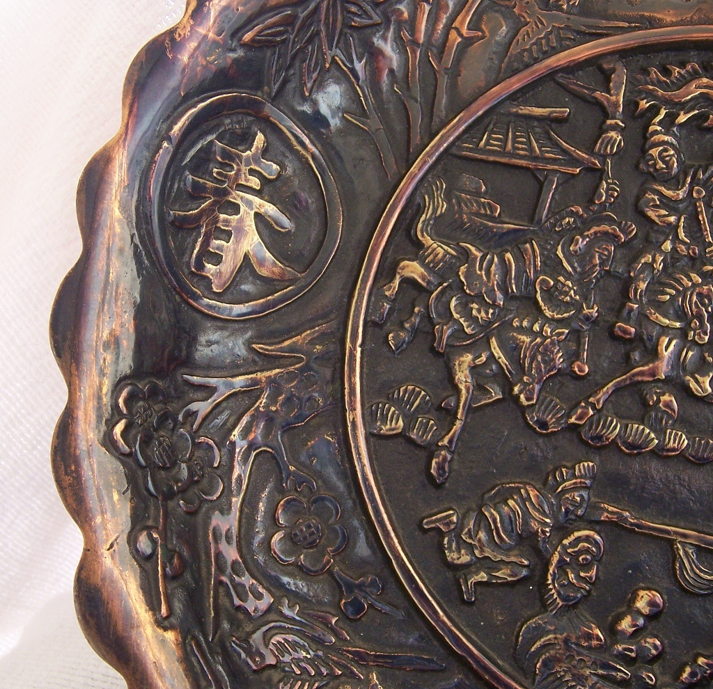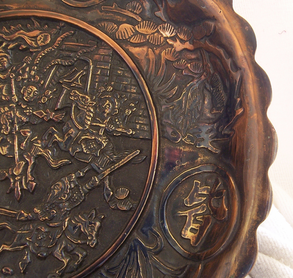 another warrior with a mask. The warriors have highly detailed uniforms with elaborate head pieces and spears and swords. Around the edge of the plate are beautiful decorative scenes displaying birds, flowers and bamboo. There are also four chinese symbols on each of the plates four corners. The plate is scalloped around the edges and is about two inches deep. The plate has different variations of color according to the patina. There is also a stamp on the back of the plate.