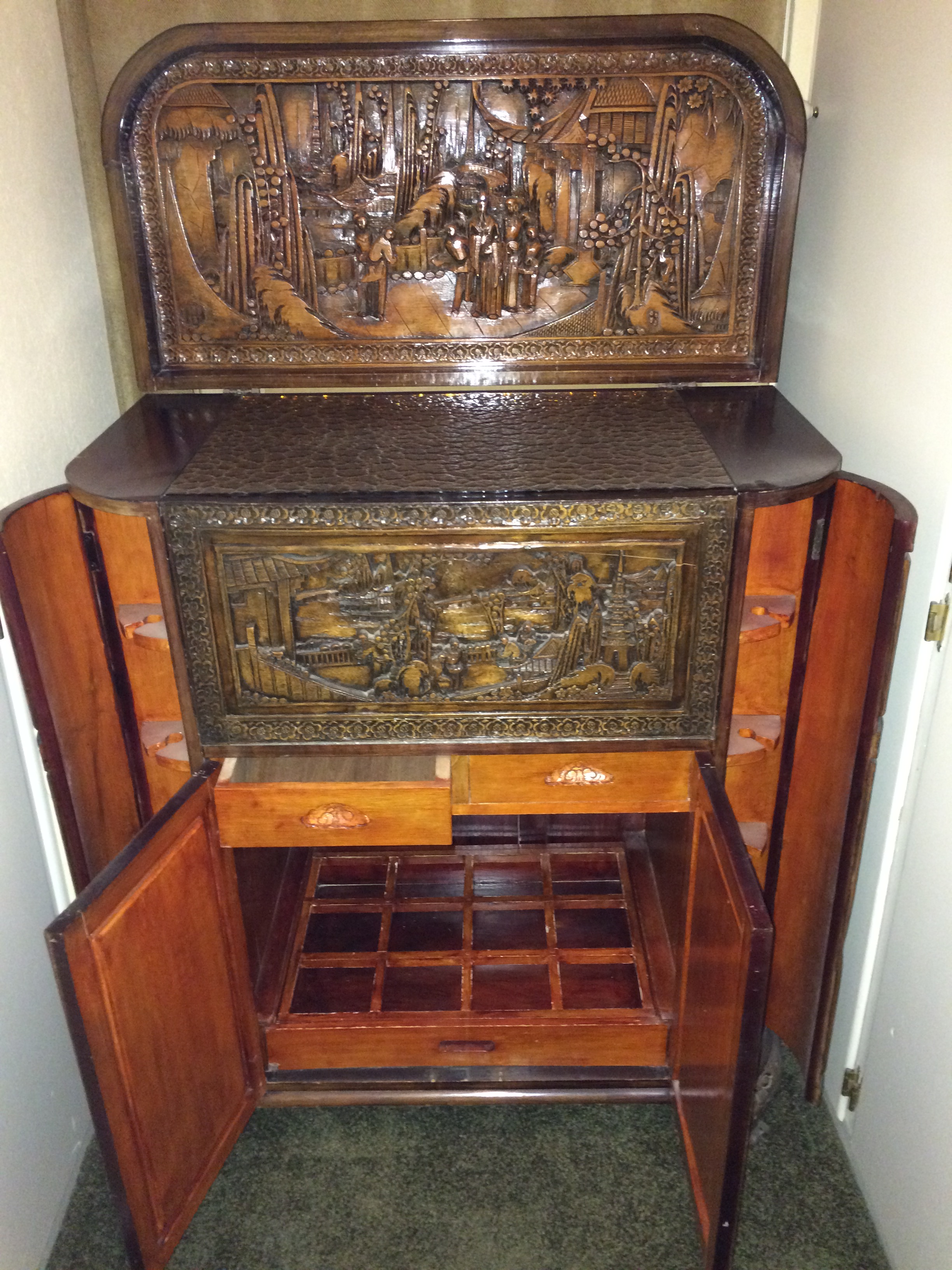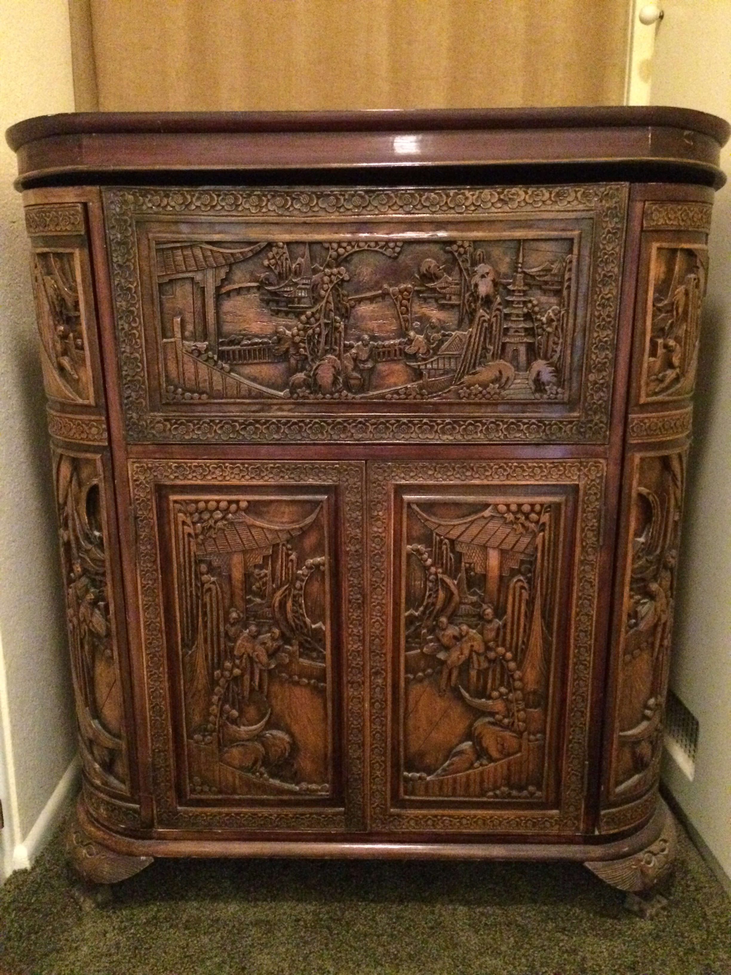 These really are not as old as they look, they were made right into the 1940's. Heavily carved pieces like this are hard to sell in a lot of areas, we pick up comparable examples at auction for less than $300.00 in many cases...this one went for $275.00 https://www.liveauctioneers.com/item/10056875_asian-inspired-lift-top-bar-carved