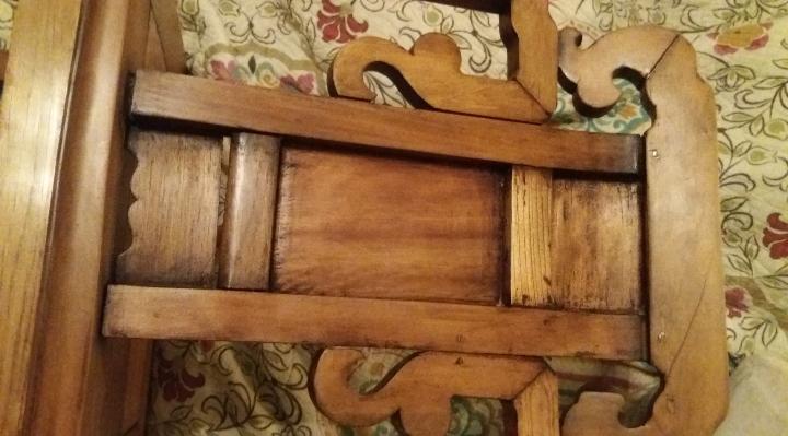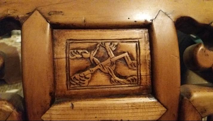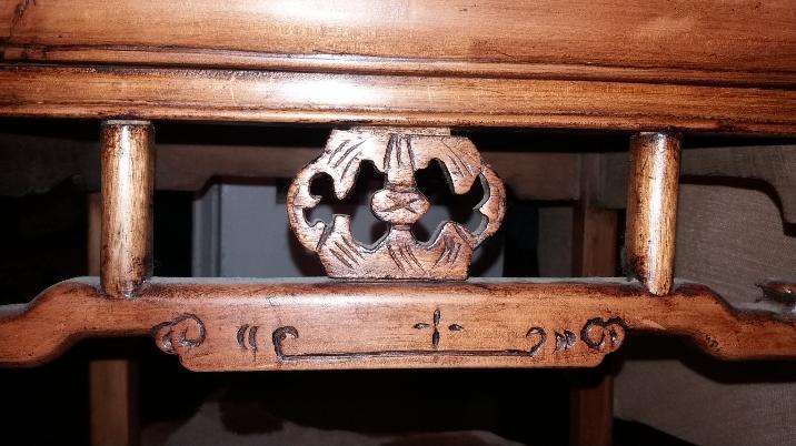 I bought a small wood chair at an estate sale in the New Orleans French Quarter. It has no makers markings , made without nails, and the seat is only 19 inches high and 19 wide. It has strange markings, the main one looks like an abstract dragon to me.