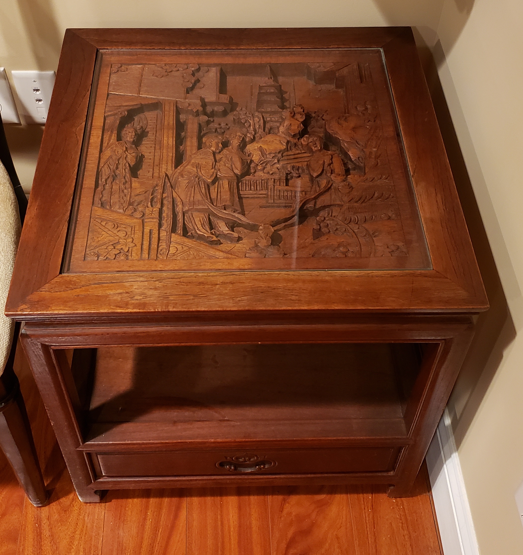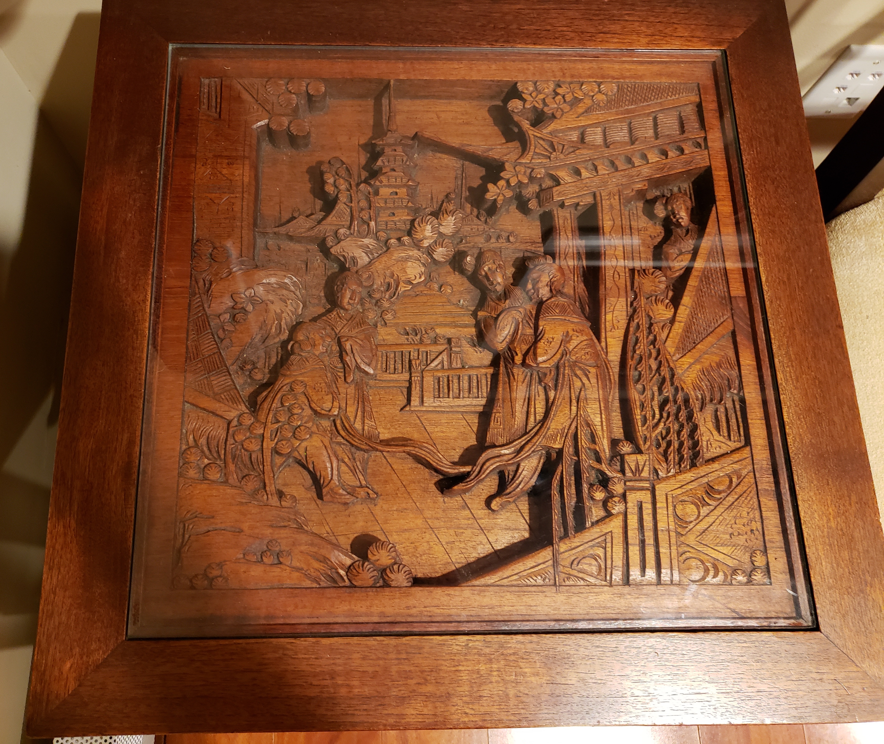Asian coffee table with end tables. Each table face has hand-carved relief depicting pastoral scene. I believe the relief is carved in teak, and possibly the whole table is teak.