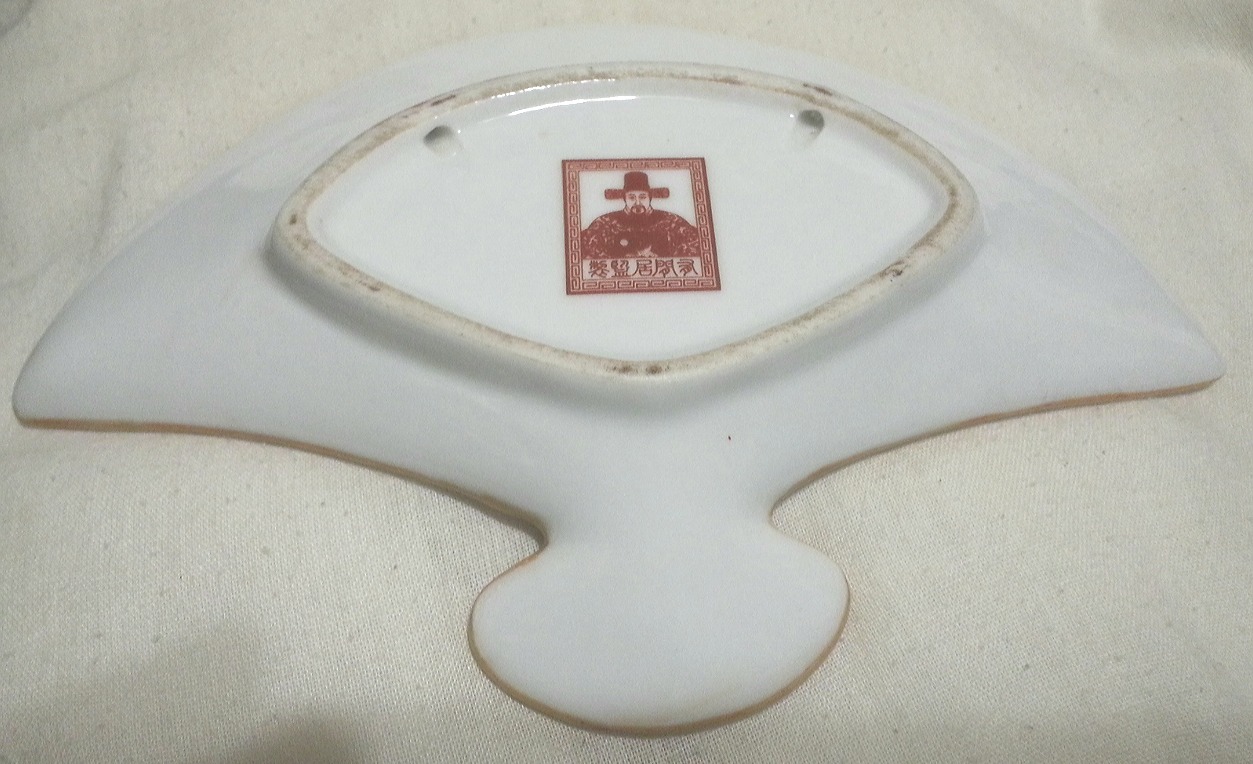 Approximately 6-7 inches at top span of fan and 2-3 inches at bottom/handle span. Is obviously for table/shelf decor. Back side is embossed with an Asian (identifying) signature motif.. of which I am unable to immediately identify, though I DO have many asian friends online, it is simply a matter of when we might be online at same time or catching them online. The front/top side of fan is designed in a manner that there are numerous images separated in a way that the "sections" are equal and mirror each other in shape and size, however, thw images do not all mirror each other from side to side. The images vary per section, with two Dragon's being the largest and centered image of the piece. A couple of smaller flowering and patterned sections DO mirror each other from side to side. There is an image of floral and patterned design in one section and then a bird and flower in another section. The Motif signature on the back appears to be Chinese by the writing and imagery. Any help with identifying this would be greatly appreciated. Possibly not that old yet still would like to identify the embossing. .