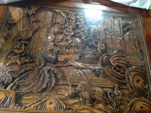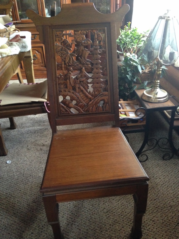 Asian hand carved dining room table with 2 leafs and 6 chairs(2 arm chairs). My father bought this table from Thailand (I think) around 35 + years ago. Both leaf's also have deep handcarved pictures.