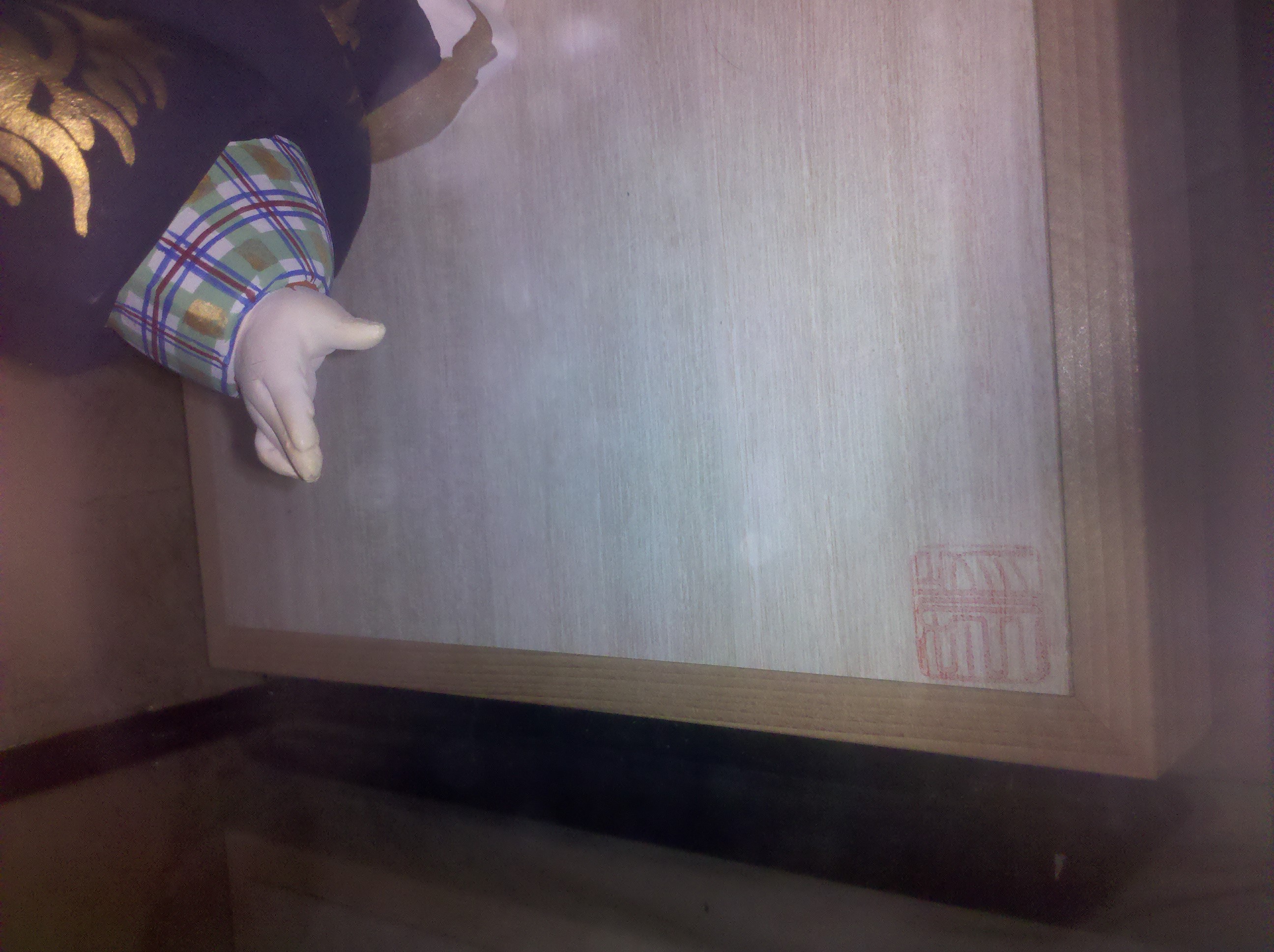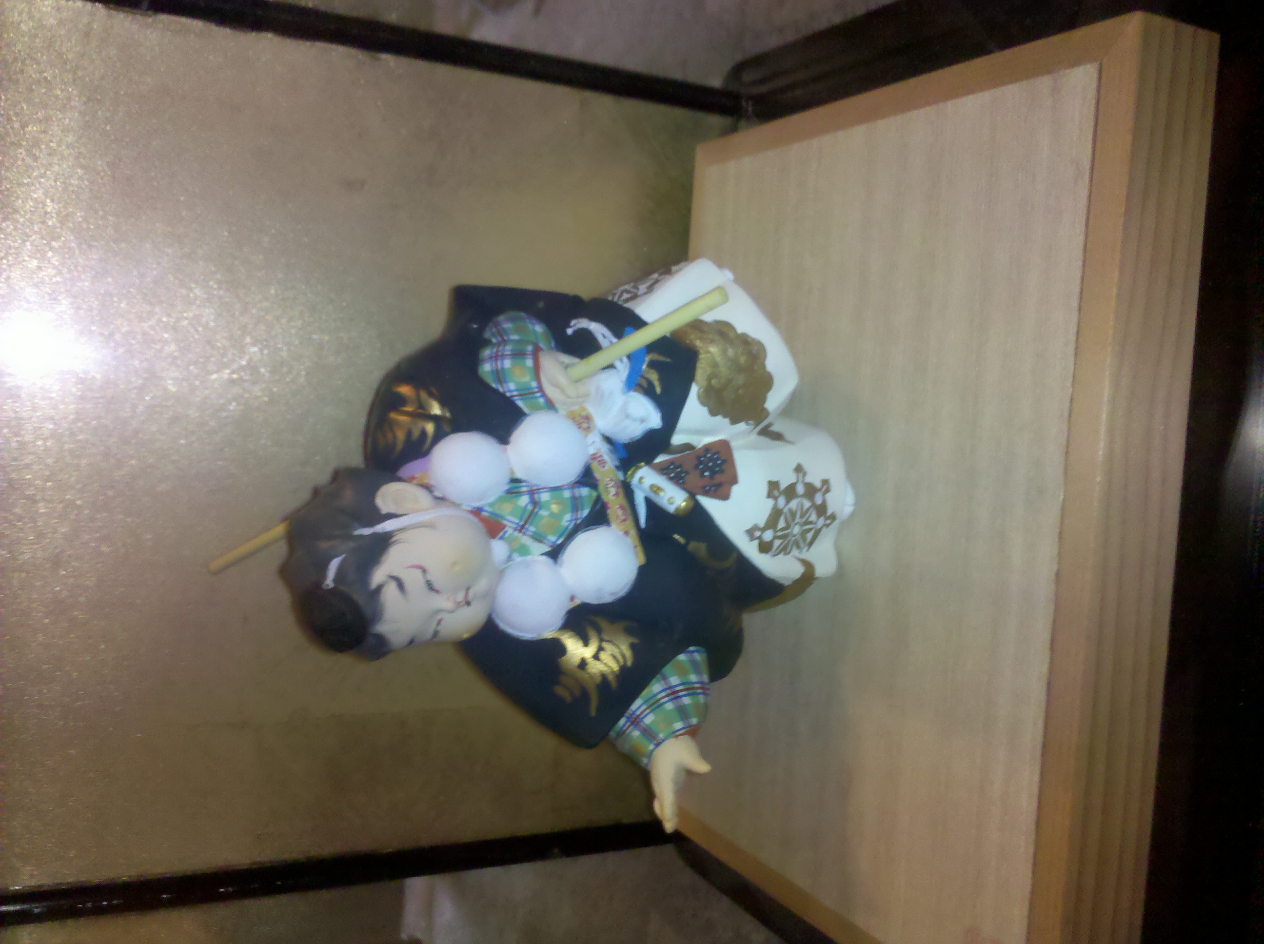 The doll has beautiful characters and drawings in gold along the robes of the clothing. Whether or not this is real gold, I am unsure. I have read online that some of these dolls have real gold painted on the clothing. The doll and its clothes are all ceramic or porcelain, from my best assumption. He is holding a wooden staff/sword. See pictures for better understanding.