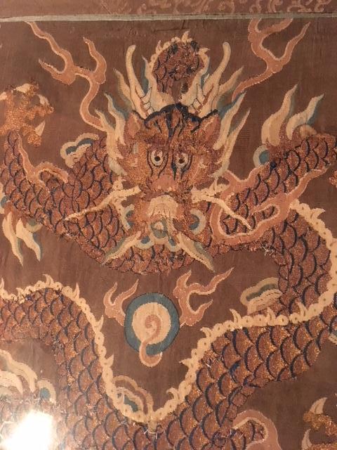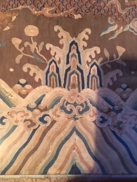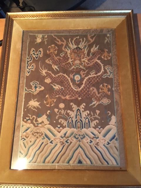 I am hoping someone can help me shed some light on this beautiful embroidered picture I inherited from my grandmother. This picture is about 18" high, 13" wide, with the frame 3" larger than that around it. It is clearly a very old silk base, very fine weave, and the dragon is composed of predominantly metallic gold and blue silk thread. The other portions of the image are shades of warm gray and blue. My grandparents' family travelled extensively in China and Japan from the 1870's on, but I believe this image was purchased by my grandmother in the 1950's or 1960's from the gallery stamped on the back of the paper on the frame, marked 'Dorothy Jones' Studio, 4100 Crenshaw Blvd., Los Angeles, CA. Axminster 3-1011.