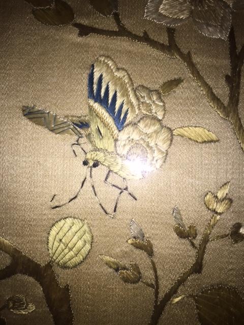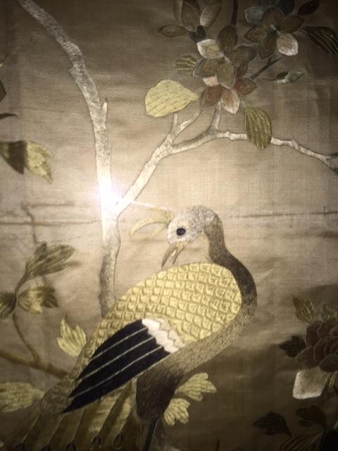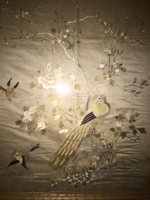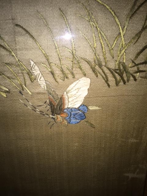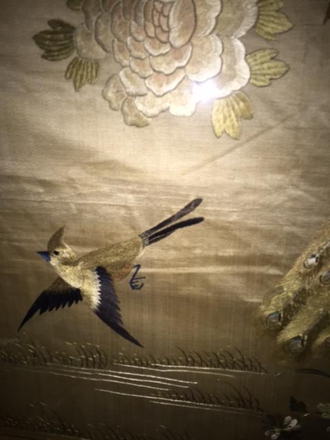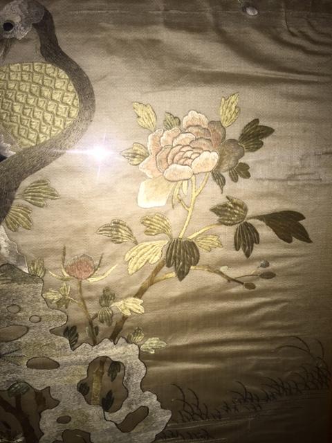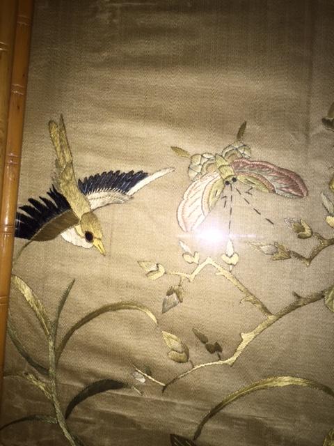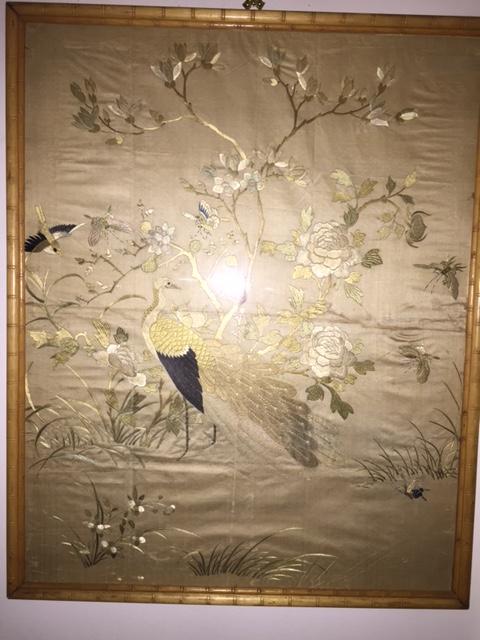 I purchased these two pieces several years ago at a small antique shop that specializes in estate sales. I love to collect asian art and these two caught my eye immediately. I believe they are Chinese and I think they are on silk; I'm trying to determine the time period as well as the type of embroidery and their value. The embroidery is exquisite as you can see in the close-ups. There are no signatures that I can find. Each one is 36" x 29" and they came to me framed in this bamboo-like patterned frame. Nothing is written on the back, but I have not taken them out of the frames.