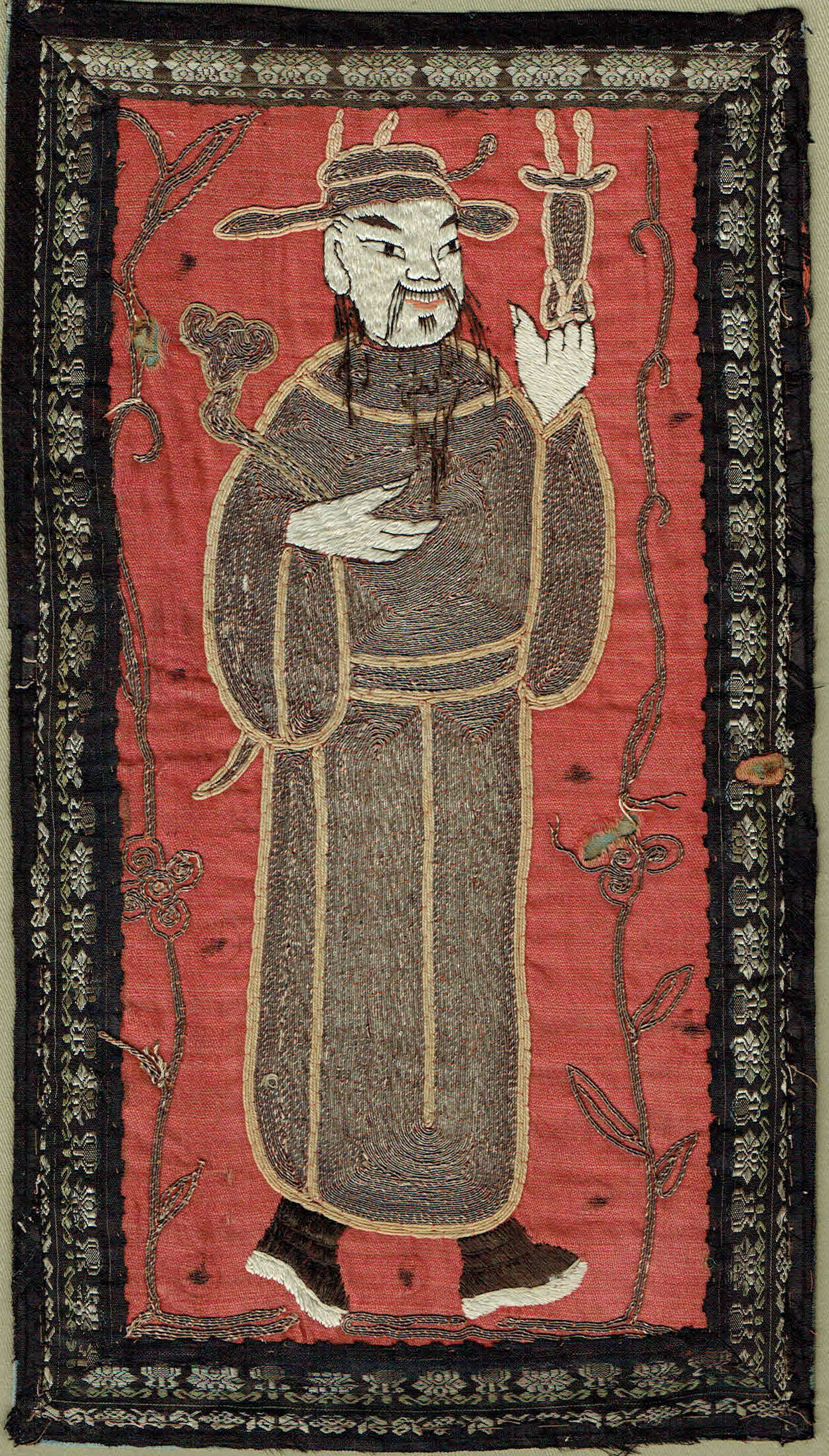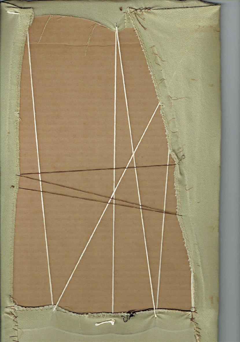 Asian fabric panel stiched to backing. Not sure of materials or history. Was told it was purchased in the USA about 30 years ago and mounted then for home display.