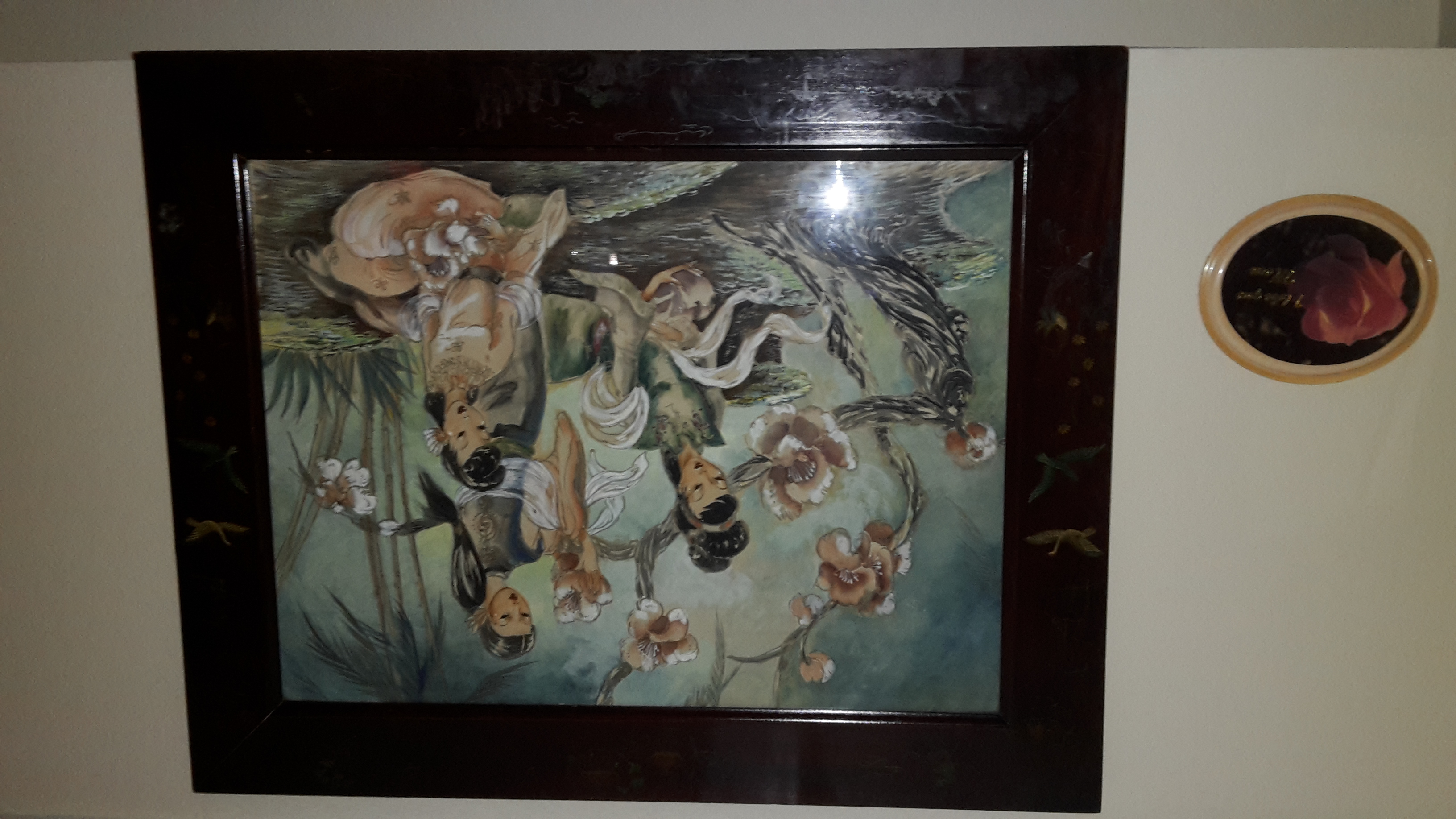 Description Portrait of three geisha like Asian women sitting around a bed of flowers, frame looks to be Cherrywood with fine art drawn on the frame, pictures of beautiful exotic birds.