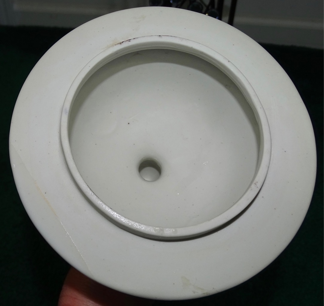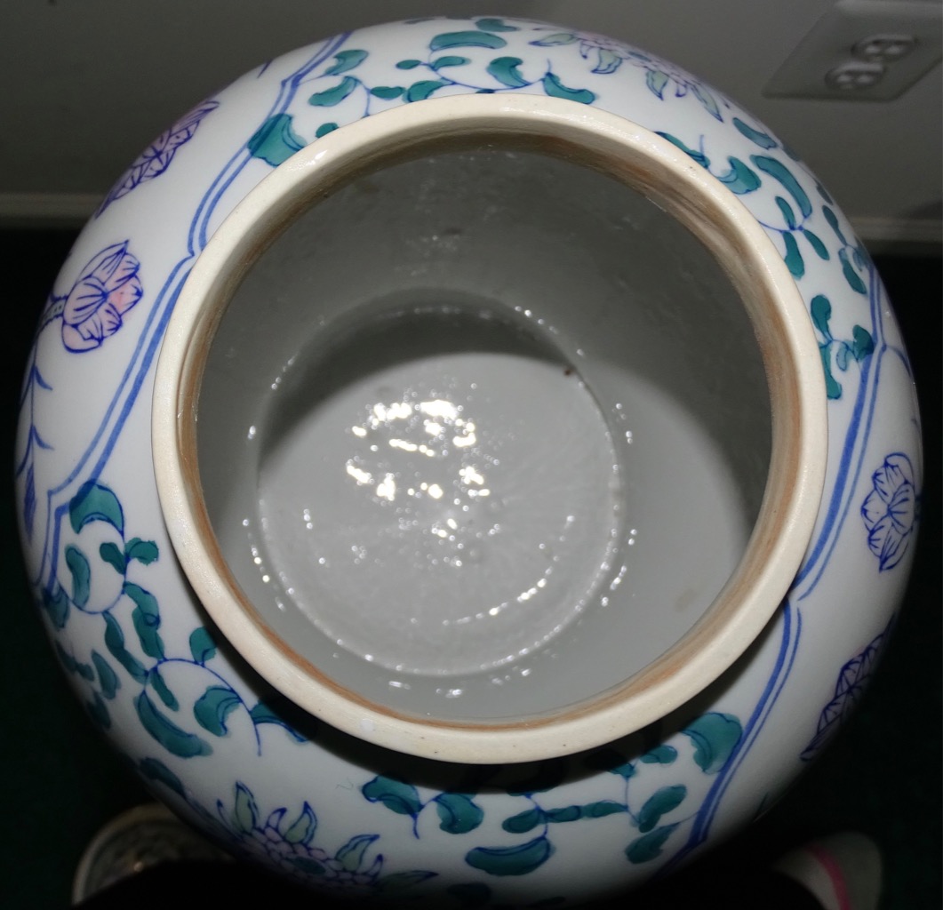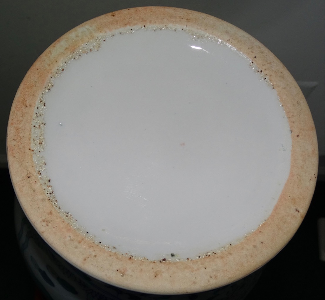 Inside the jar the first 1/3 is not glazed. There is glazing the outside of the jar. The bottom outside edge 1/2" is a darker light tan color with sand grains embeded into the glaze. The inside of the lid is not glazed as well as the ouside lip where the lid sits. The inside of the top lip has a reddish clay color. The jar is not signed nor stamped.