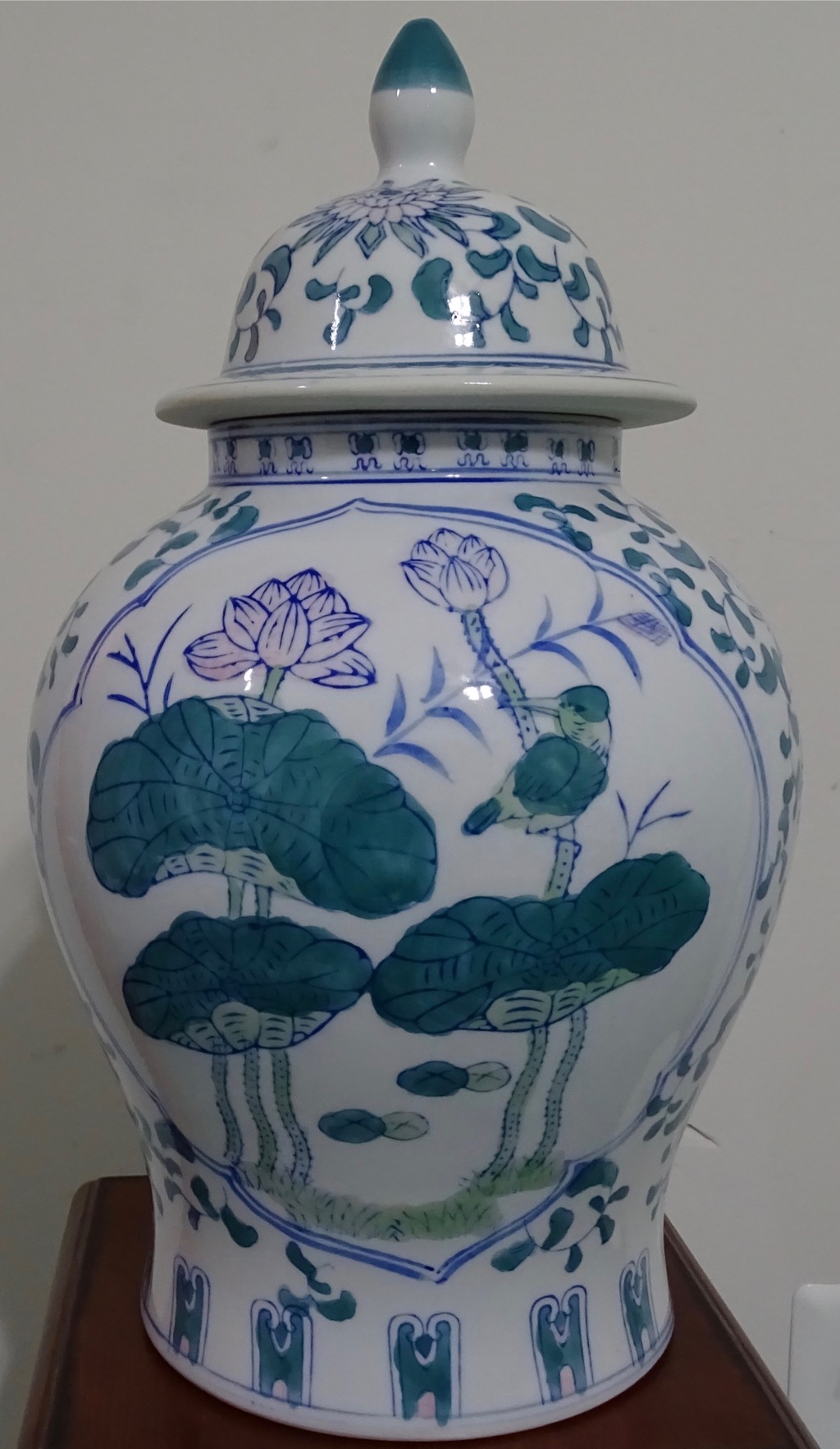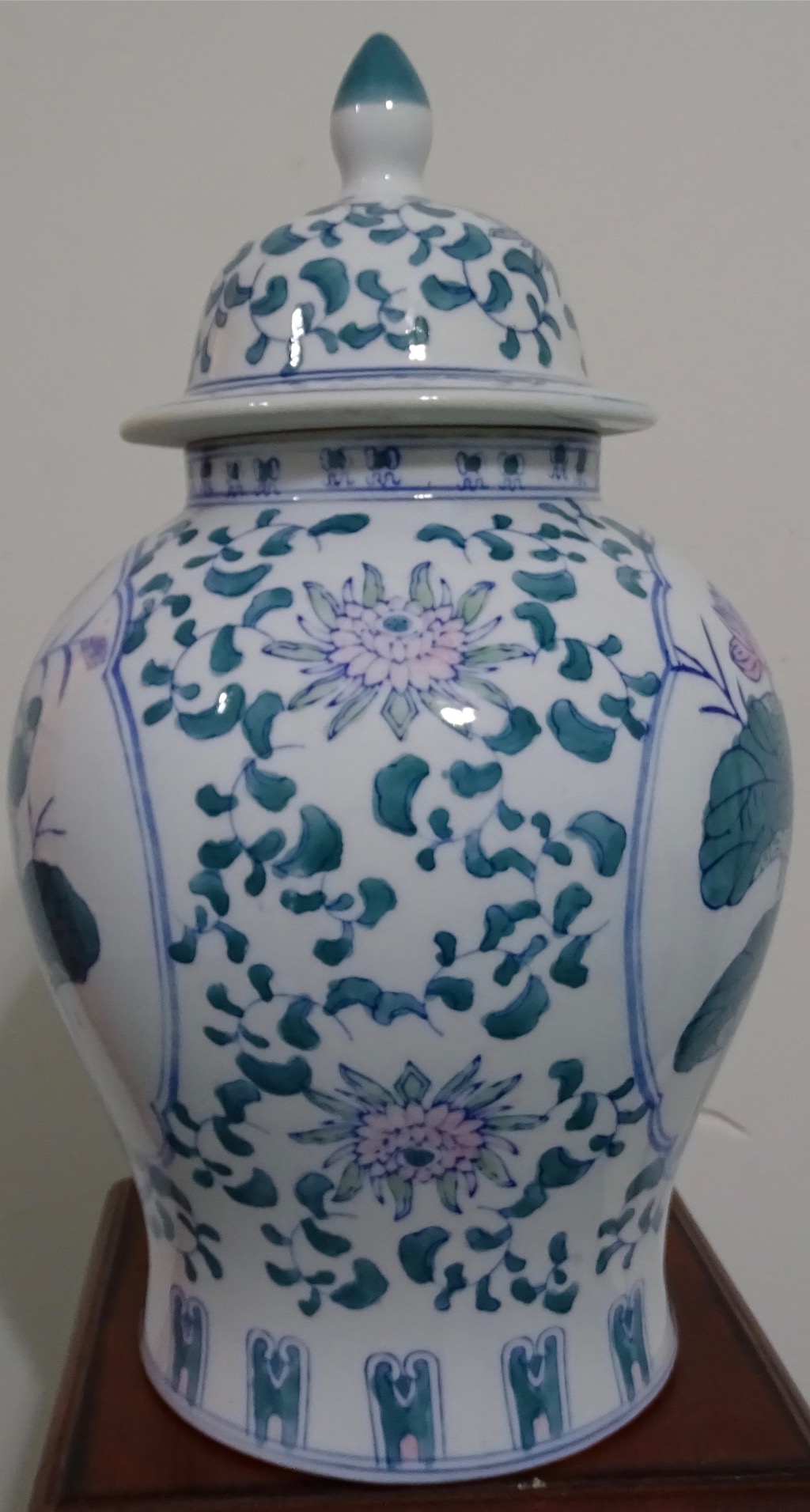 Ginger Jar that stands 15.5" with lid on. It weighs 4 lb, 14.6oz. It has a teal green bird with some teal colored decorations and flowers. Also has pink flowers and blue decorations.