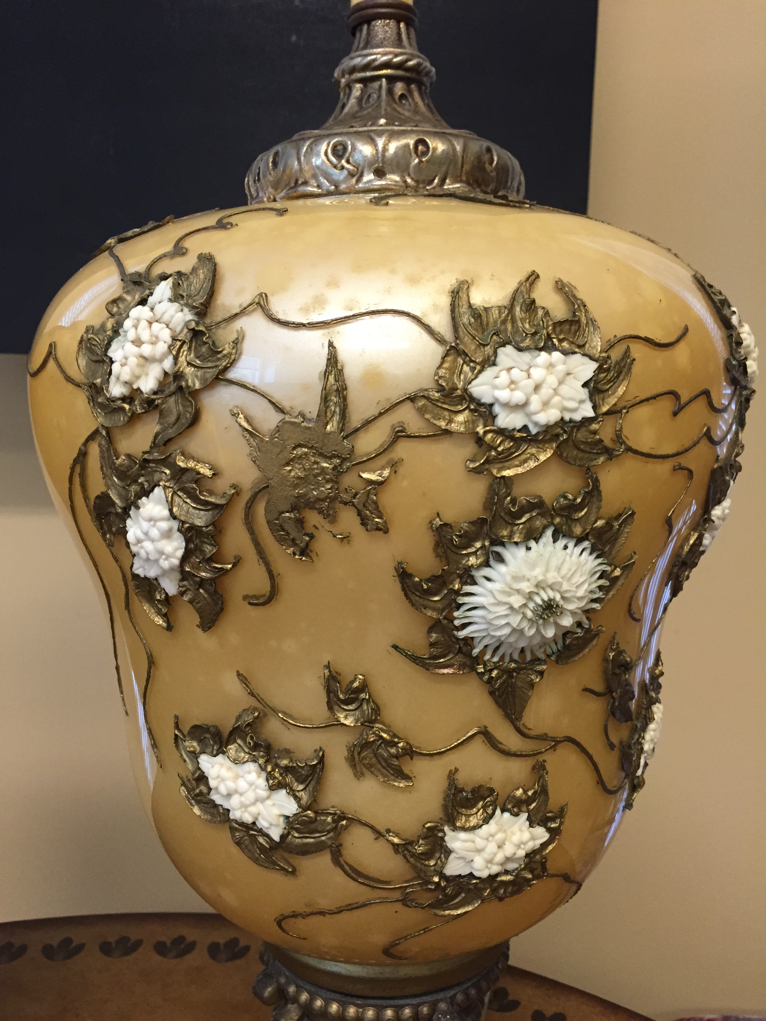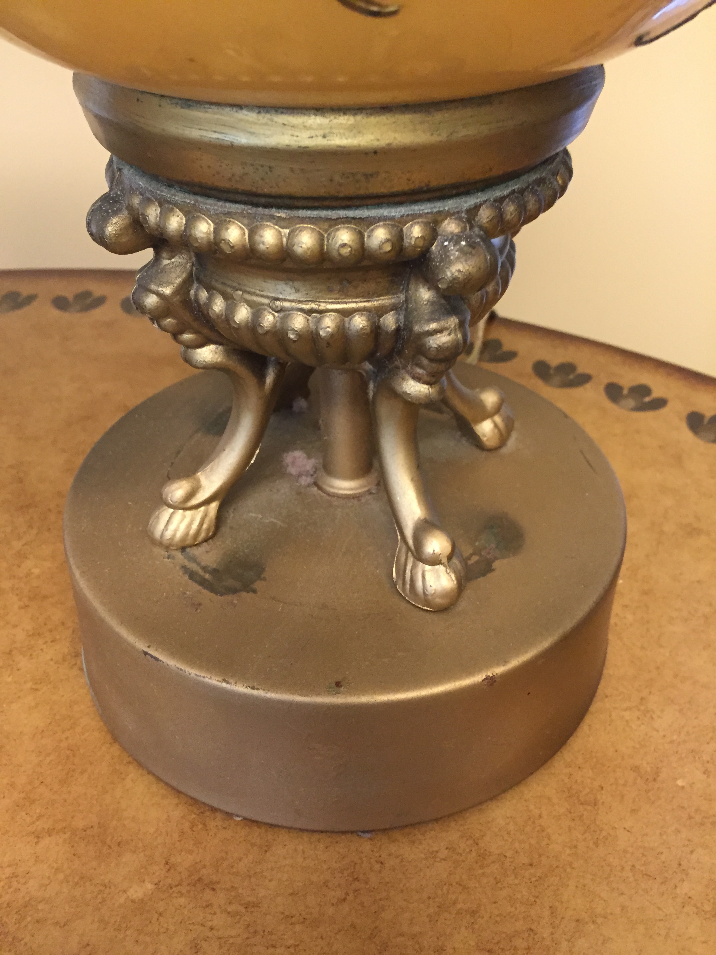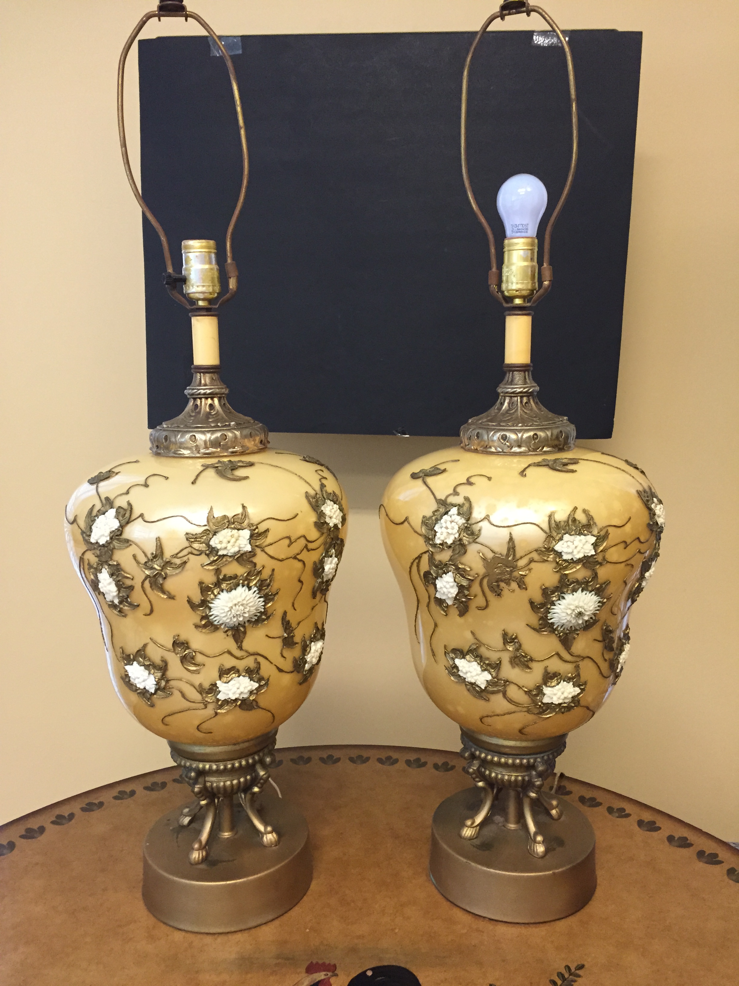 I bought a set of Yelow Glass Asian appearing lamps. They hav raised meawork and porcelain type decor on the lamps. THe cords and plugs appear to be from th 40s-60s They stand 35" tall and have a 7" Brass (?) base with four feet. The tops also appear brass